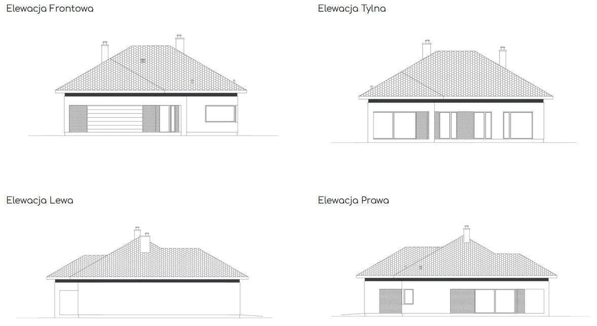 Budynek charakteryzuje się zwartą bryłą. Elewację domu prezentujemy w kolorze białym przełamaną wstawkami z cegły.