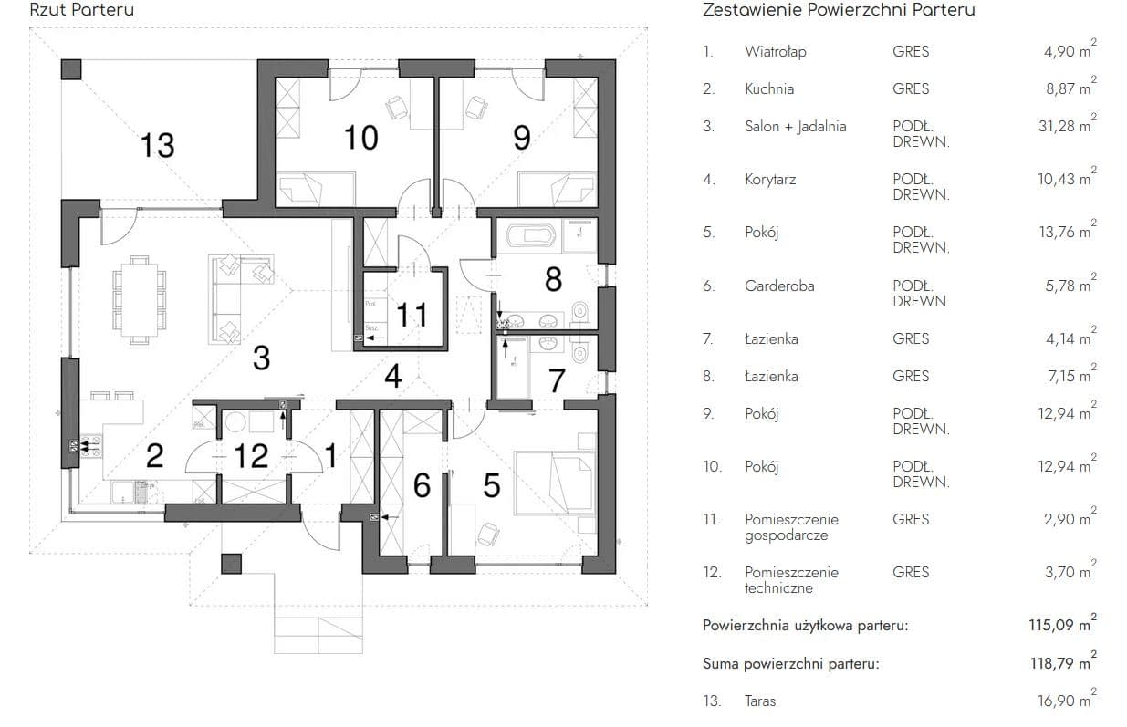 Zadaszone wejście od frontu prowadzi do przytulnego wiatrołapu, wyposażonego w praktyczną zabudowę do przechowywania. Stąd przechodzimy do przestronnej strefy dziennej, w której salon oferuje miejsce na wygodny narożnik, przestronny stół jadalniany oraz ścianę przeznaczoną na telewizor. Z salonu można również wyjść na zadaszony taras, idealny do relaksu na świeżym powietrzu. Kuchnia, otwarta na część dzienną, została zaprojektowana z myślą o funkcjonalności i posiada dodatkowe wejście z wiatrołapu przez pomieszczenie techniczne.