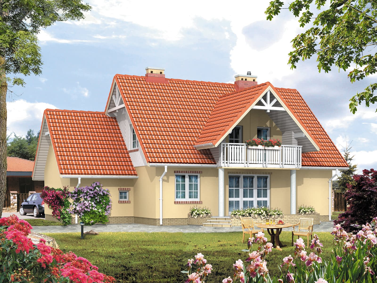 Ściany: 2-warstwowe - pustak ceramiczny + styropian, Stropy: żelbetowe, wylewane, Dach: dachówka ceramiczna CREATON,Rzuty