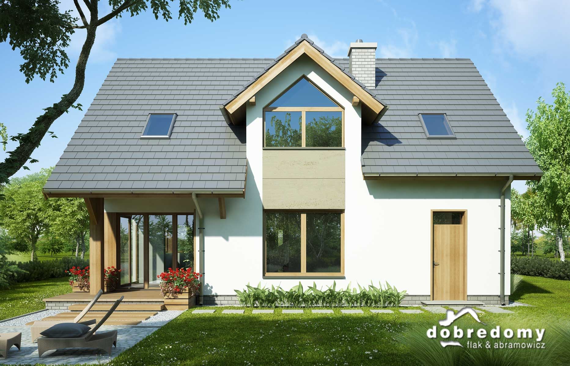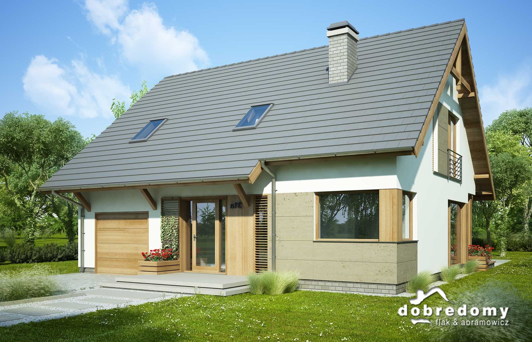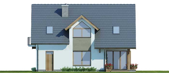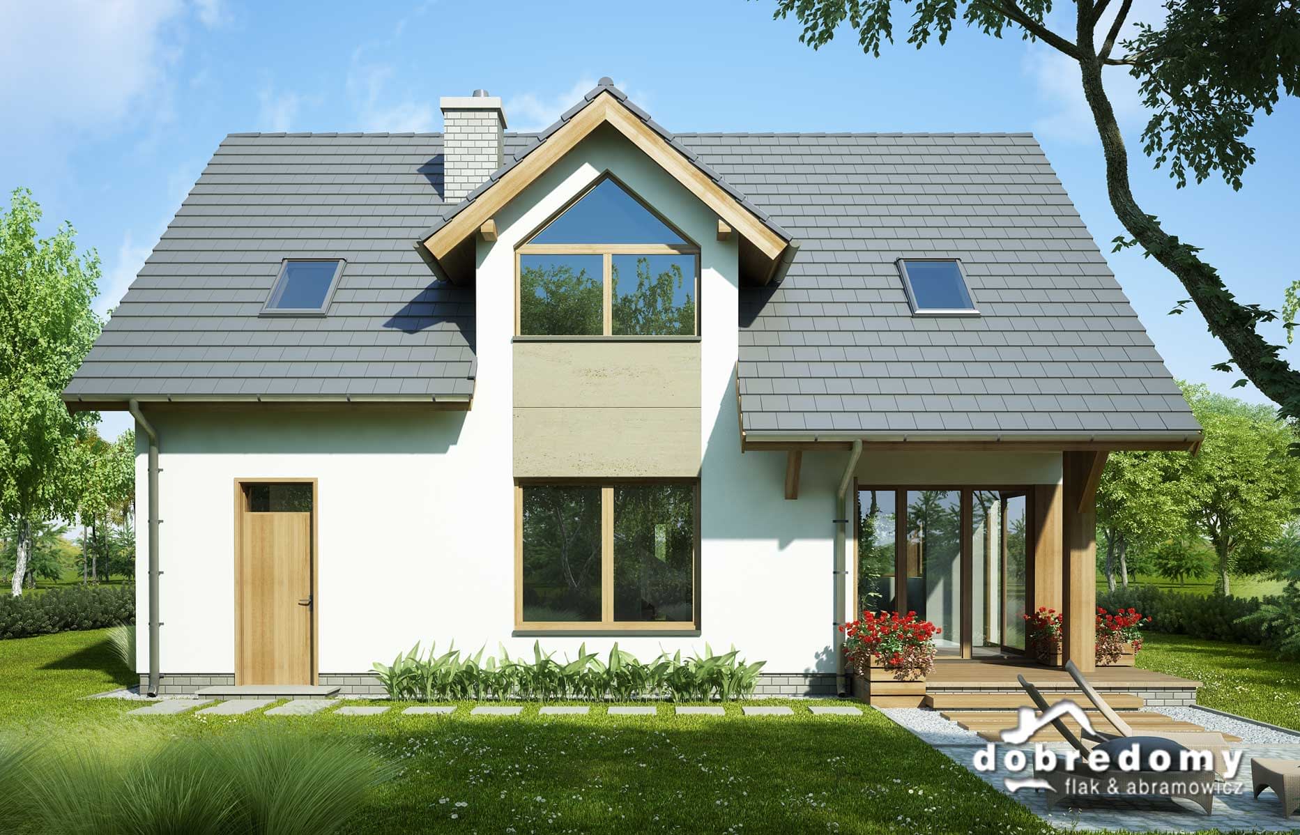 Dom z poddaszem użytkowym, niepodpiwniczony, przeznaczony dla 4-5 osobowej rodziny. Na parterze znajduje się część dzienna z obszernym salonem połączonym z jadalnią i bezpośrednim dostępem do kuchni oraz część gospodarcza z garażem jednostanowiskowym i pomieszczeniem gospodarczym. Na poddaszu zlokalizowano część nocną z sypialniami, ogólnodostępną łazienką, pralnią oraz sypialnię rodziców z garderobą. Projekt dostępny w wersji z lukarną - Elena.