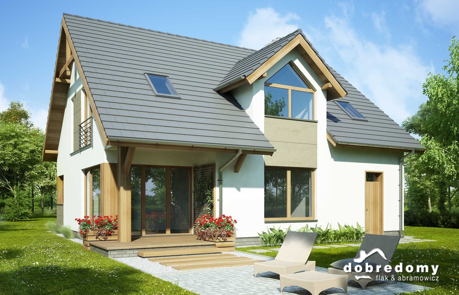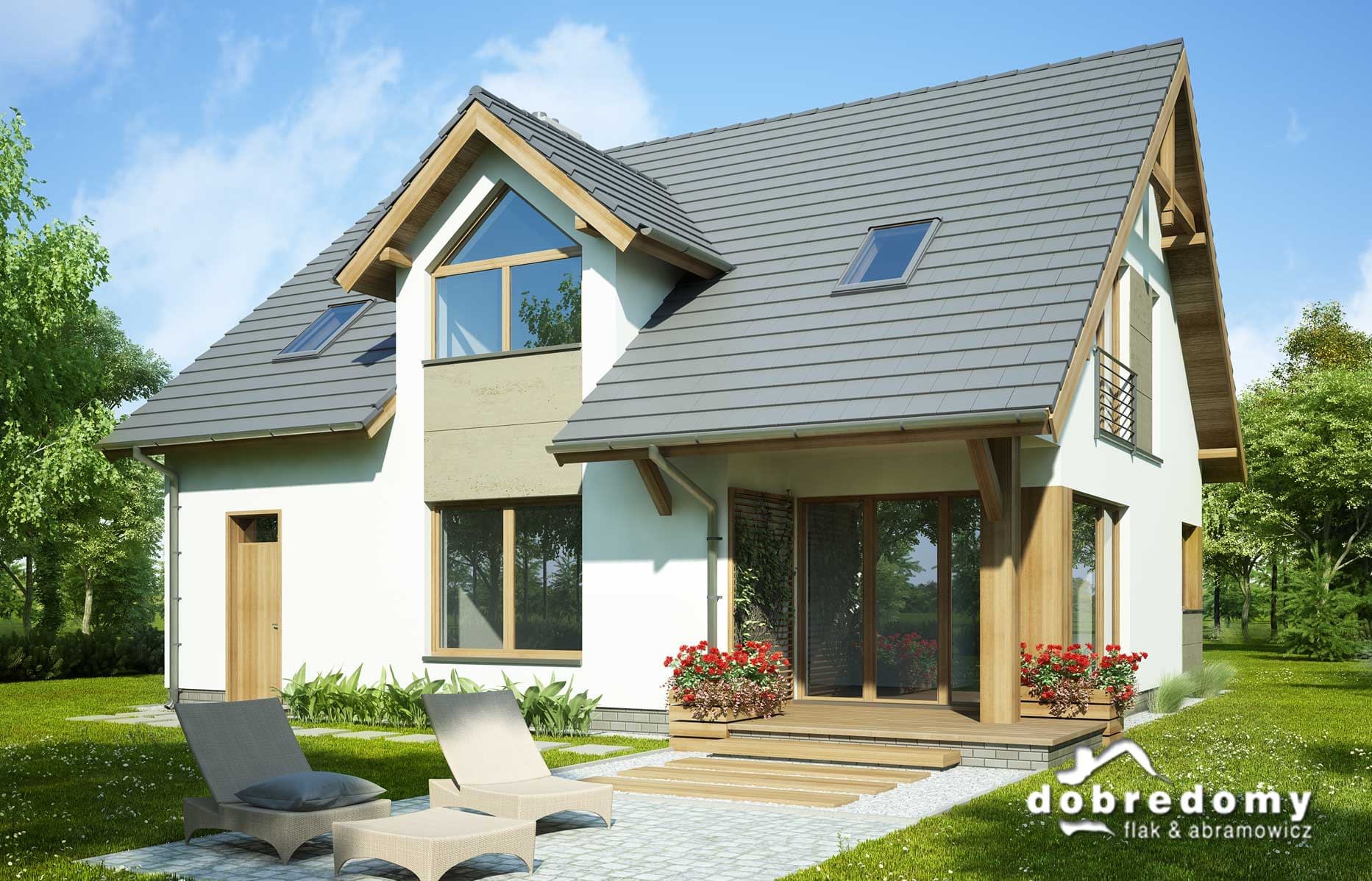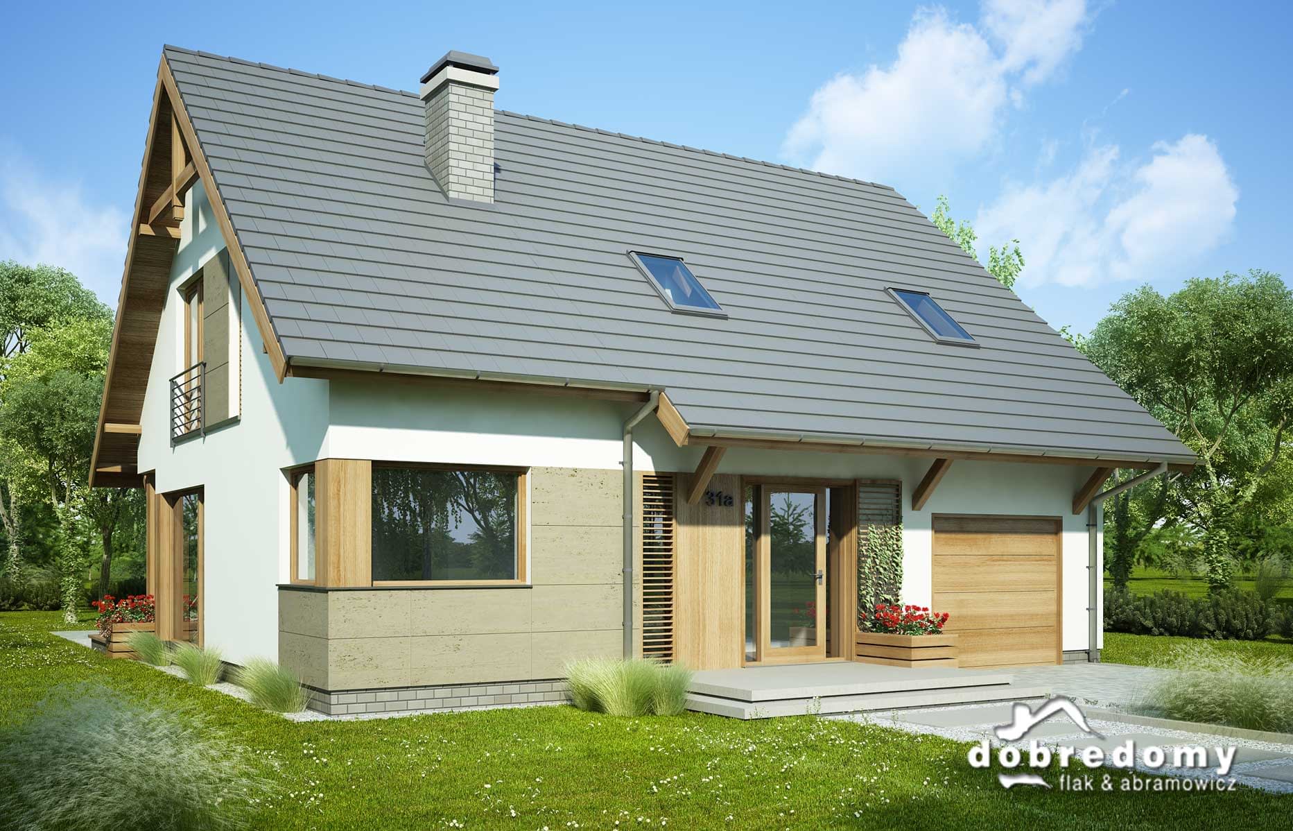 Dom z poddaszem użytkowym, niepodpiwniczony, przeznaczony dla 4-5 osobowej rodziny. Na parterze znajduje się część dzienna z obszernym salonem połączonym z jadalnią i bezpośrednim dostępem do kuchni oraz część gospodarcza z garażem jednostanowiskowym i pomieszczeniem gospodarczym. Na poddaszu zlokalizowano część nocną z sypialniami, ogólnodostępną łazienką, pralnią oraz sypialnię rodziców z garderobą. Projekt dostępny w wersji z lukarną - Elena.