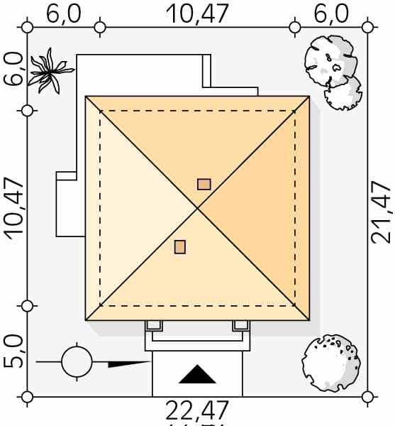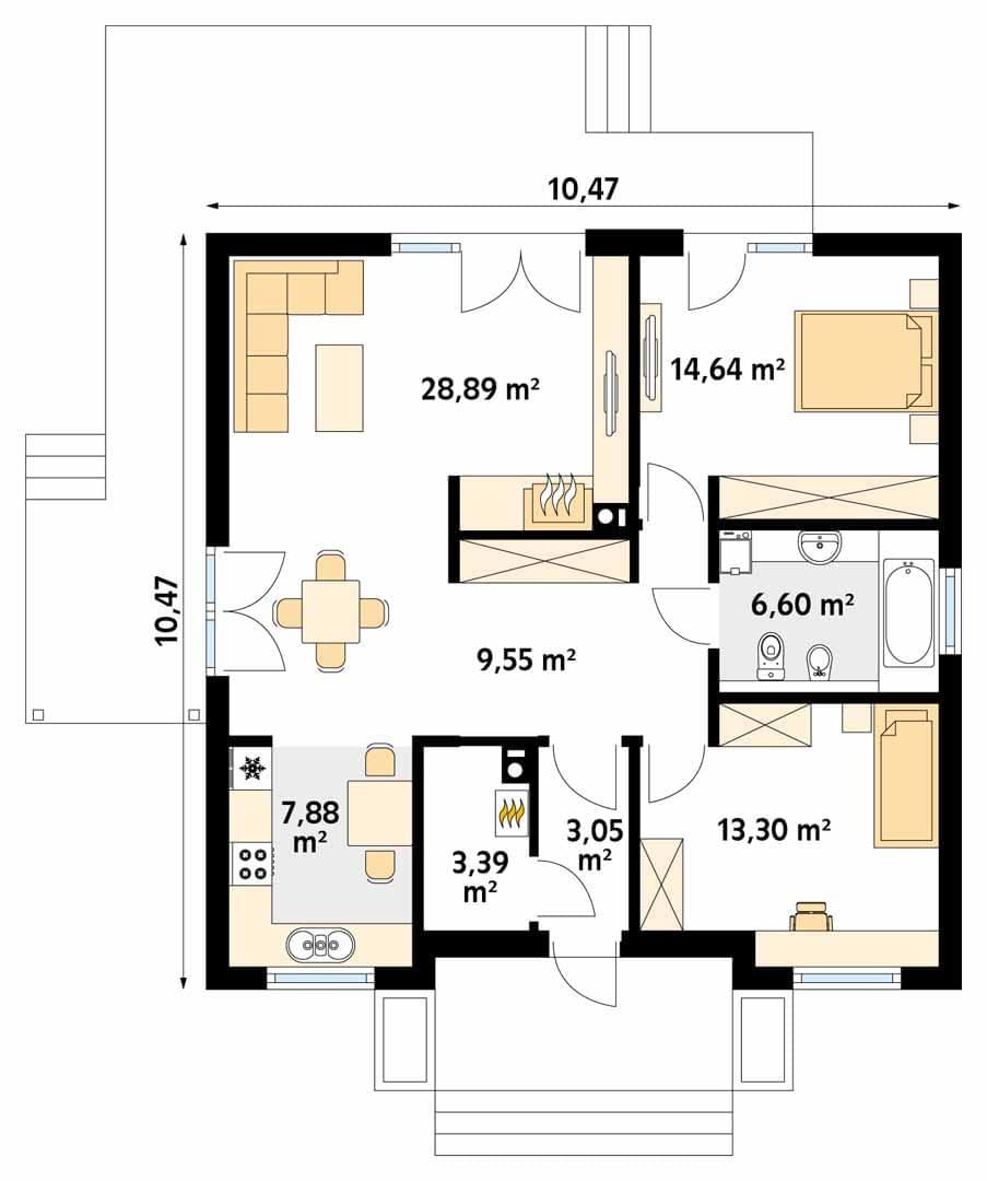 Elka 2 dr-st to niewielki dom parterowy odpowiadający potrzebom 3-4 osobowej rodziny. Projekt charakteryzuje się zwartą bryłą przykrytą dachem kopertowym. Atutem projektu jest przestrzenna część dzienna, którą tworzą salon połączony z jadalnią oraz otwarta kuchnia. Strefa nocna to dwie sypialnie oraz rodzinna łazienka. W projekcie przewidziano kotłownię, którą można wykorzystać na ogrzewanie gazowe jak i paliwo stałe.Konstrukcja