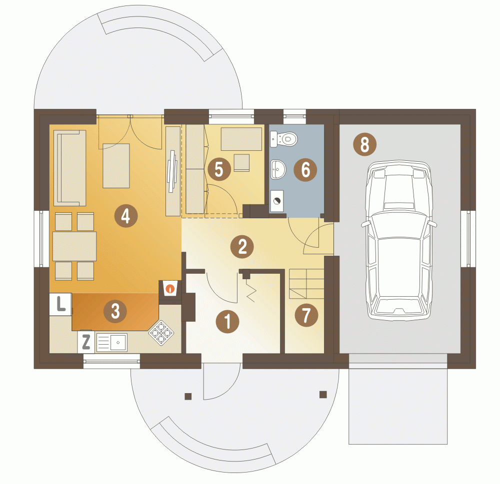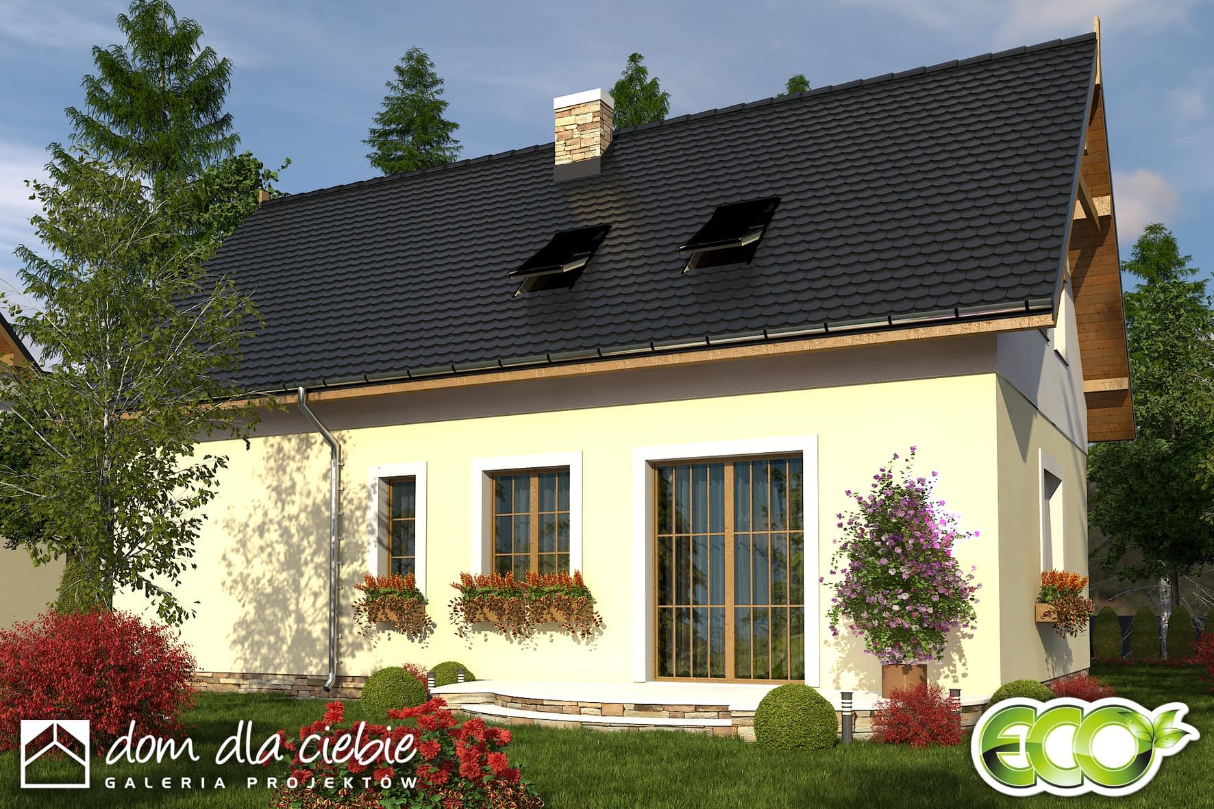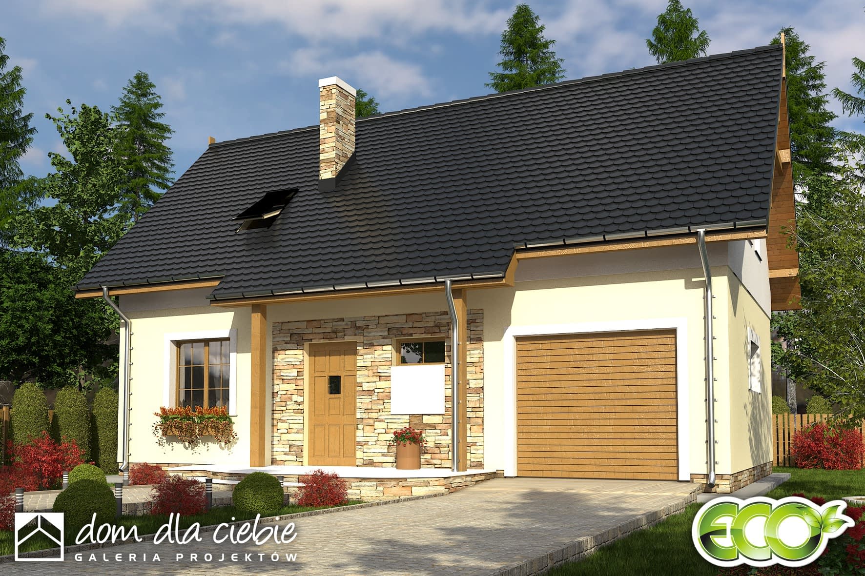 Klasyczny mały domek dla 3-4 osobowej rodziny z wbudowanym garażem. Prosta i zwarta bryła oraz niewielka powierzchnia sprawiają, że będzie tani w realizacji i użytkowaniu. Na parterze strefa dzienna z możliwością wydzielenia niewielkiego pokoiku do pracy. Na poddaszu strefa nocna: dwie sypialnie, garderoba i łazienka oraz strych do ewentualnej adaptacji.