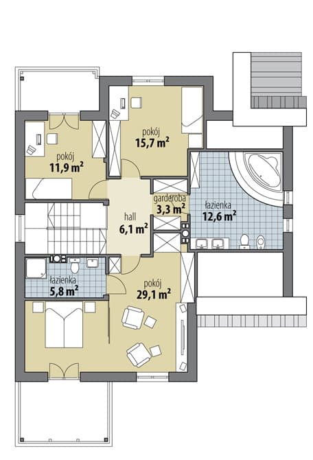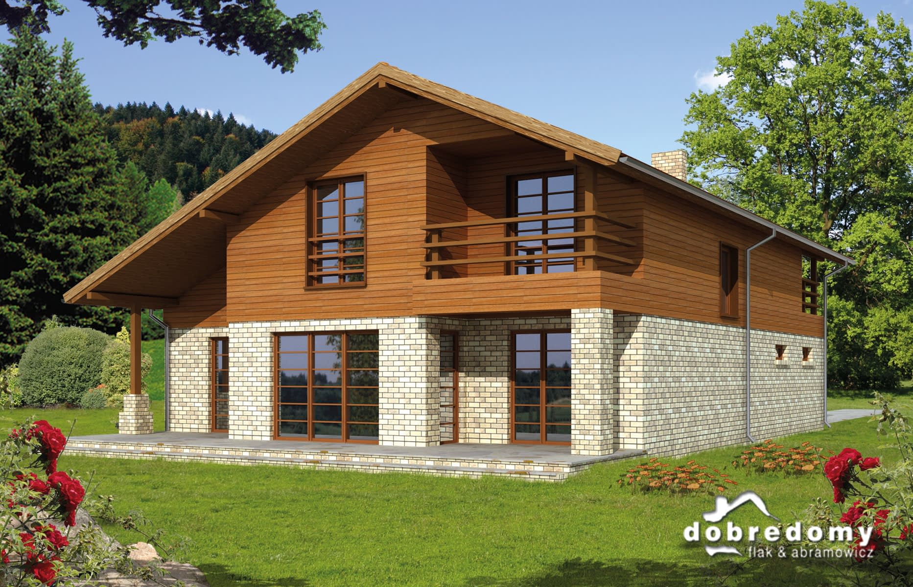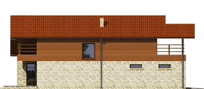 Dom z poddaszem użytkowym, przeznaczony dla 4-5 osobowej rodziny. Nowoczesna, ale stonowana bryła i zastosowanie ogólnie dostępnych technologii czynią go dobrym rozwiązaniem dla rodziny wymagającej więcej miejsca i pomieszczeń z pełną wysokością na poddaszu. Parter to część dzienna – salon, jadalnia i wygodna kuchnia. Na parterze zaprojektowano duży hall rozdzielający funkcje, pokój gościnny i łazienkę oraz garaż i pom. gospodarcze. Na poddaszu przewidziano sypialnię z własną łazienką i salką TV, dwa pokoje dla dzieci oraz pokój kąpielowy z garderobą.
