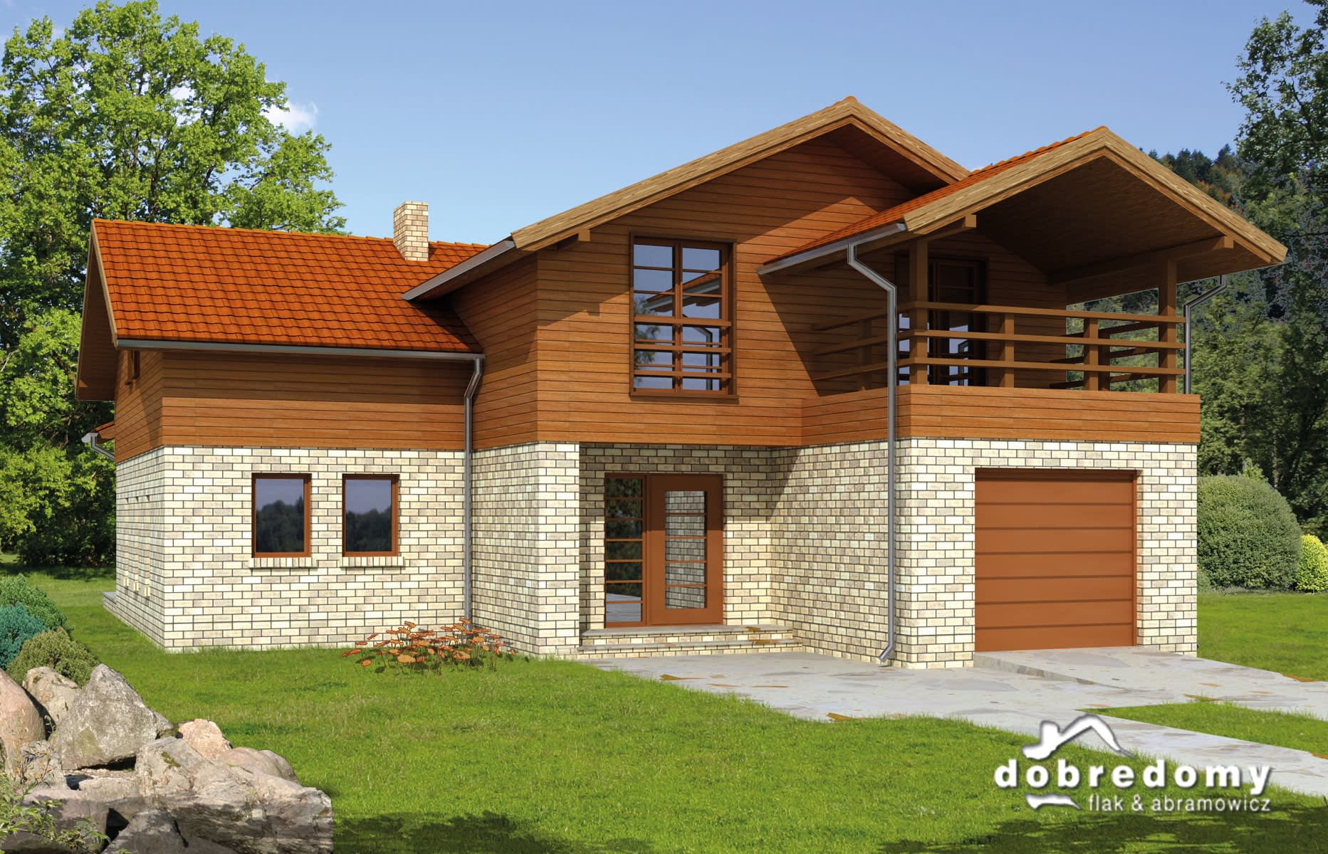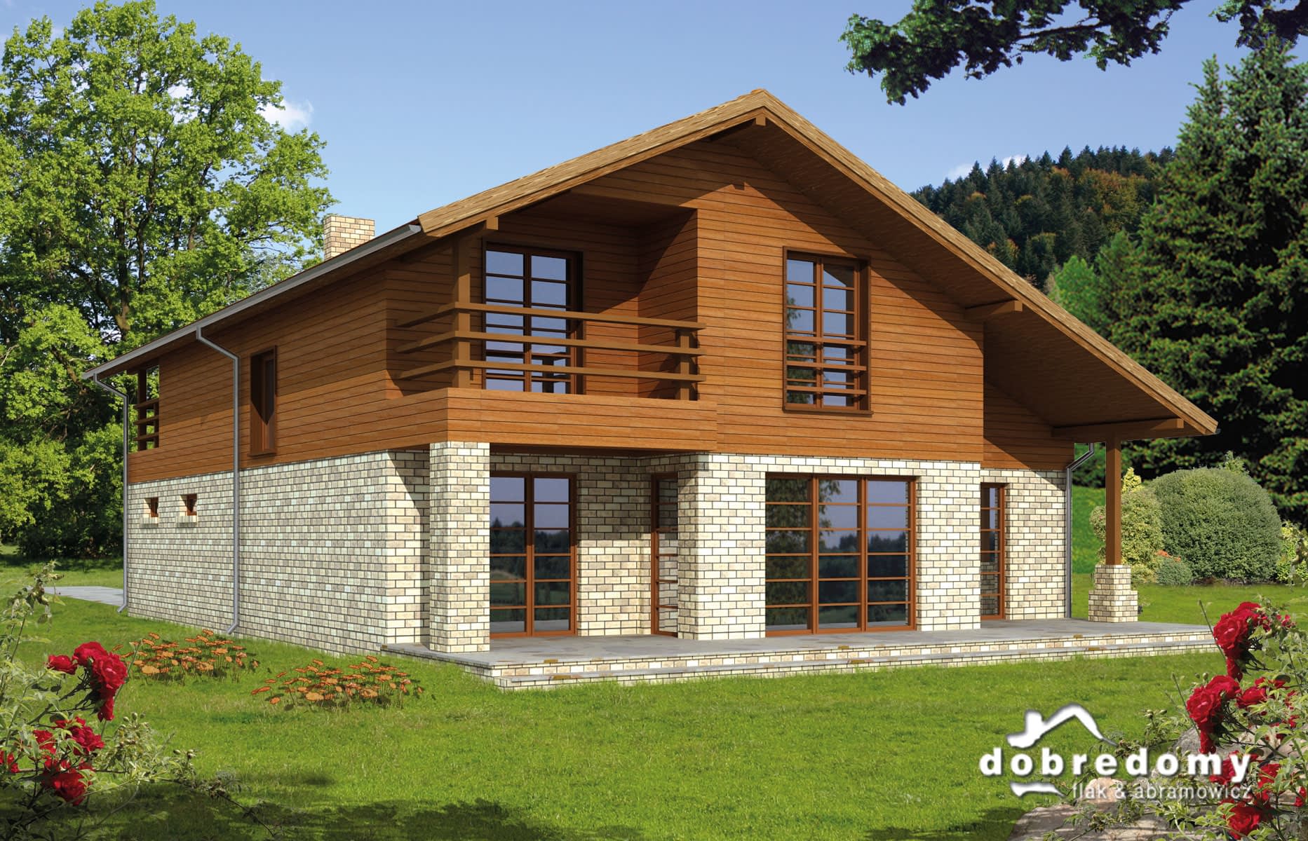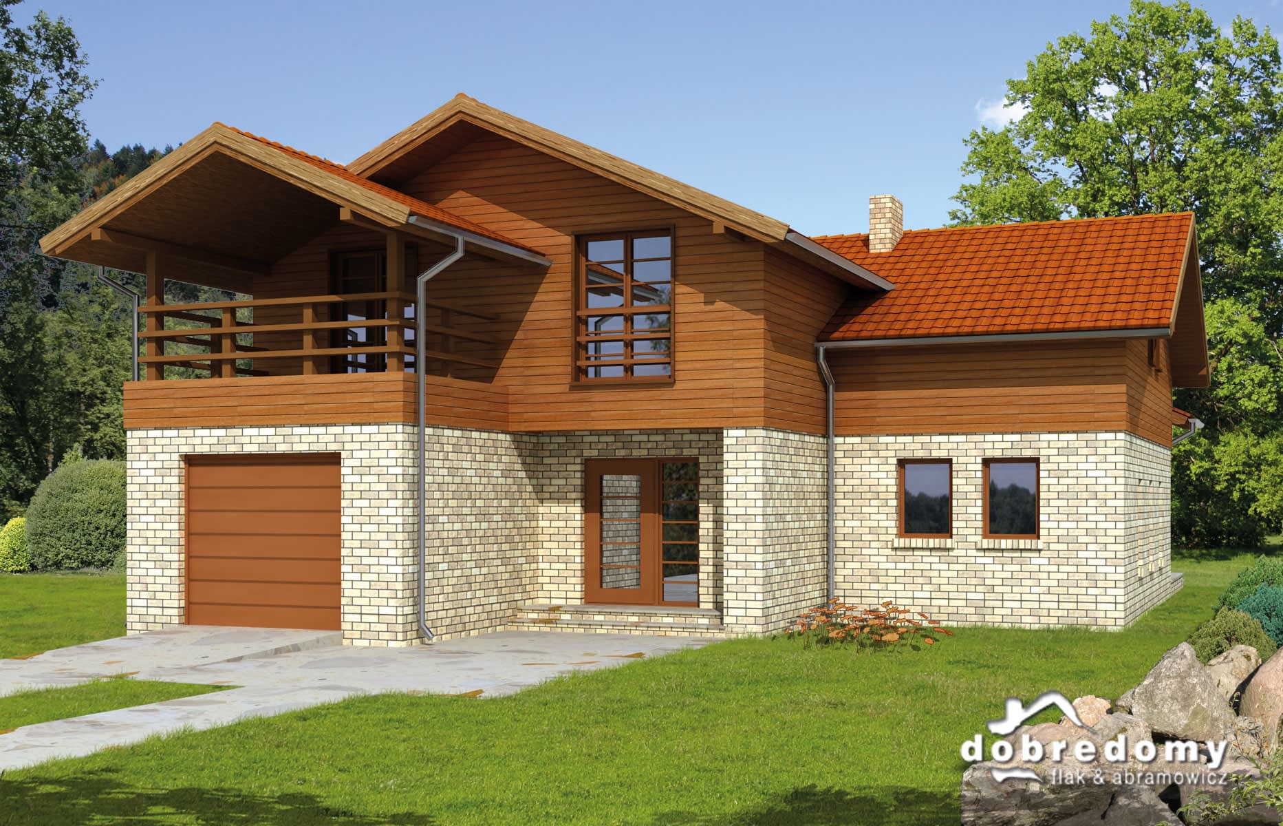 Elewacje w okładzinie klinkierowej i drewnie. Pokrycie dachu - dachówka ceramiczna lub cementowa CREATON.