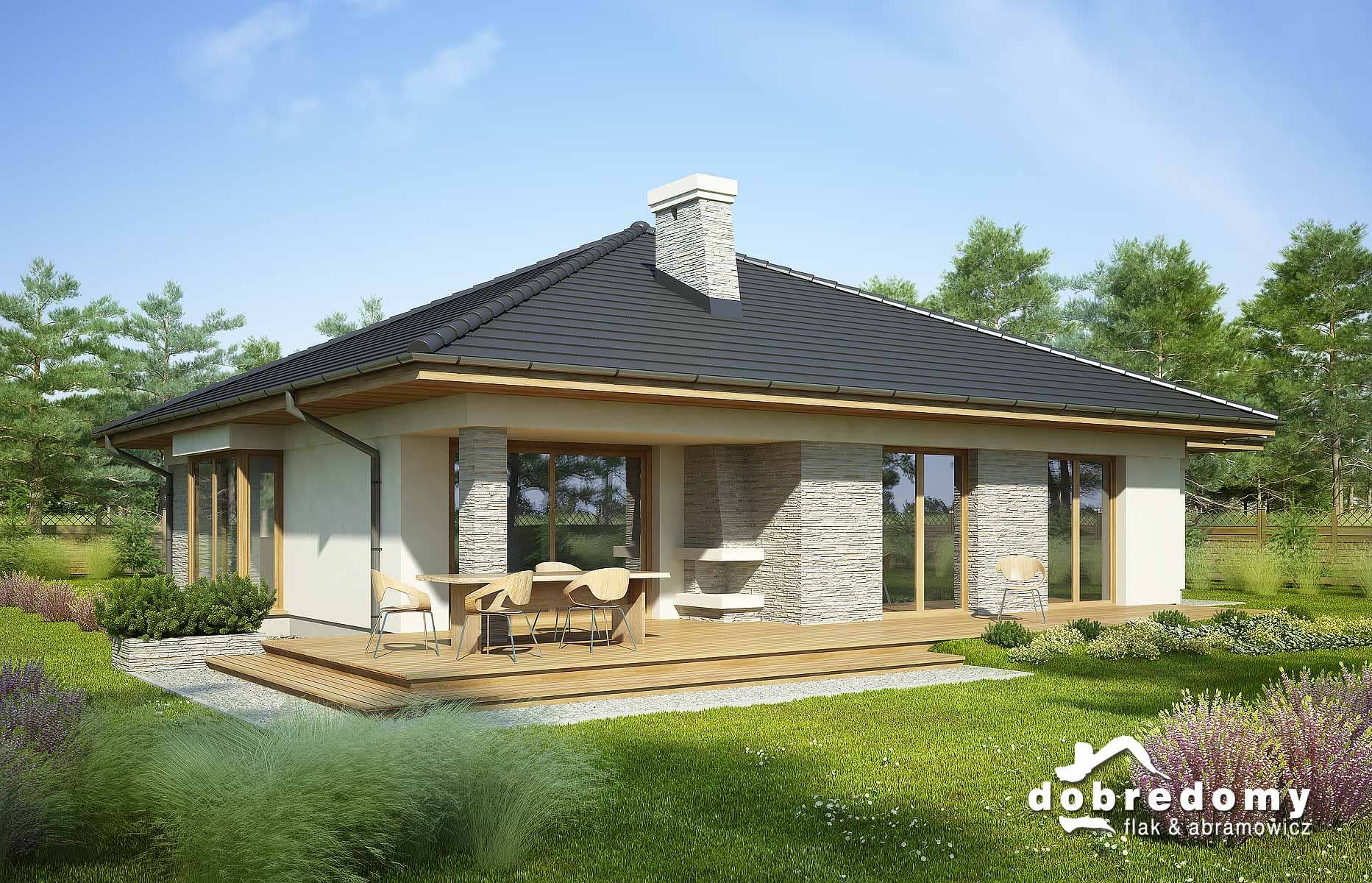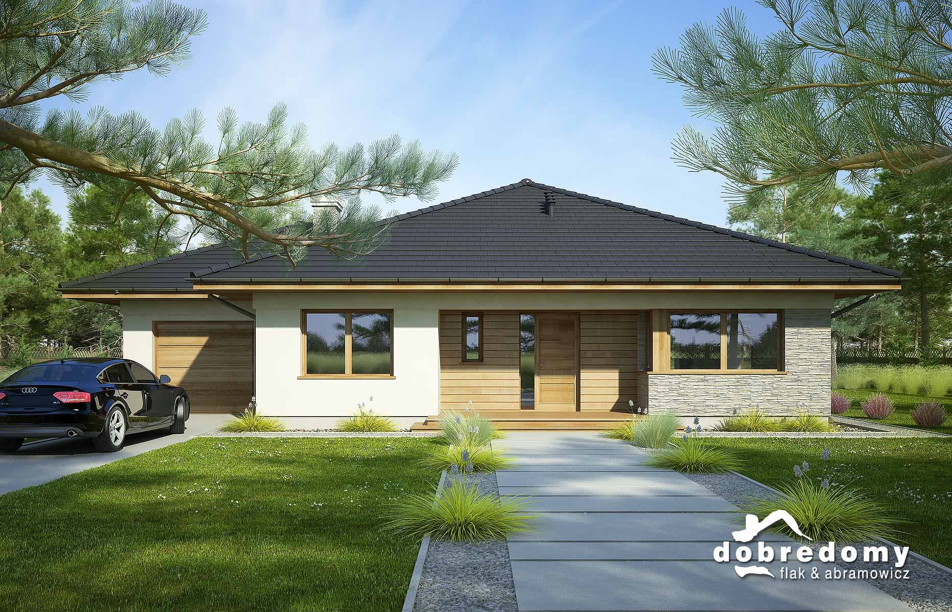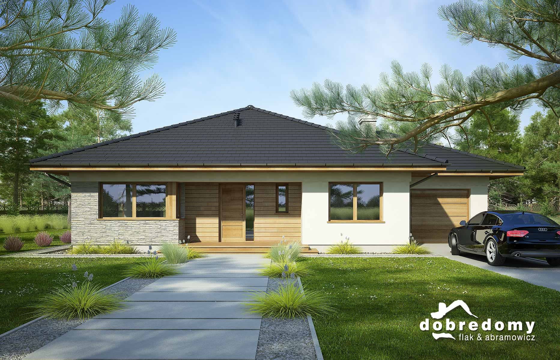 Projekt parterowego domu z garażem i poddaszem nieużytkowym. Część dzienna obejmuje pokój dzienny, jadalnię umieszczoną w pięknym, przeszklonym wykusz oraz kuchnię ze spiżarnią. Tuż przy wiatrołapie zaprojektowano pom. gosp i garaż. Strefa nocna domu to trzy sypialnie i dwie łazienki. Projekt dostępny w wersji bez garażu - Fabia; z innym układem - Fabia IV; w wersji z garażem 2-st. - Fabia III, Fabia V, Fabia VII i Fabia X; o większej powierzchni użytkowej i garażem 2-st. - Fabia VI, Fabia VIII, Fabia IX i Fabia XI.