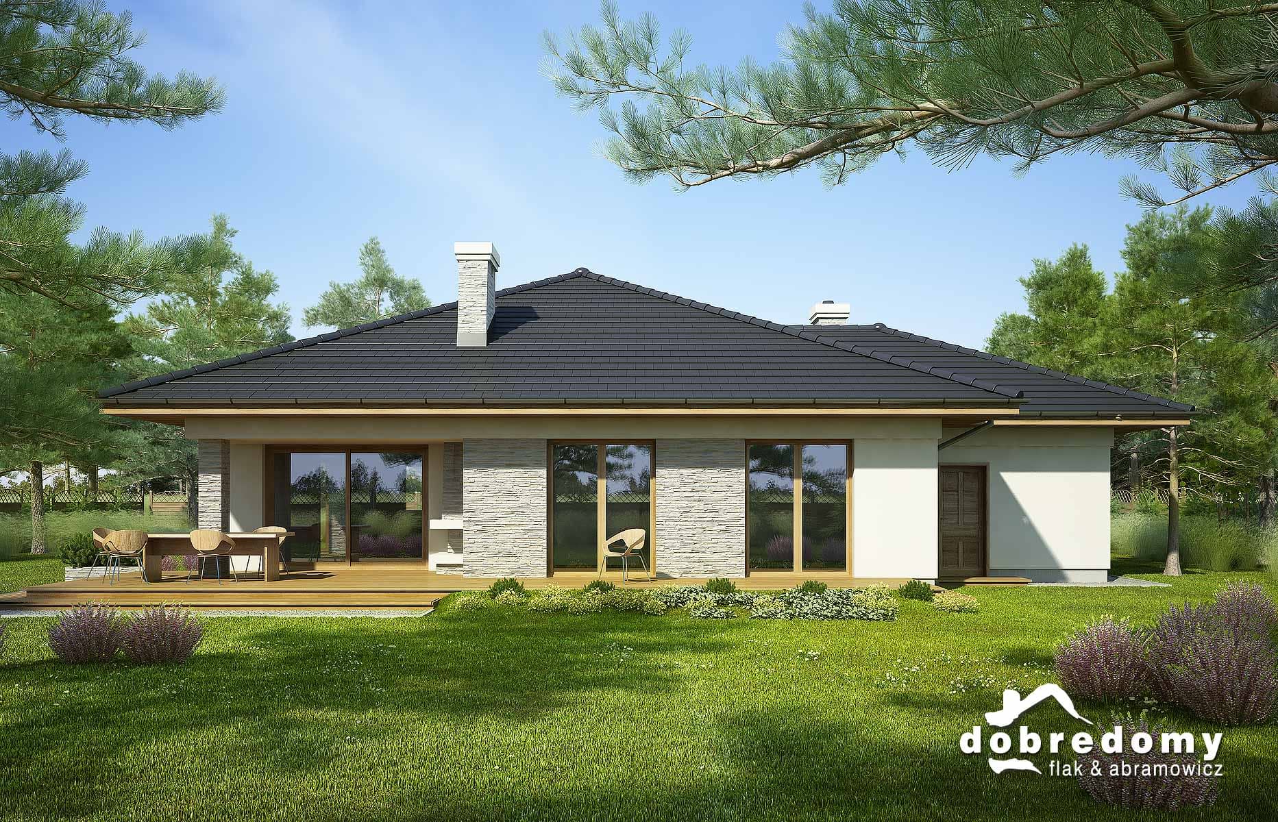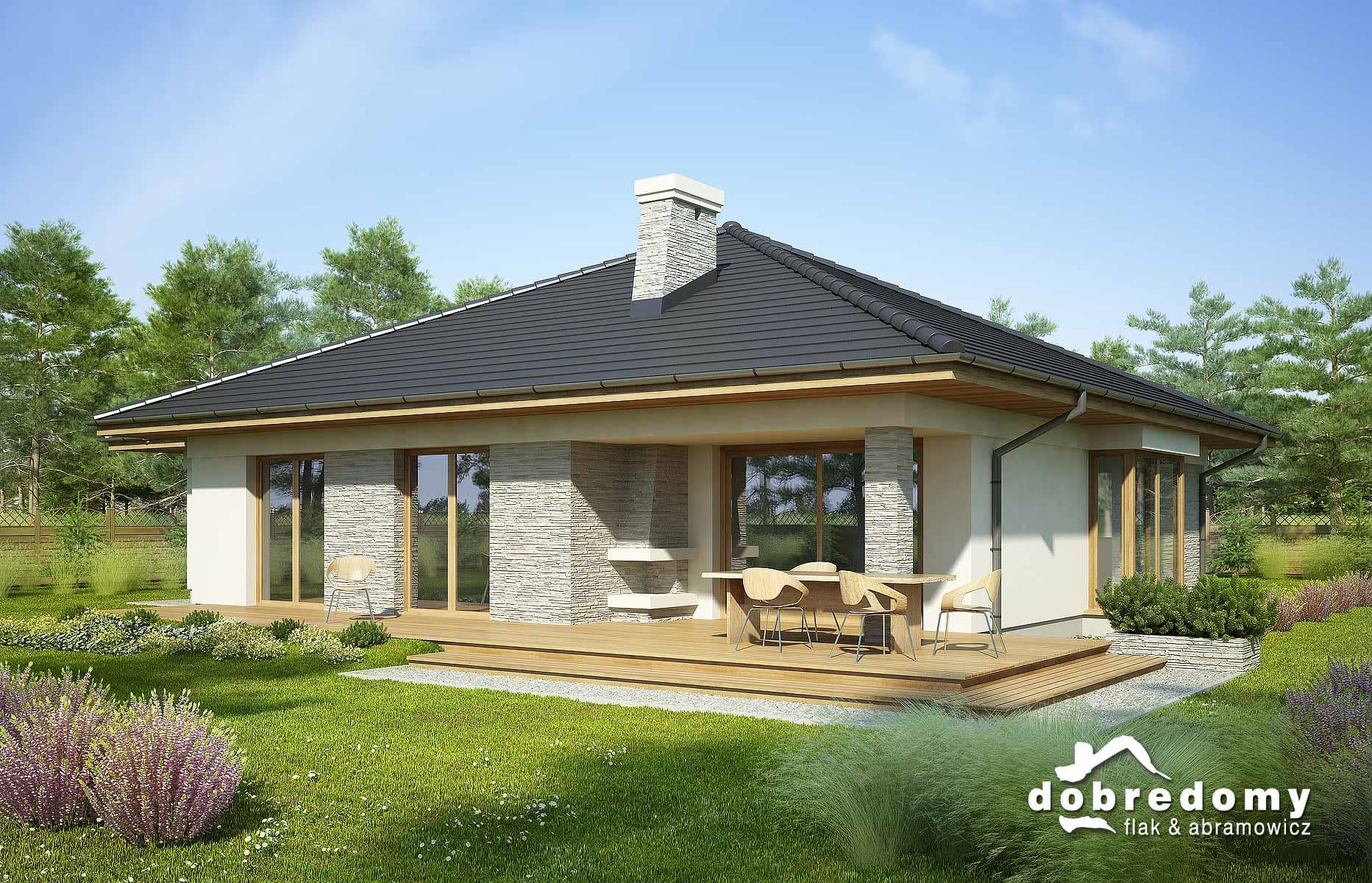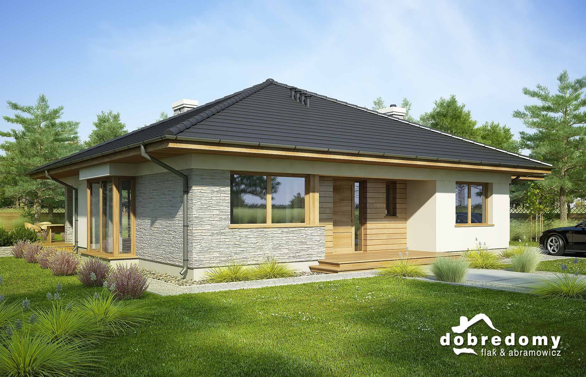 Projekt parterowego domu z garażem i poddaszem nieużytkowym. Część dzienna obejmuje pokój dzienny, jadalnię umieszczoną w pięknym, przeszklonym wykusz oraz kuchnię ze spiżarnią. Tuż przy wiatrołapie zaprojektowano pom. gosp i garaż. Strefa nocna domu to trzy sypialnie i dwie łazienki. Projekt dostępny w wersji bez garażu - Fabia; z innym układem - Fabia IV; w wersji z garażem 2-st. - Fabia III, Fabia V, Fabia VII i Fabia X; o większej powierzchni użytkowej i garażem 2-st. - Fabia VI, Fabia VIII, Fabia IX i Fabia XI.