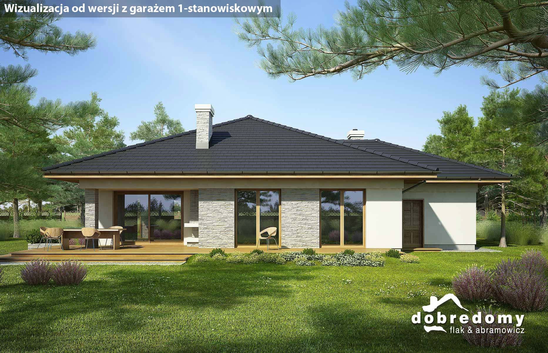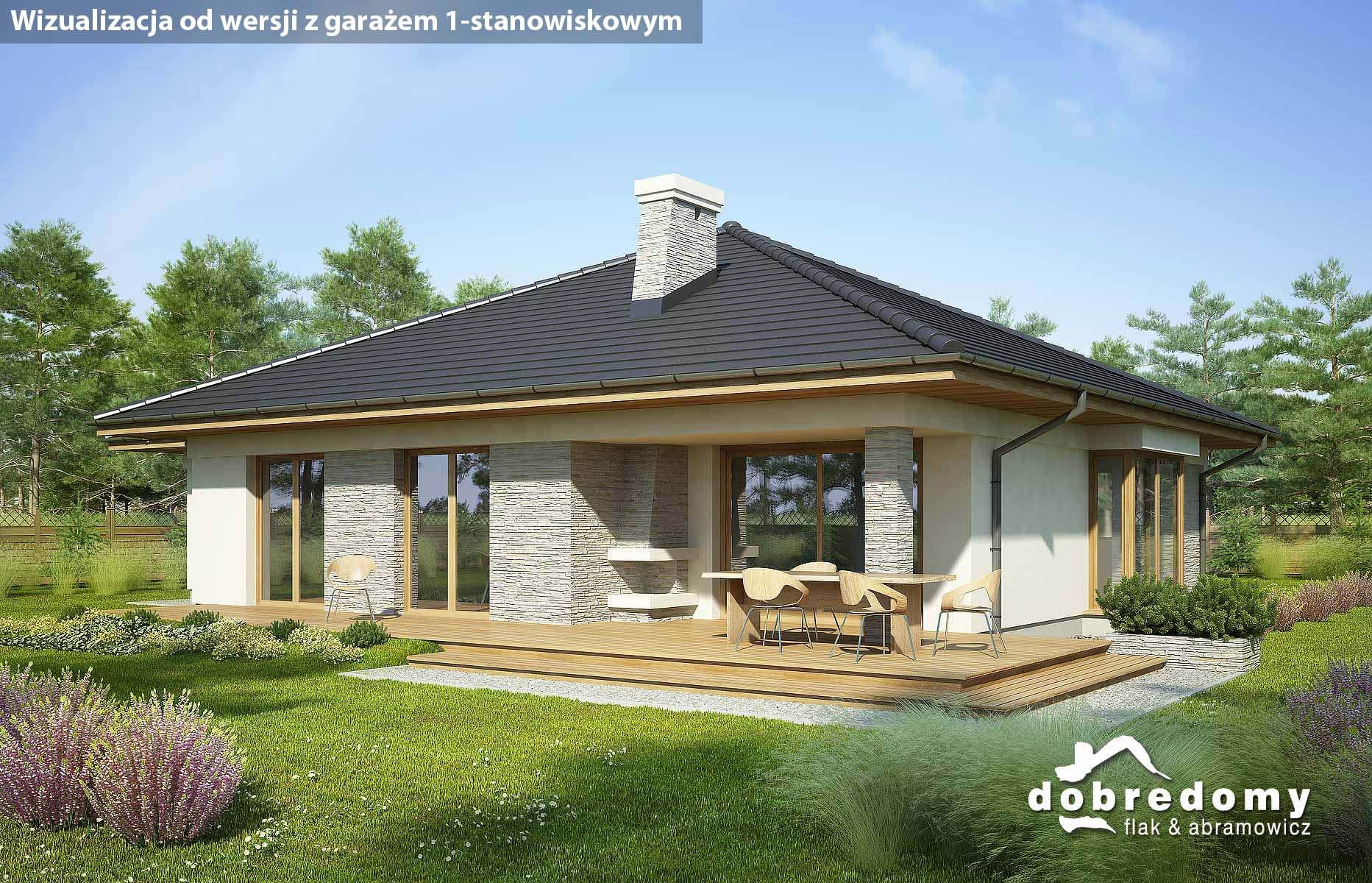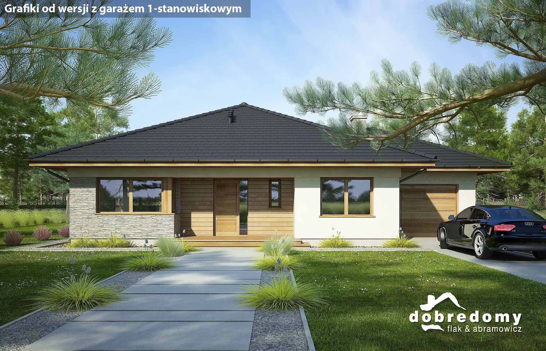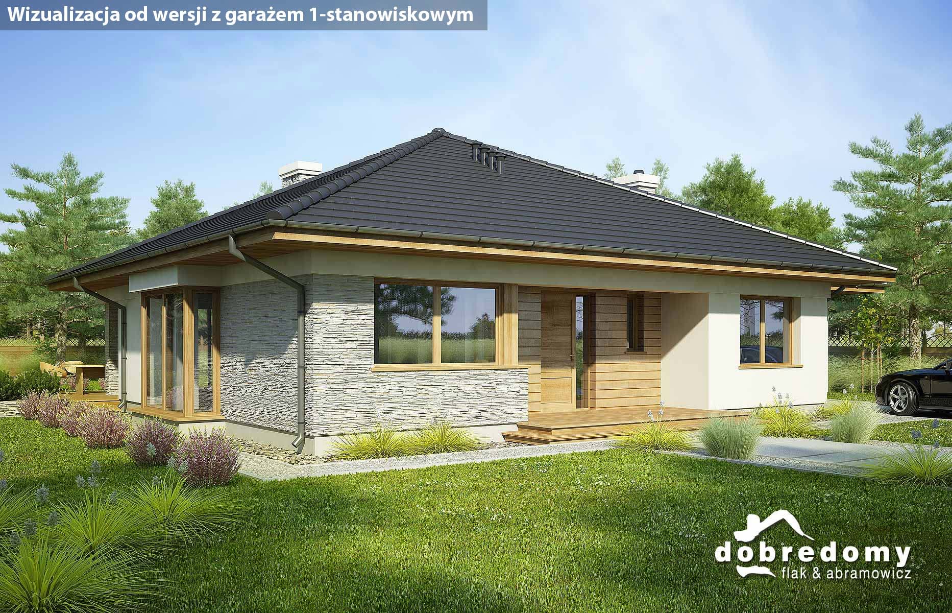 Projekt parterowego domu z garażem i poddaszem nieużytkowym. Część dzienna obejmuje pokój dzienny, jadalnię umieszczoną w pięknym, przeszklonym wykusz oraz kuchnię ze spiżarnią. Tuż przy wiatrołapie zaprojektowano pom. gosp. i garaż. Strefa nocna domu to trzy sypialnie i dwie łazienki. Projekt dostępny w wersji bez garażu - Fabia; z garażem 1-st. - Fabia II i Fabia IV; z innym układem funkcjonalnym - Fabia V, Fabia VII i Fabia X; o większej powierzchni użytkowej - Fabia VI, Fabia VIII, Fabia IX i Fabia XI.