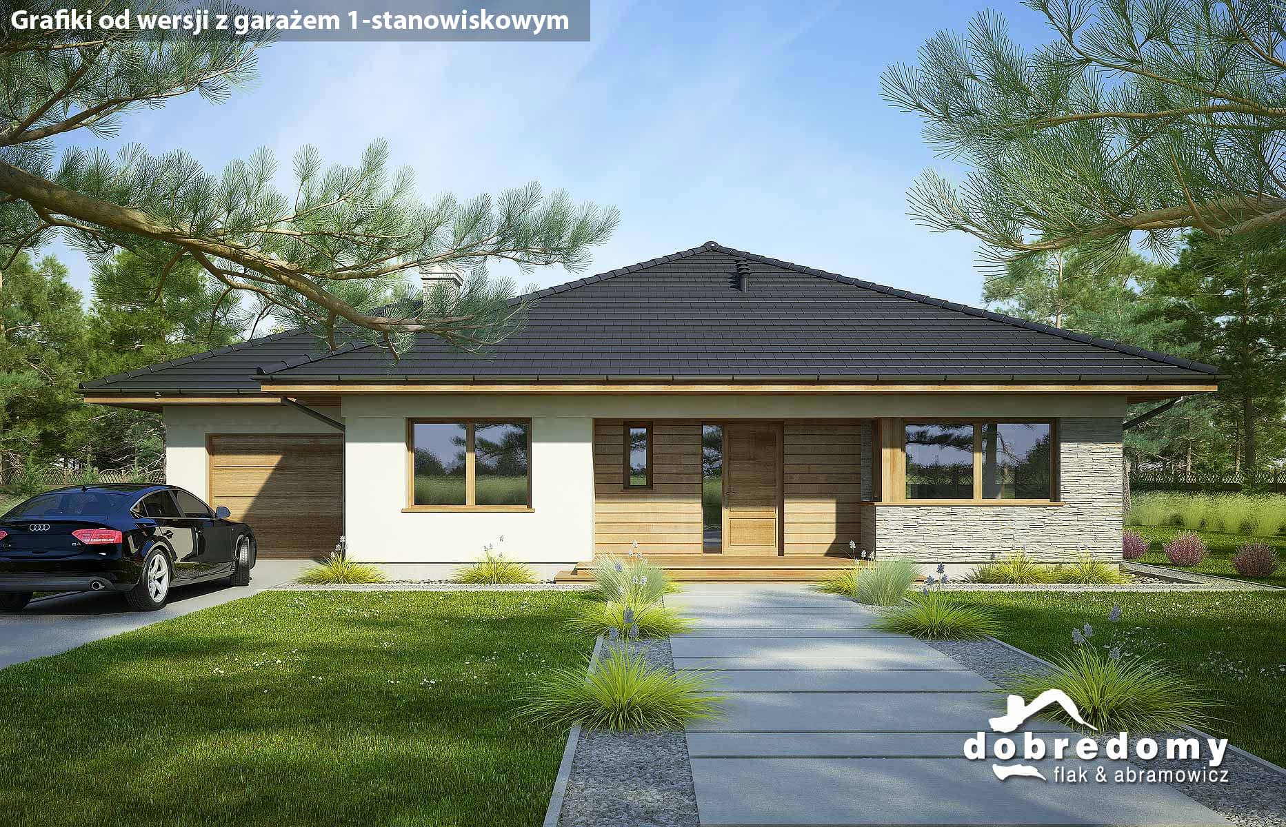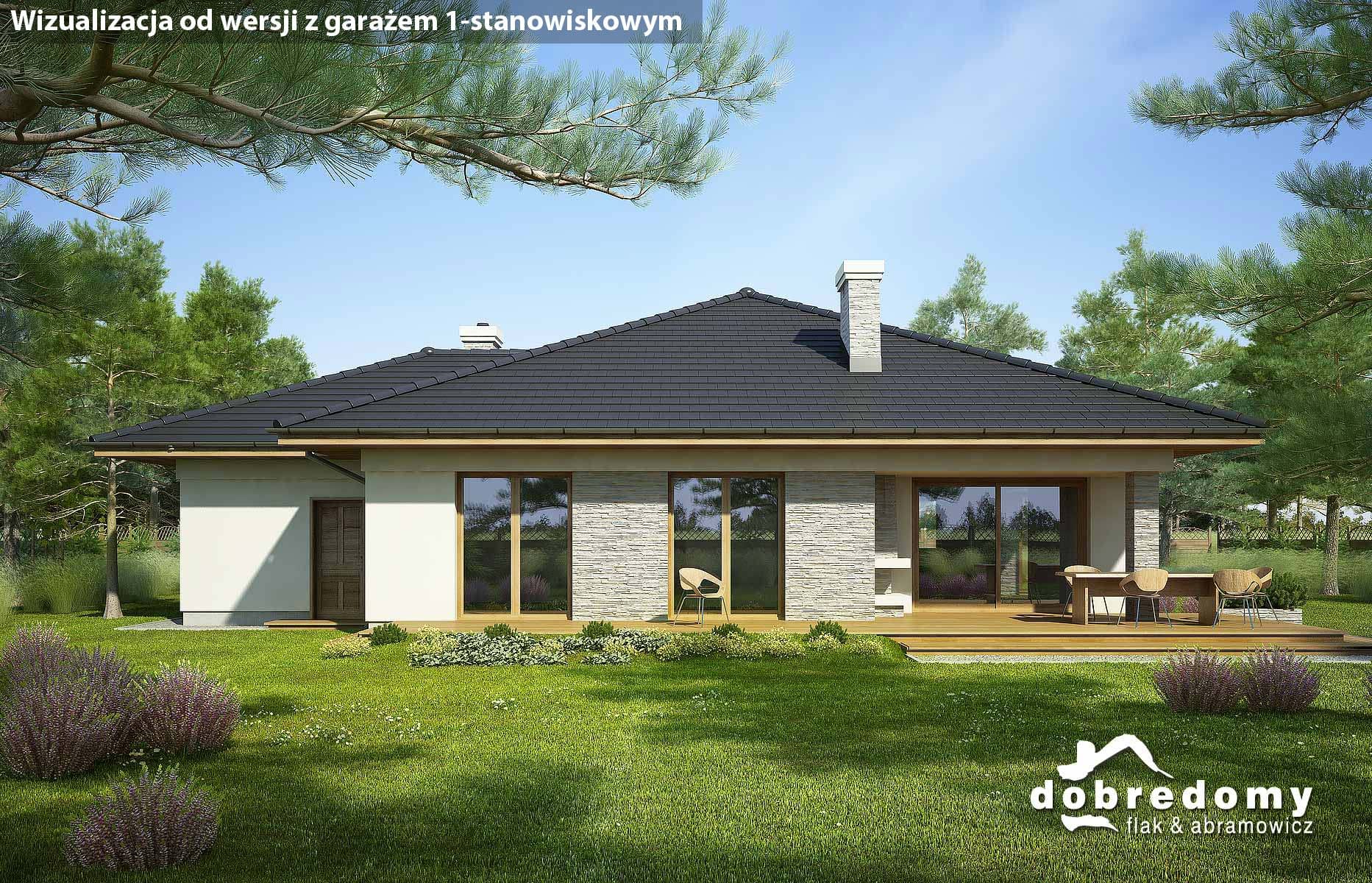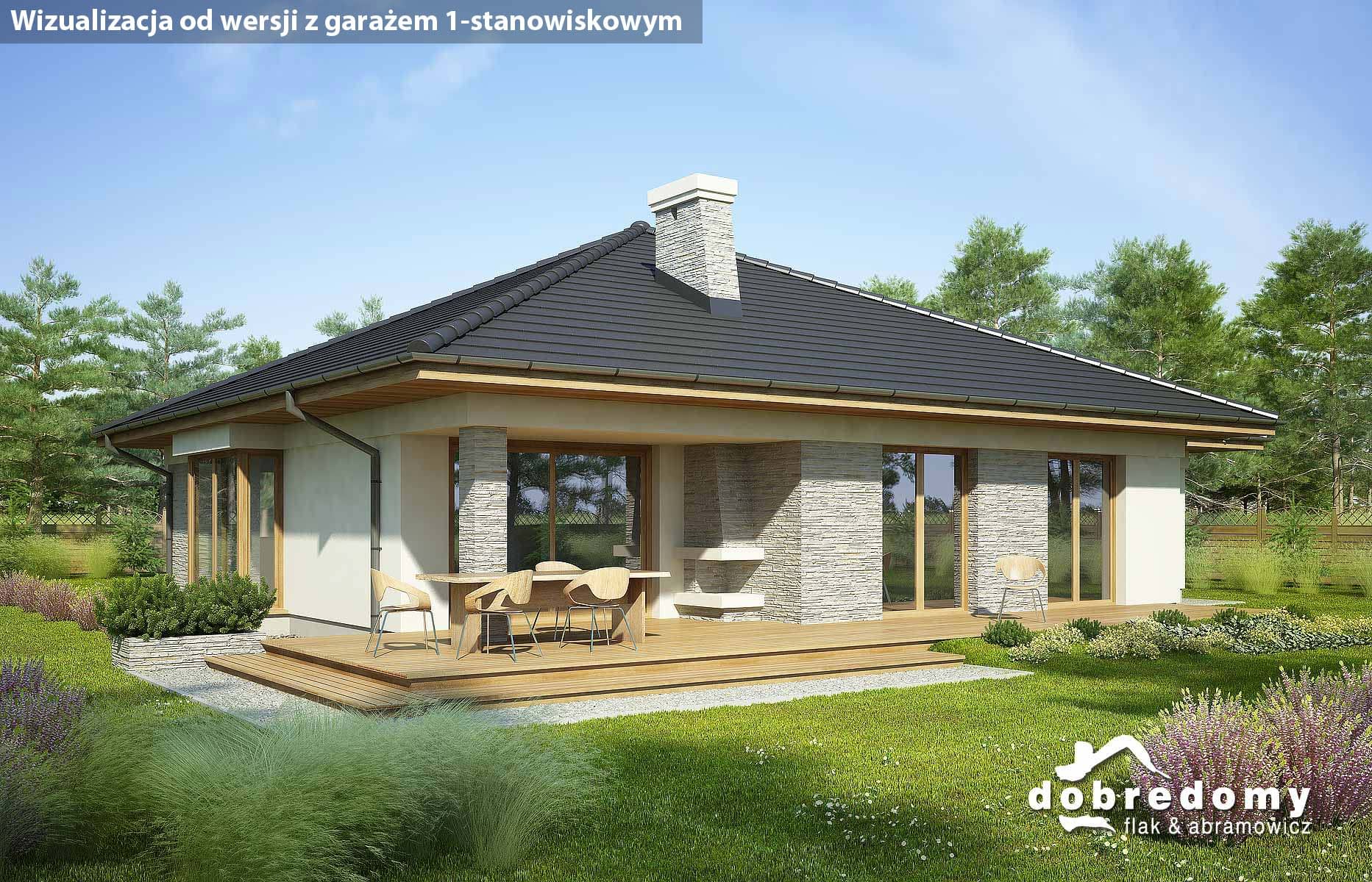 Projekt parterowego domu z garażem i poddaszem nieużytkowym. Część dzienna obejmuje pokój dzienny, jadalnię umieszczoną w pięknym, przeszklonym wykusz oraz kuchnię ze spiżarnią. Tuż przy wiatrołapie zaprojektowano pom. gosp. i garaż. Strefa nocna domu to trzy sypialnie i dwie łazienki. Projekt dostępny w wersji bez garażu - Fabia; z garażem 1-st. - Fabia II i Fabia IV; z innym układem funkcjonalnym - Fabia V, Fabia VII i Fabia X; o większej powierzchni użytkowej - Fabia VI, Fabia VIII, Fabia IX i Fabia XI.