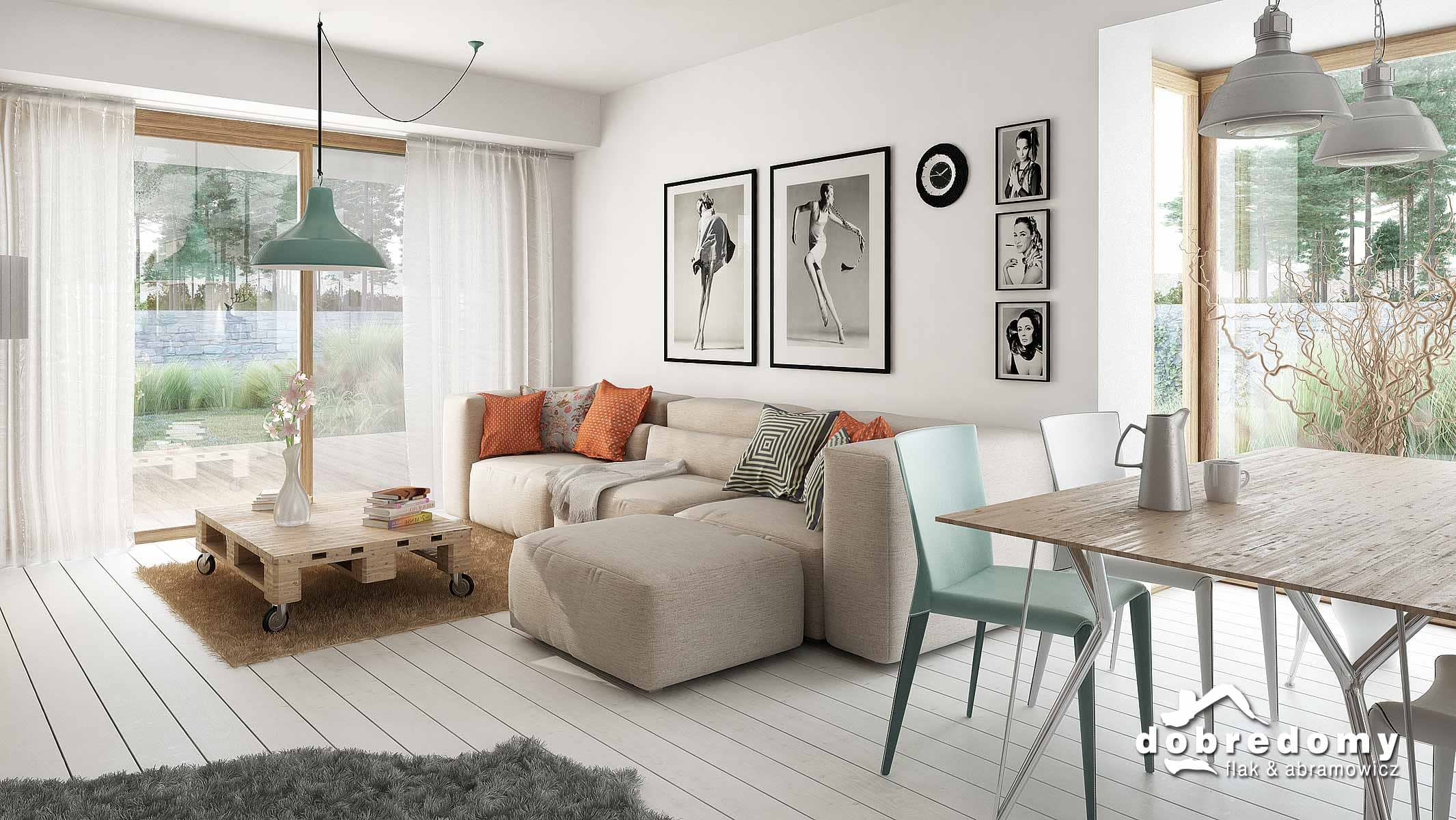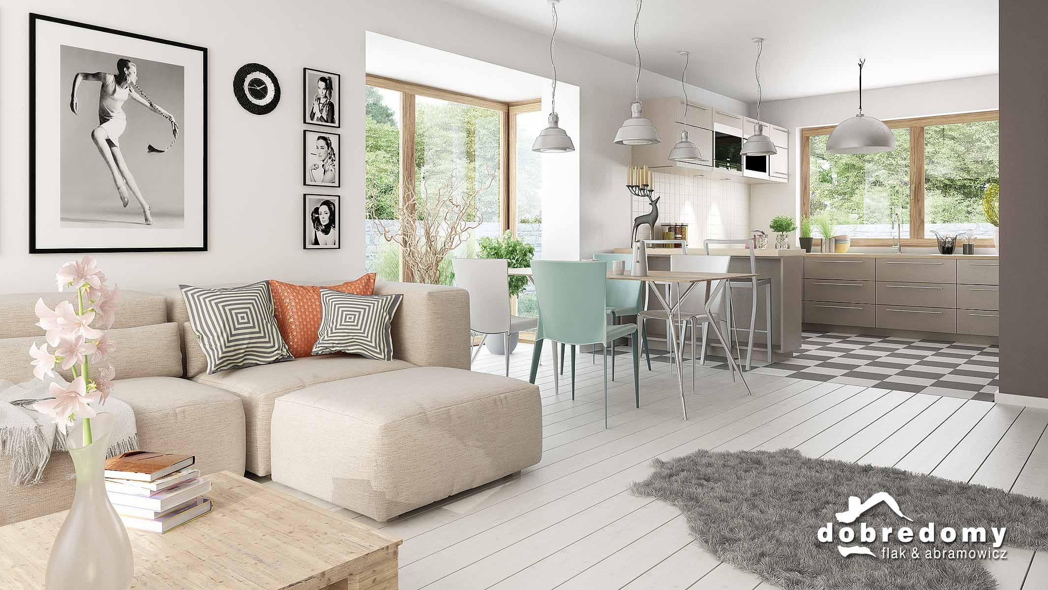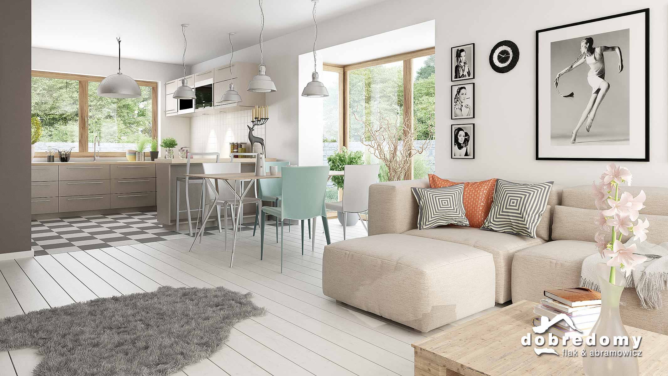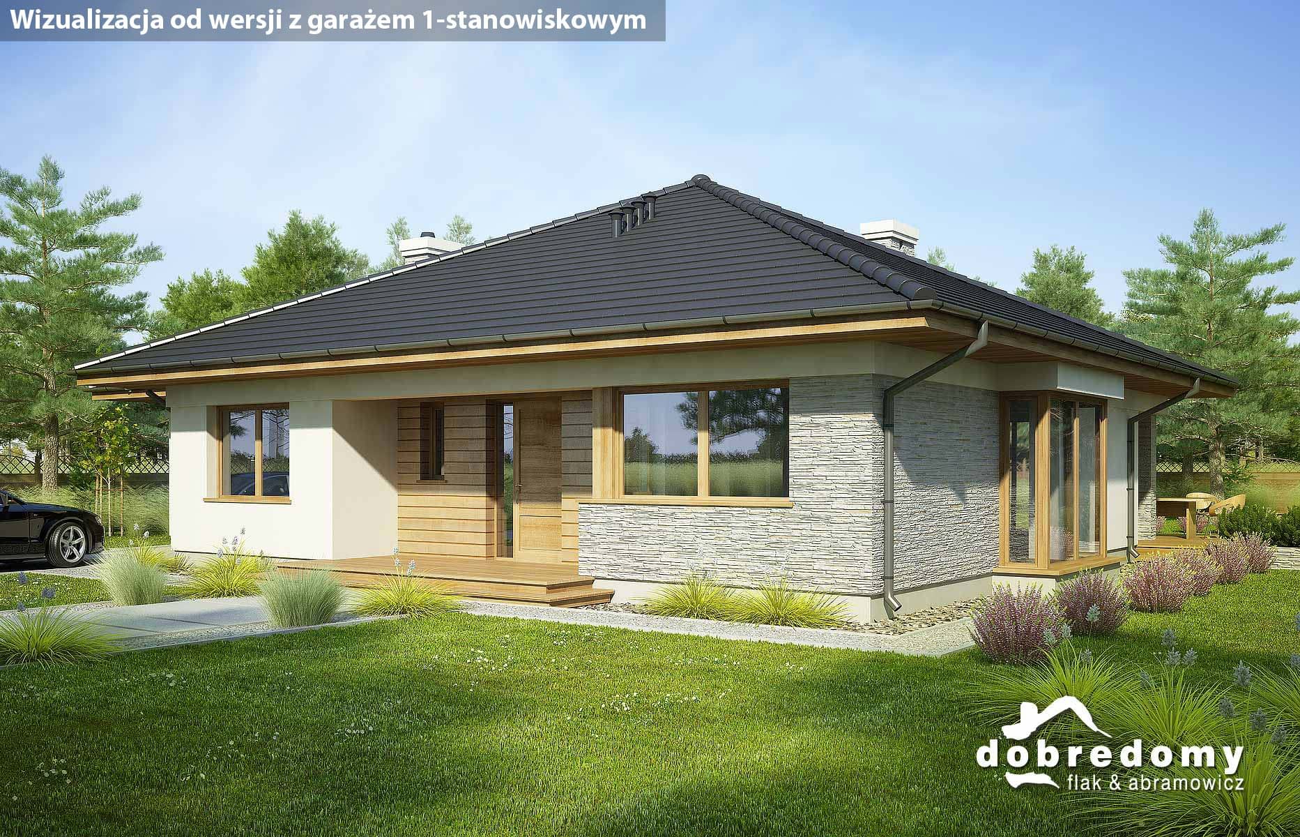 Projekt parterowego domu z garażem i poddaszem nieużytkowym. Część dzienna obejmuje pokój dzienny, jadalnię umieszczoną w pięknym, przeszklonym wykusz oraz kuchnię ze spiżarnią. Tuż przy wiatrołapie zaprojektowano pom. gosp. i garaż. Strefa nocna domu to trzy sypialnie i dwie łazienki. Projekt dostępny w wersji bez garażu - Fabia; z garażem 1-st. - Fabia II i Fabia IV; z innym układem funkcjonalnym - Fabia V, Fabia VII i Fabia X; o większej powierzchni użytkowej - Fabia VI, Fabia VIII, Fabia IX i Fabia XI.