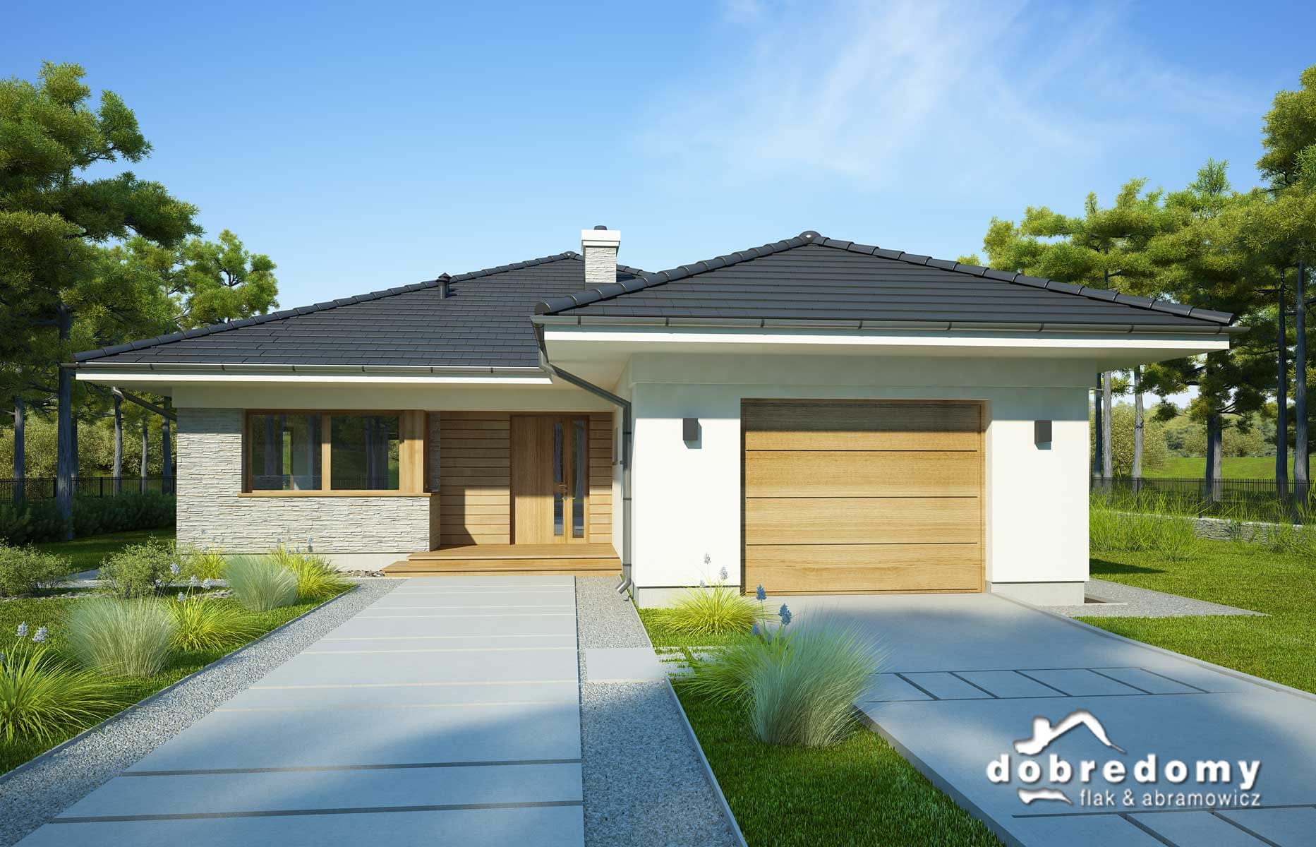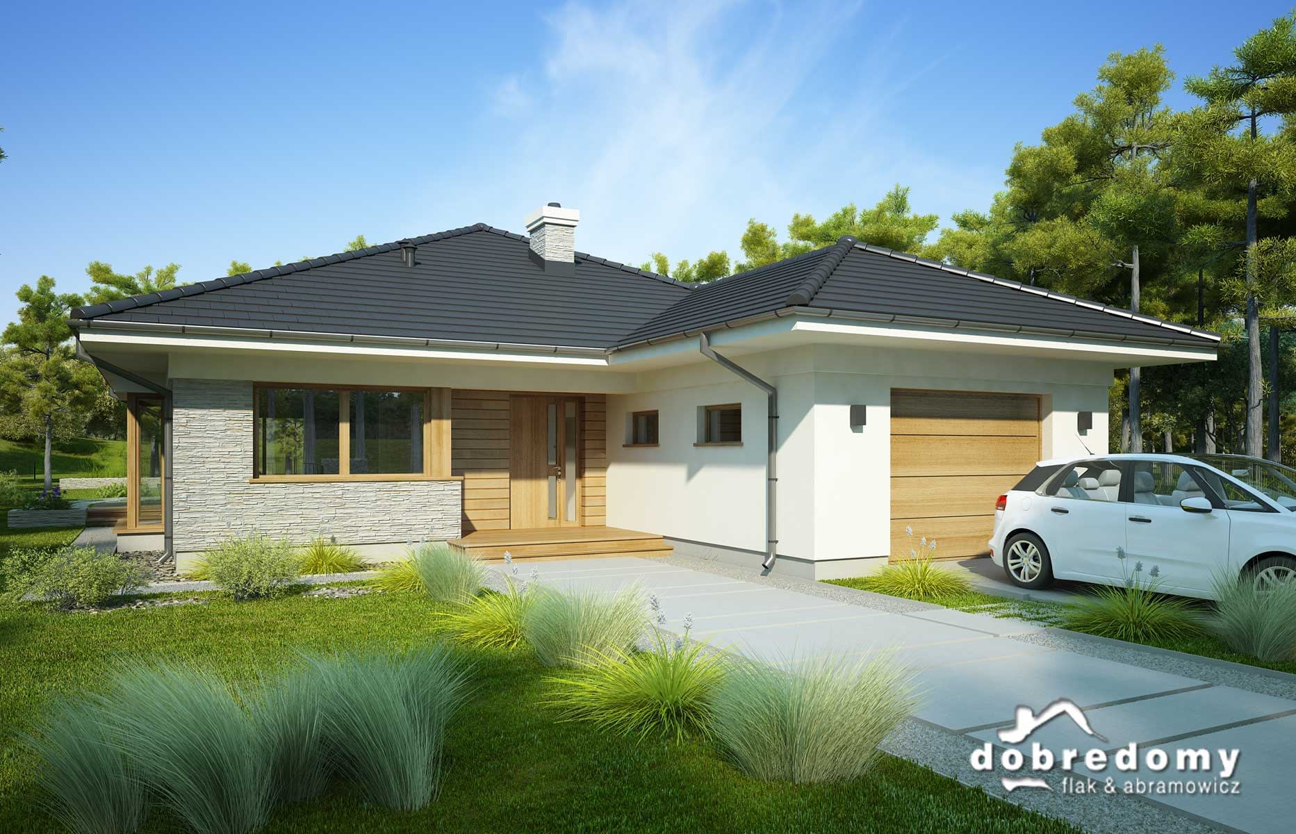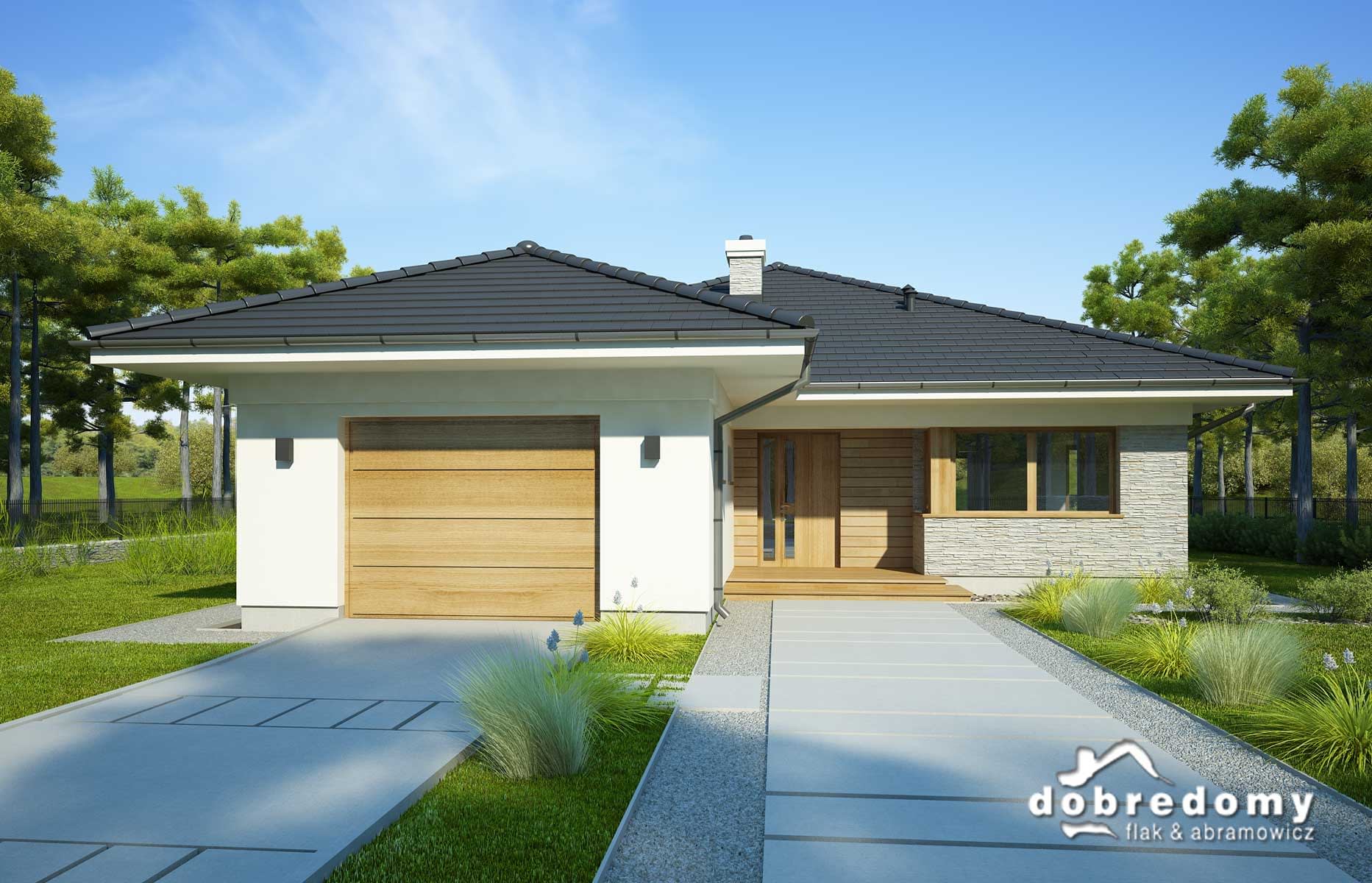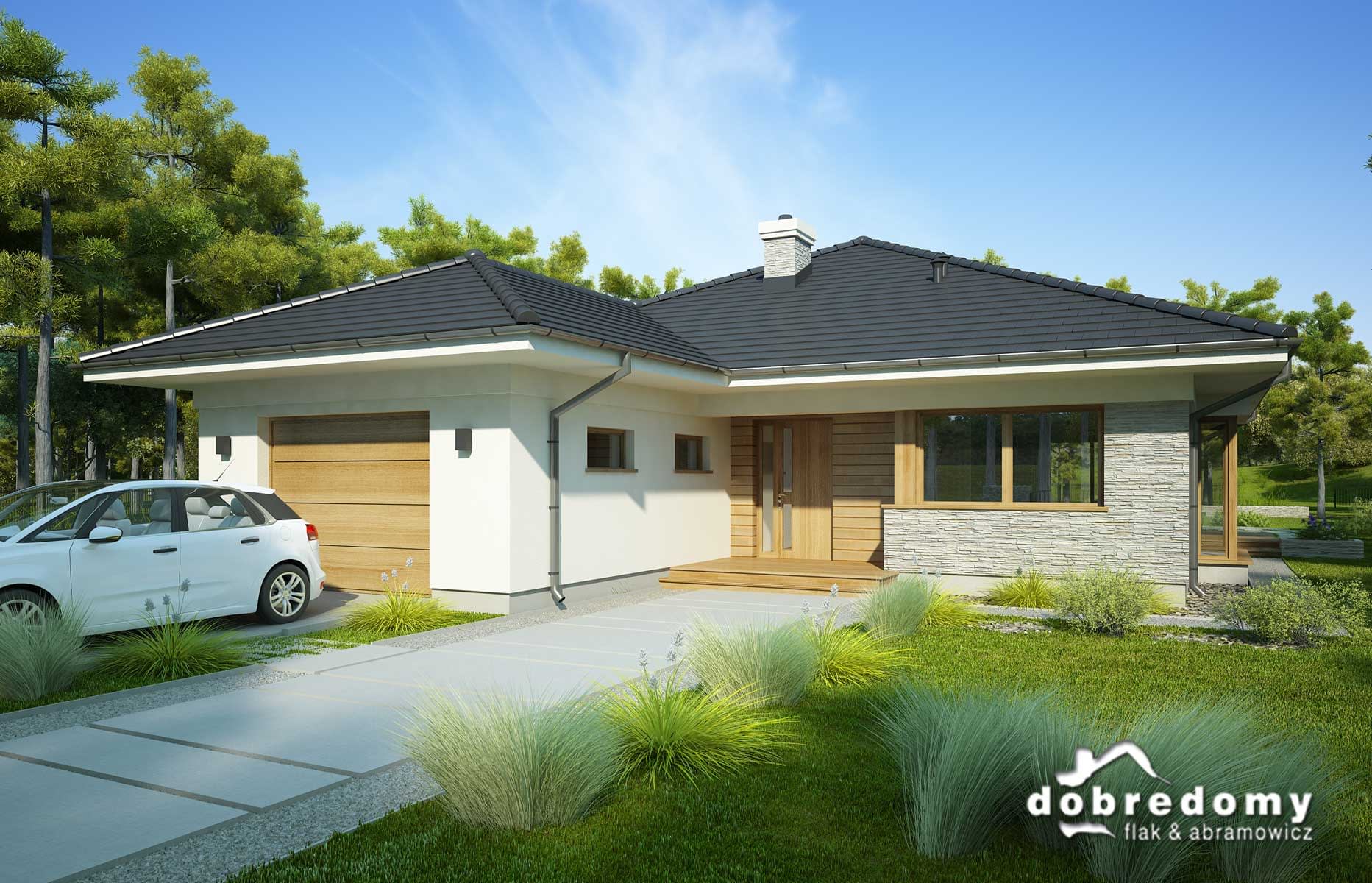 Projekt parterowego domu z garażem 1-stanowiskowym garażem i poddaszem nieużytkowym, które można w późniejszym czasie przystosować do zamieszkania. Część dzienna obejmuje pokój dzienny, jadalnię umieszczoną w pięknym, przeszklonym wykusz oraz kuchnię ze spiżarnią. Tuż przy wiatrołapie zaprojektowano pom. gosp i garaż. Strefa nocna domu to trzy sypialnie, garderoba i dwie łazienki.