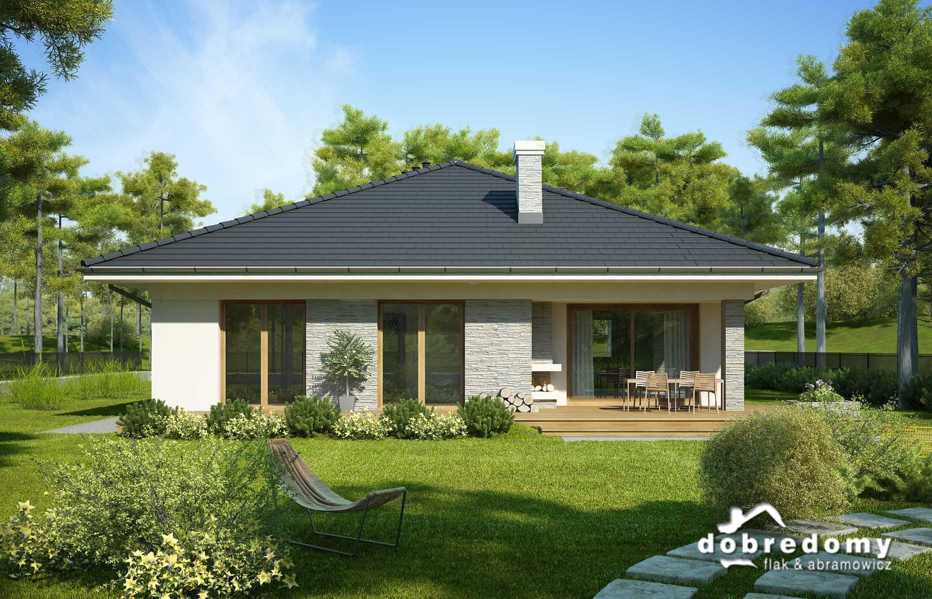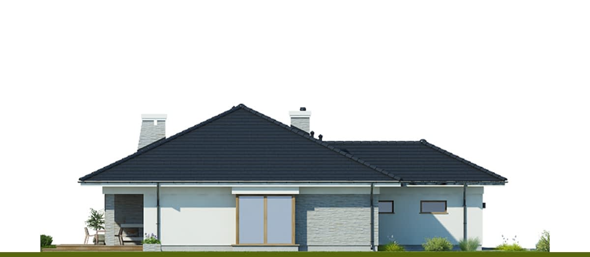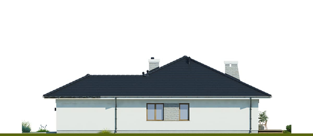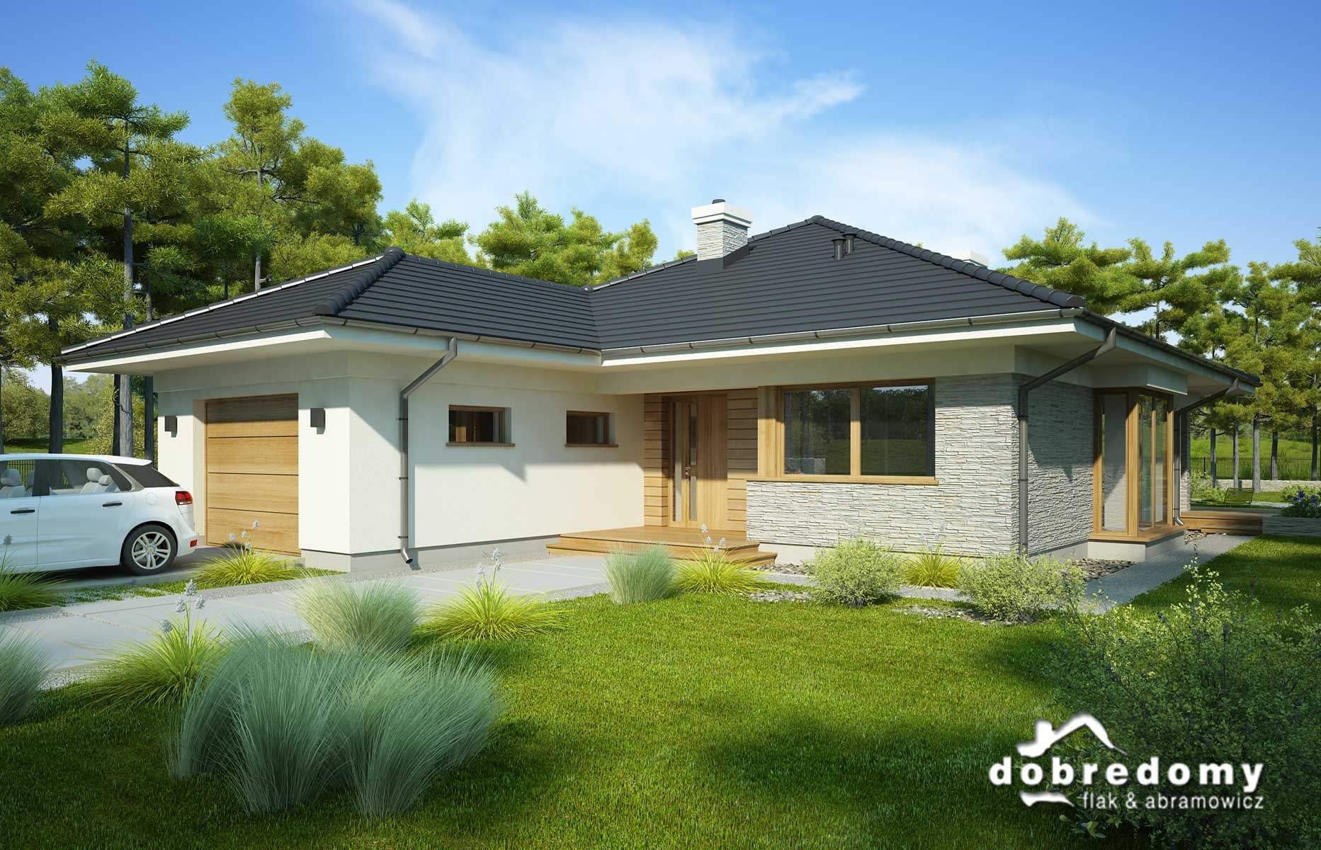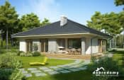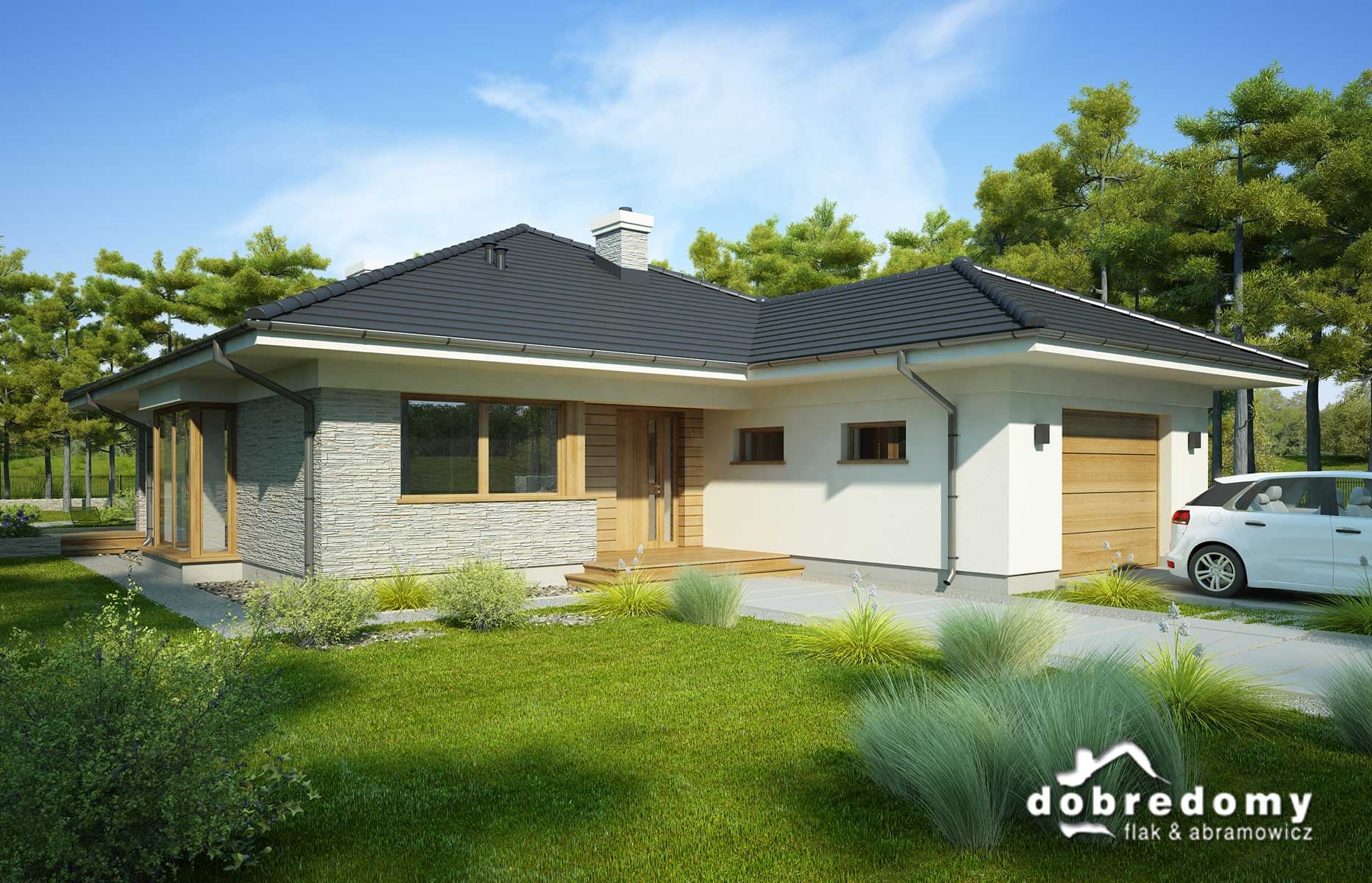 Projekt parterowego domu z garażem 1-stanowiskowym garażem i poddaszem nieużytkowym, które można w późniejszym czasie przystosować do zamieszkania. Część dzienna obejmuje pokój dzienny, jadalnię umieszczoną w pięknym, przeszklonym wykusz oraz kuchnię ze spiżarnią. Tuż przy wiatrołapie zaprojektowano pom. gosp i garaż. Strefa nocna domu to trzy sypialnie, garderoba i dwie łazienki.