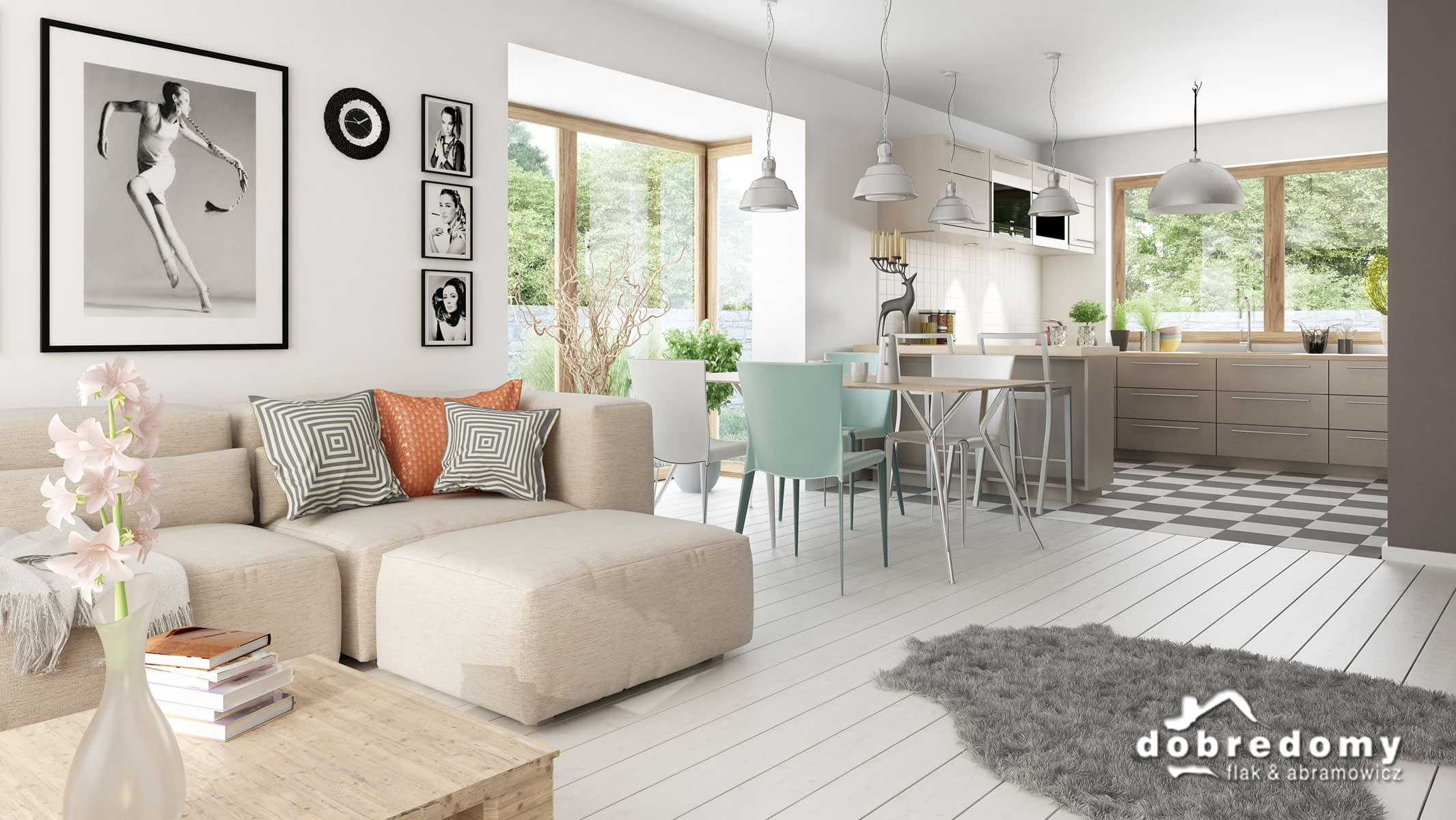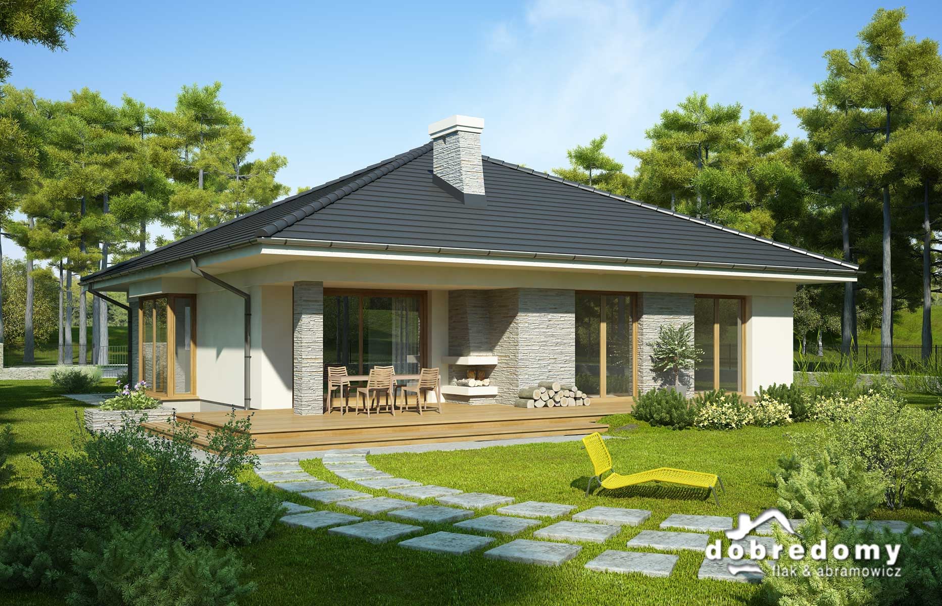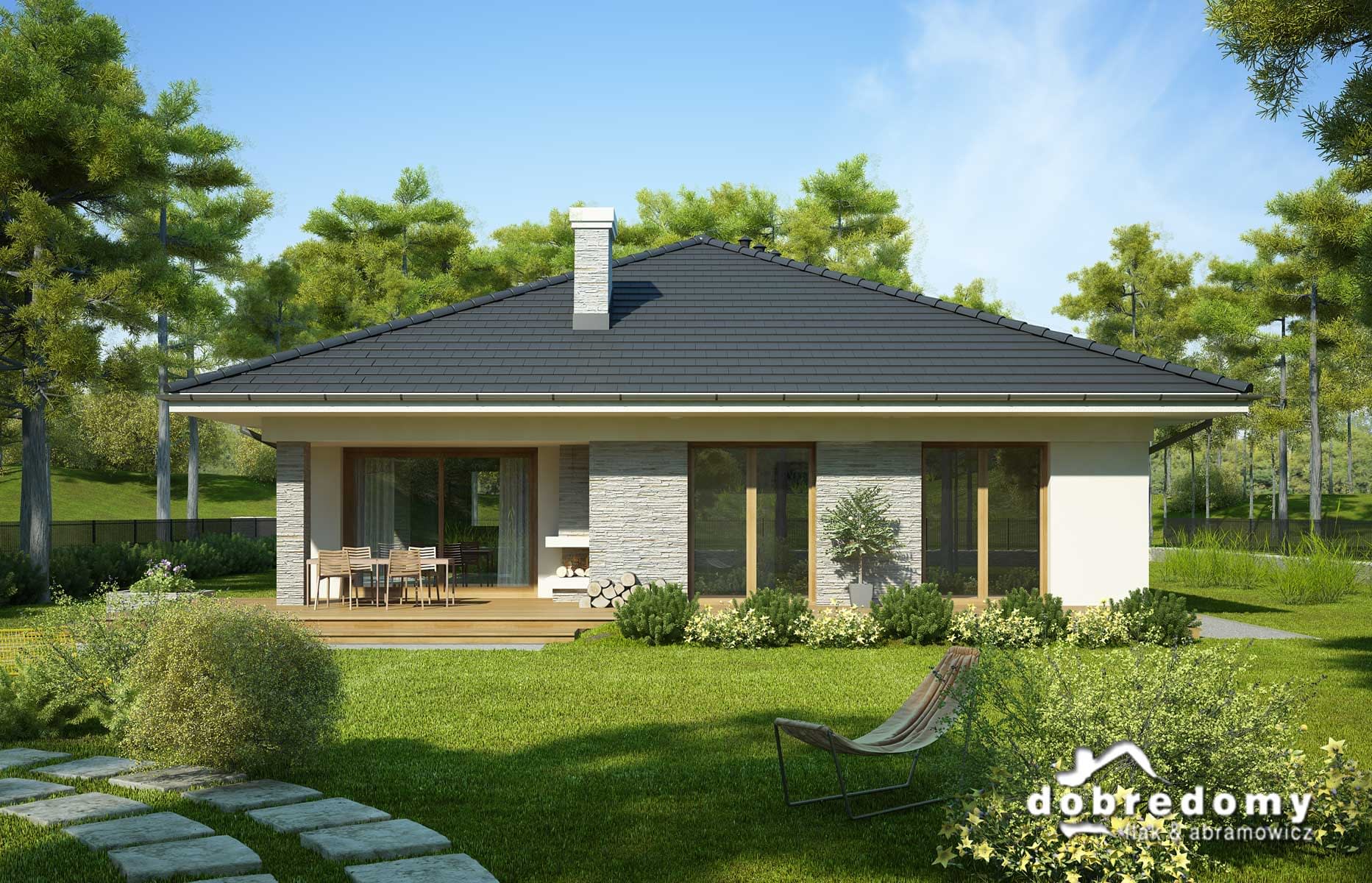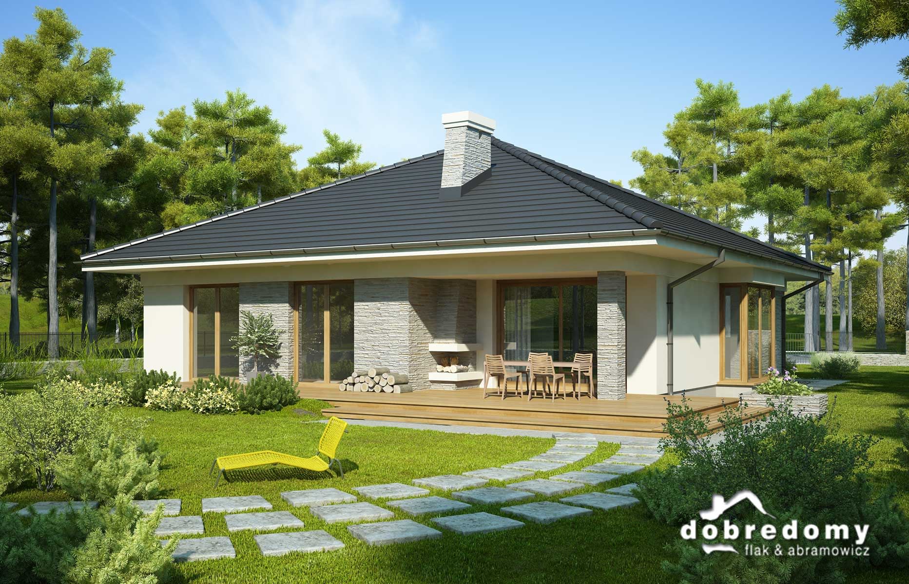 Projekt parterowego domu z garażem 1-stanowiskowym garażem i poddaszem nieużytkowym, które można w późniejszym czasie przystosować do zamieszkania. Część dzienna obejmuje pokój dzienny, jadalnię umieszczoną w pięknym, przeszklonym wykusz oraz kuchnię ze spiżarnią. Tuż przy wiatrołapie zaprojektowano pom. gosp i garaż. Strefa nocna domu to trzy sypialnie, garderoba i dwie łazienki.