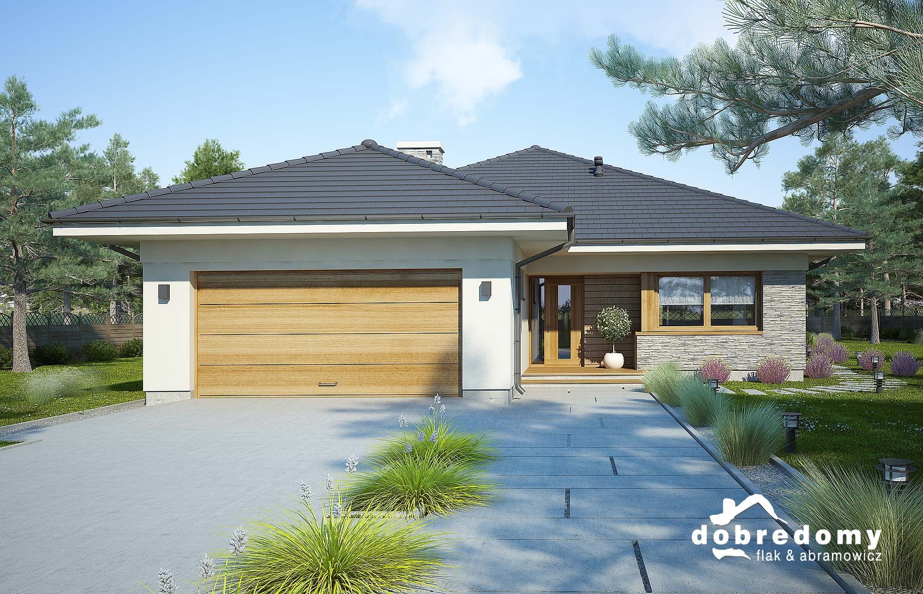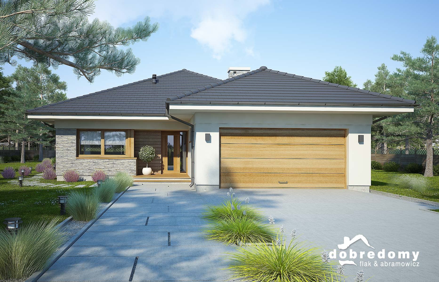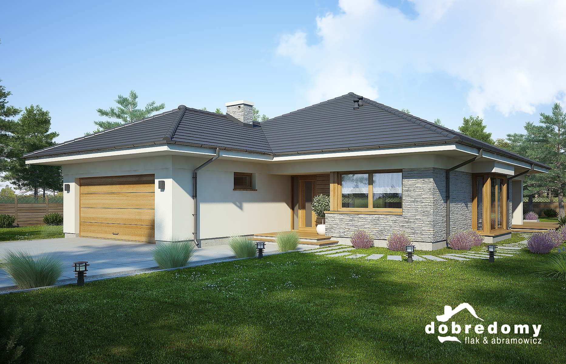 Projekt parterowego domu z garażem 2-stanowiskowym. Część dzienna obejmuje pokój dzienny, jadalnię umieszczoną w pięknym, przeszklonym wykusz oraz kuchnię ze spiżarnią. Tuż przy wiatrołapie zaprojektowano pom. gosp i garaż. Strefa nocna domu to trzy sypialnie (jedna z osobną łazienką i garderobą), pralnia i łazienka. Projekt dostępny jest w wersji bez garażu - Fabia; z garażem 1-st. - Fabia II i Fabia IV; z innym układem funkcjonalnym - Fabia VIII, Fabia IX i Fabia XI; oraz o mniejszej powierzchni użytkowej - Fabia III, Fabia V, Fabia VII i Fabia X.