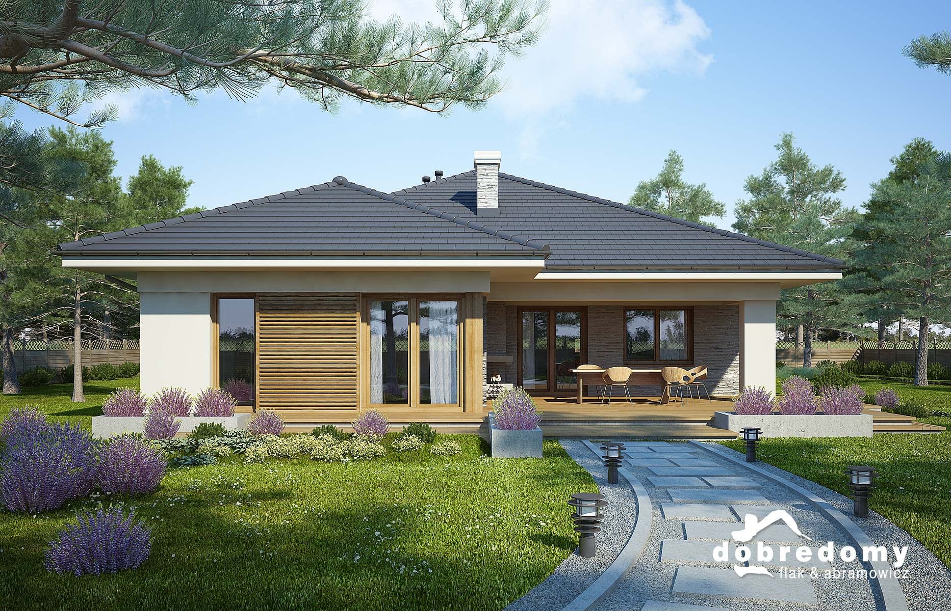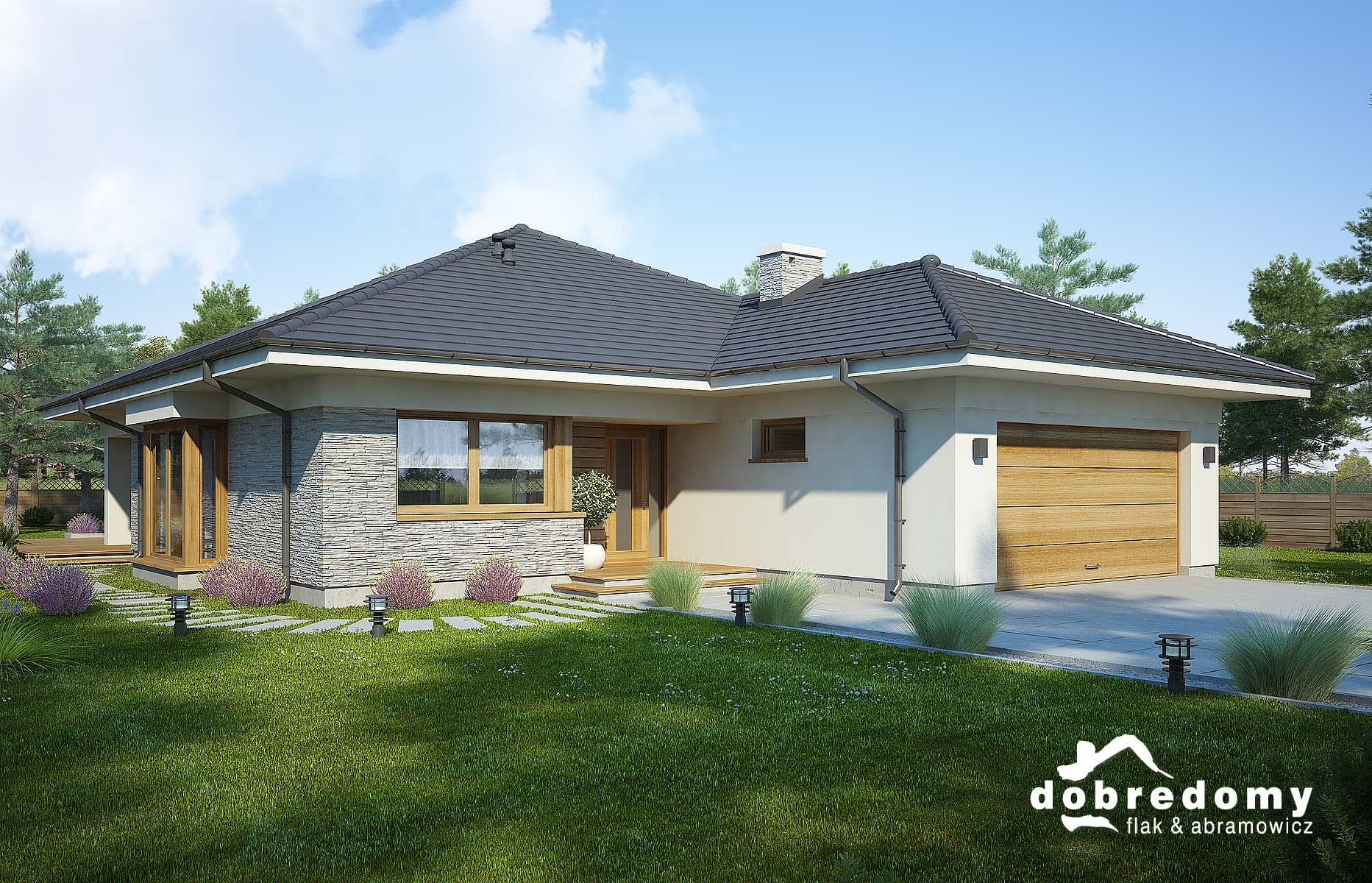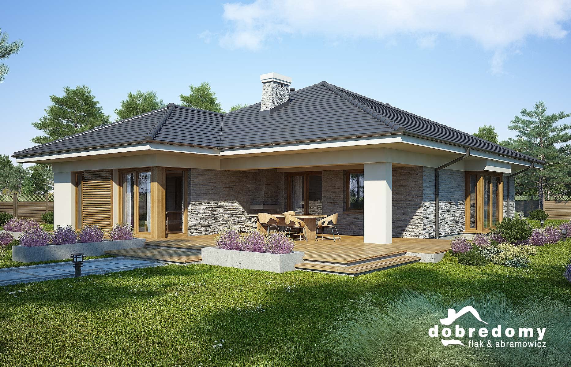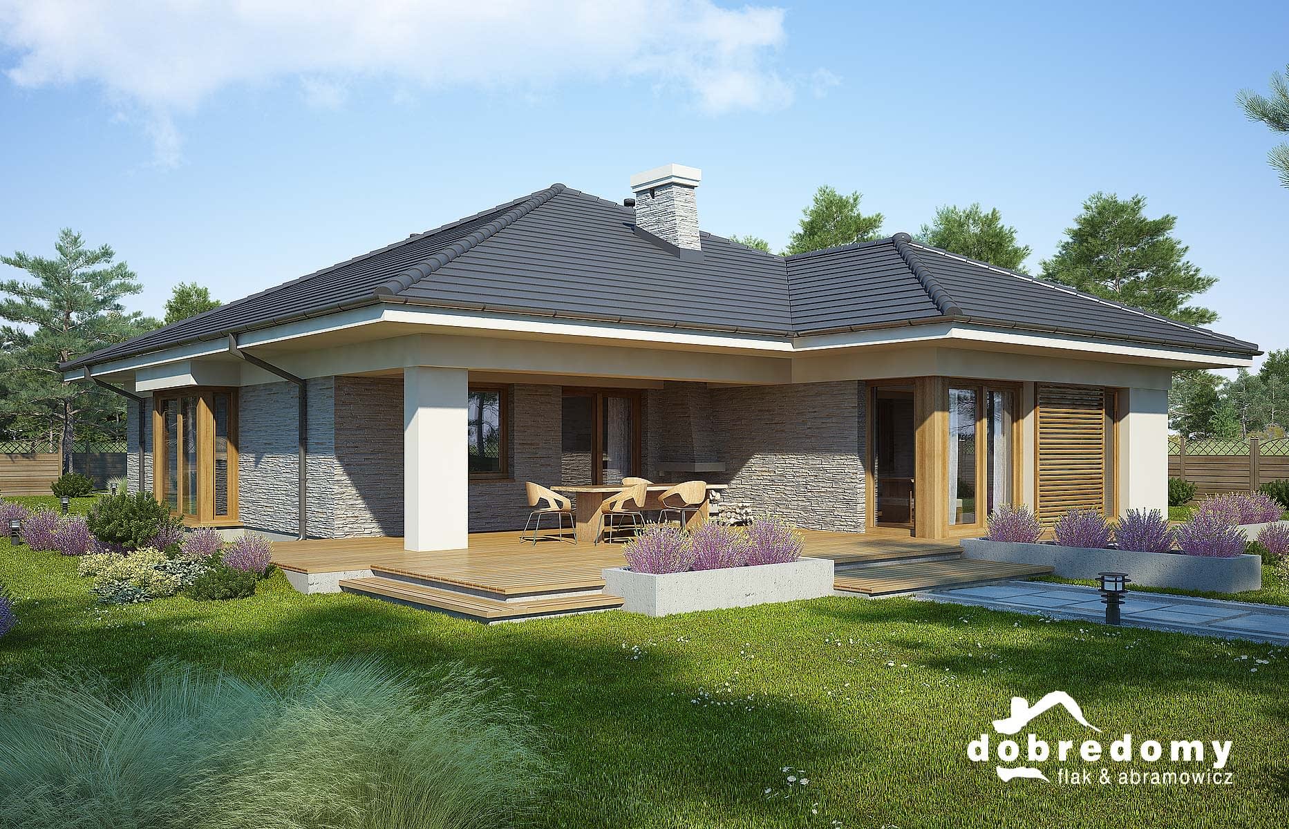 Elewacje pokryte tynkiem strukturalnym w systemie ociepleń Termo Organika oraz fragmentami okładziną drewnianą i kamienną. Pokrycie dachu - dachówka ceramiczna lub cementowa CREATON.