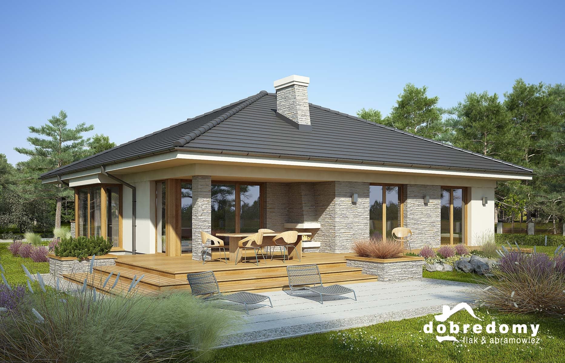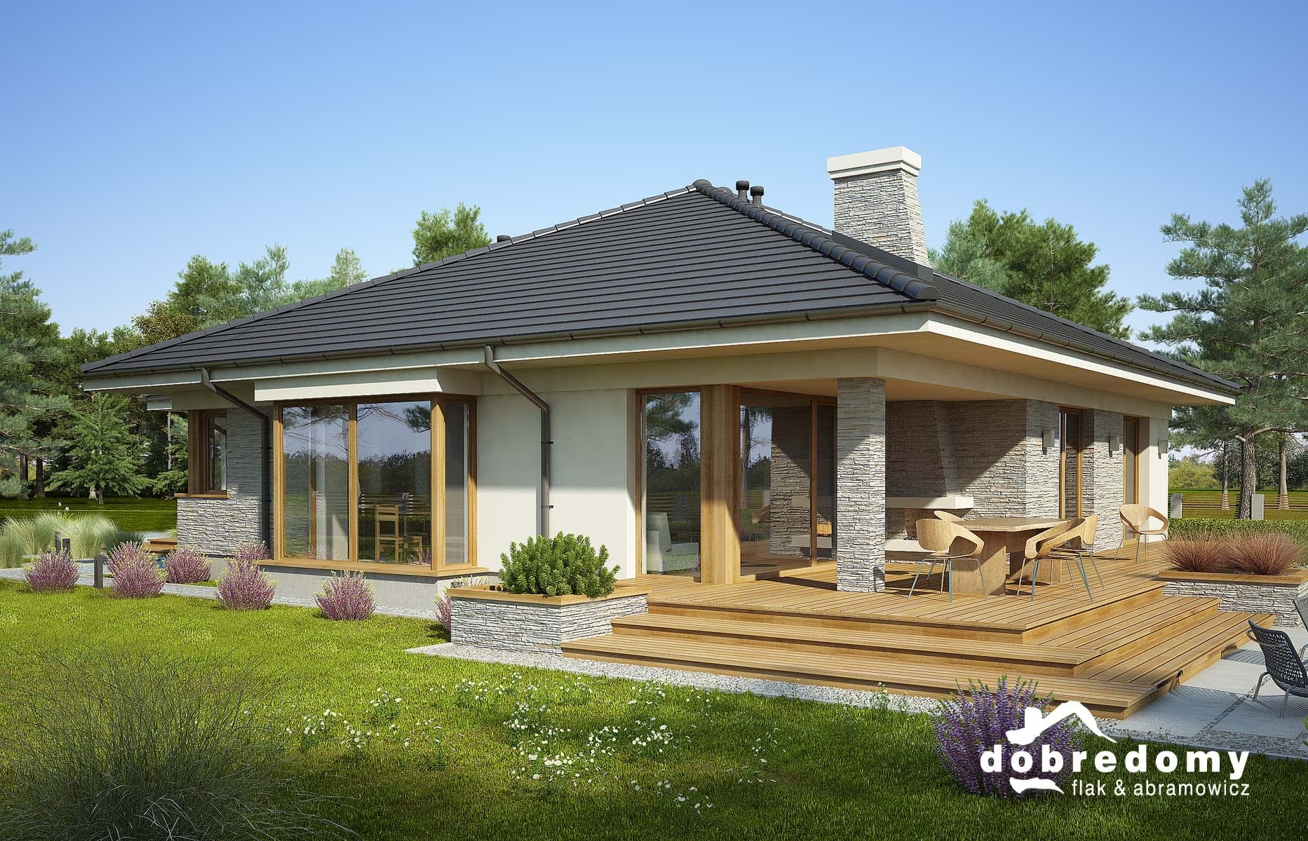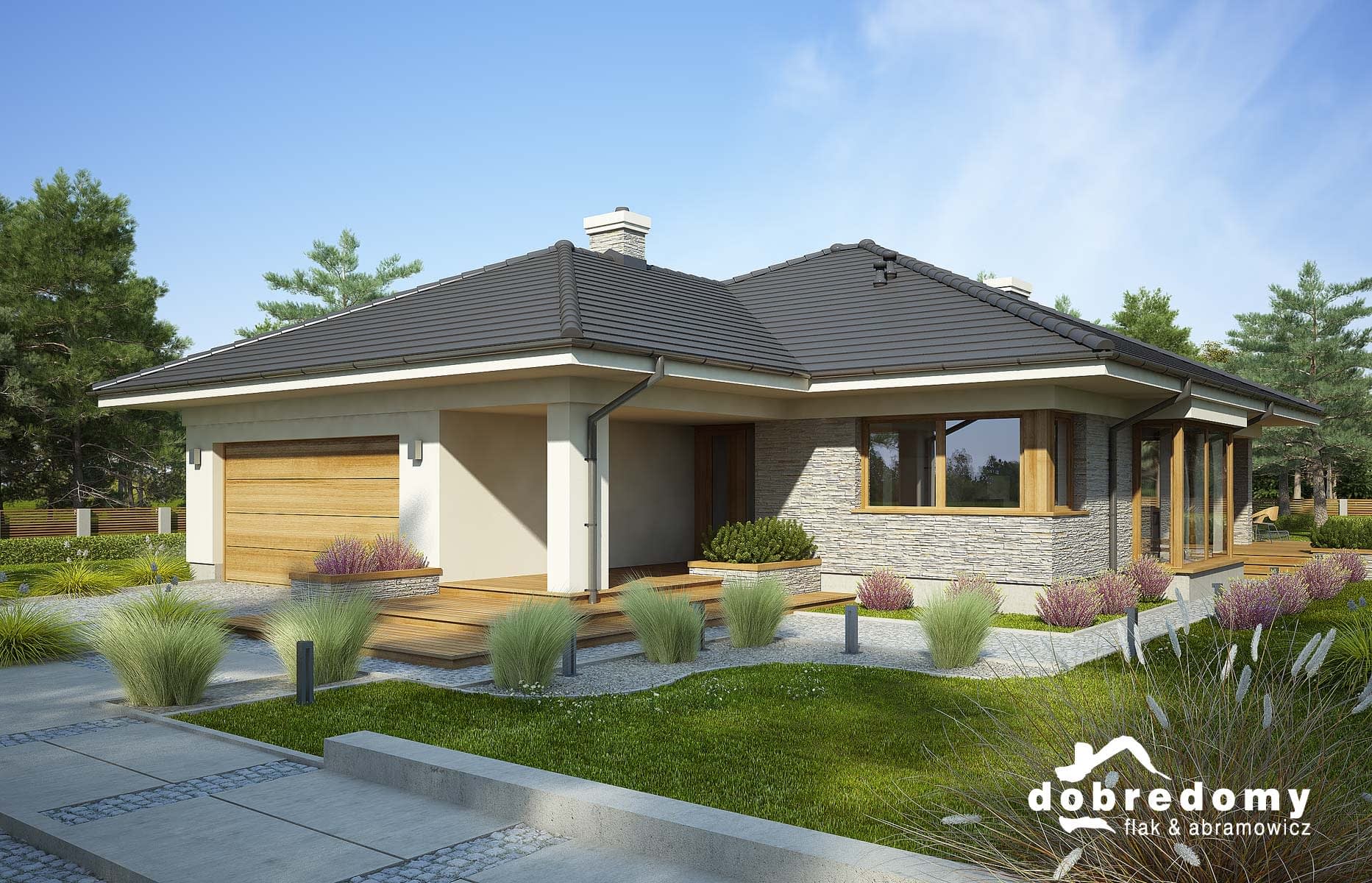 Projekt parterowego domu z garażem 2-stanowiskowym. Część dzienna obejmuje pokój dzienny, jadalnię umieszczoną w pięknym, przeszklonym wykusz oraz kuchnię ze spiżarnią. Tuż przy wiatrołapie zaprojektowano pom. gosp i garaż. Strefa nocna domu to trzy sypialnie, garderoba i dwie łazienki. Projekt dostępny w wersjach: z dachem dwuspadowym i takim samym układem pomieszczeń - Irys; w wersji bez garażu - Fabia; z garażem 1-st. - Fabia II i Fabia IV; z innym układem funkcjonalnym - Fabia III, Fabia V i Fabia X; o większej powierzchni użytkowej - Fabia VI, Fabia VIII, Fabia IX i Fabia XI.