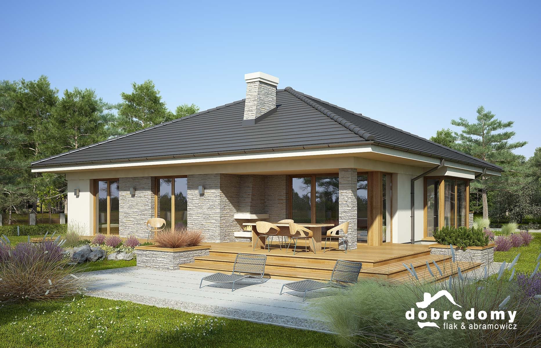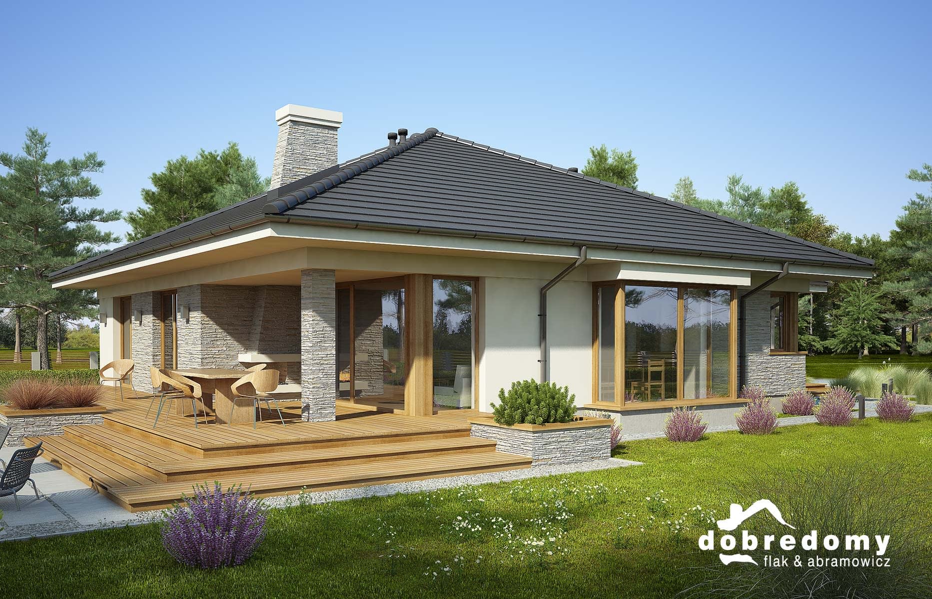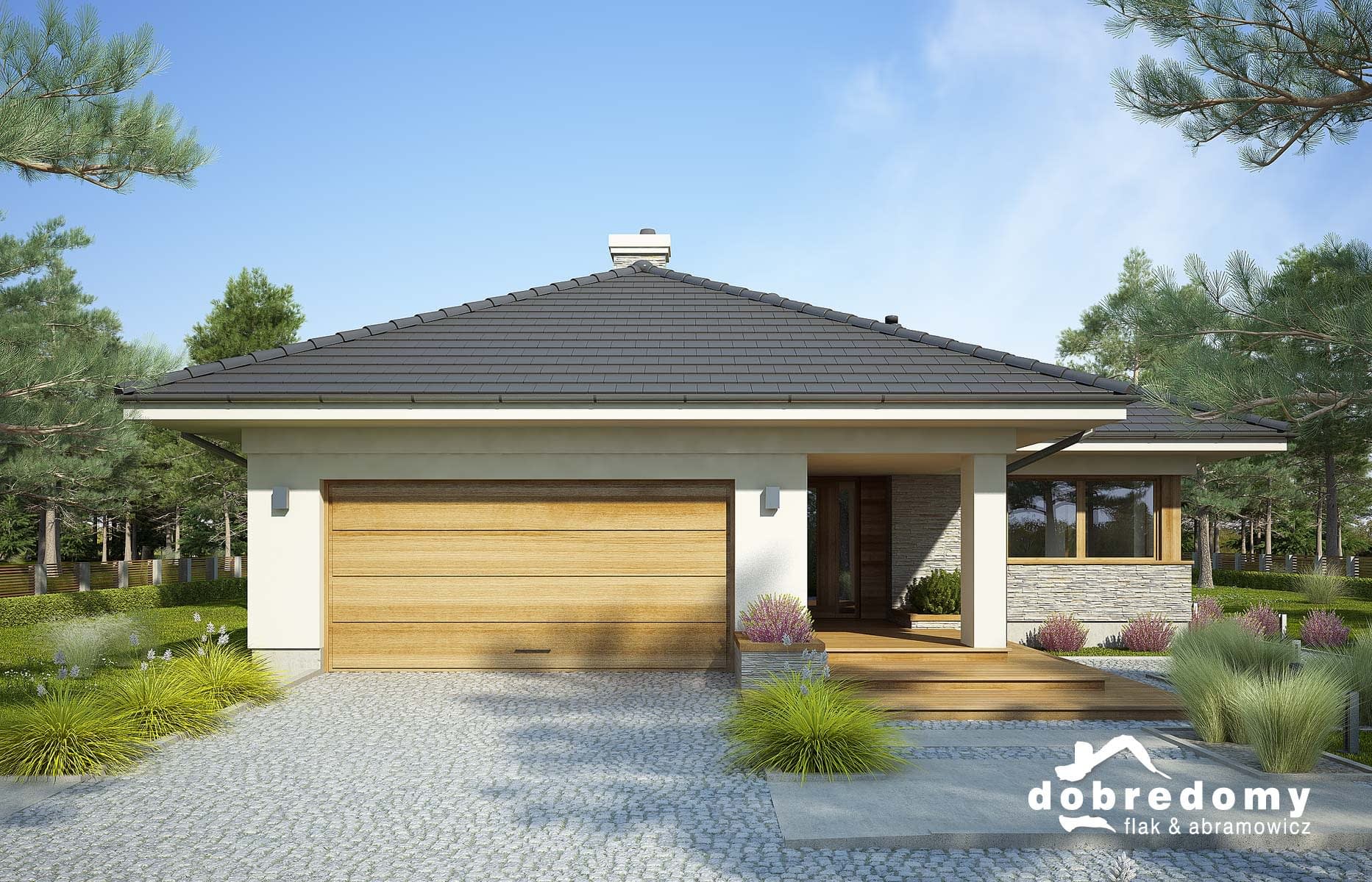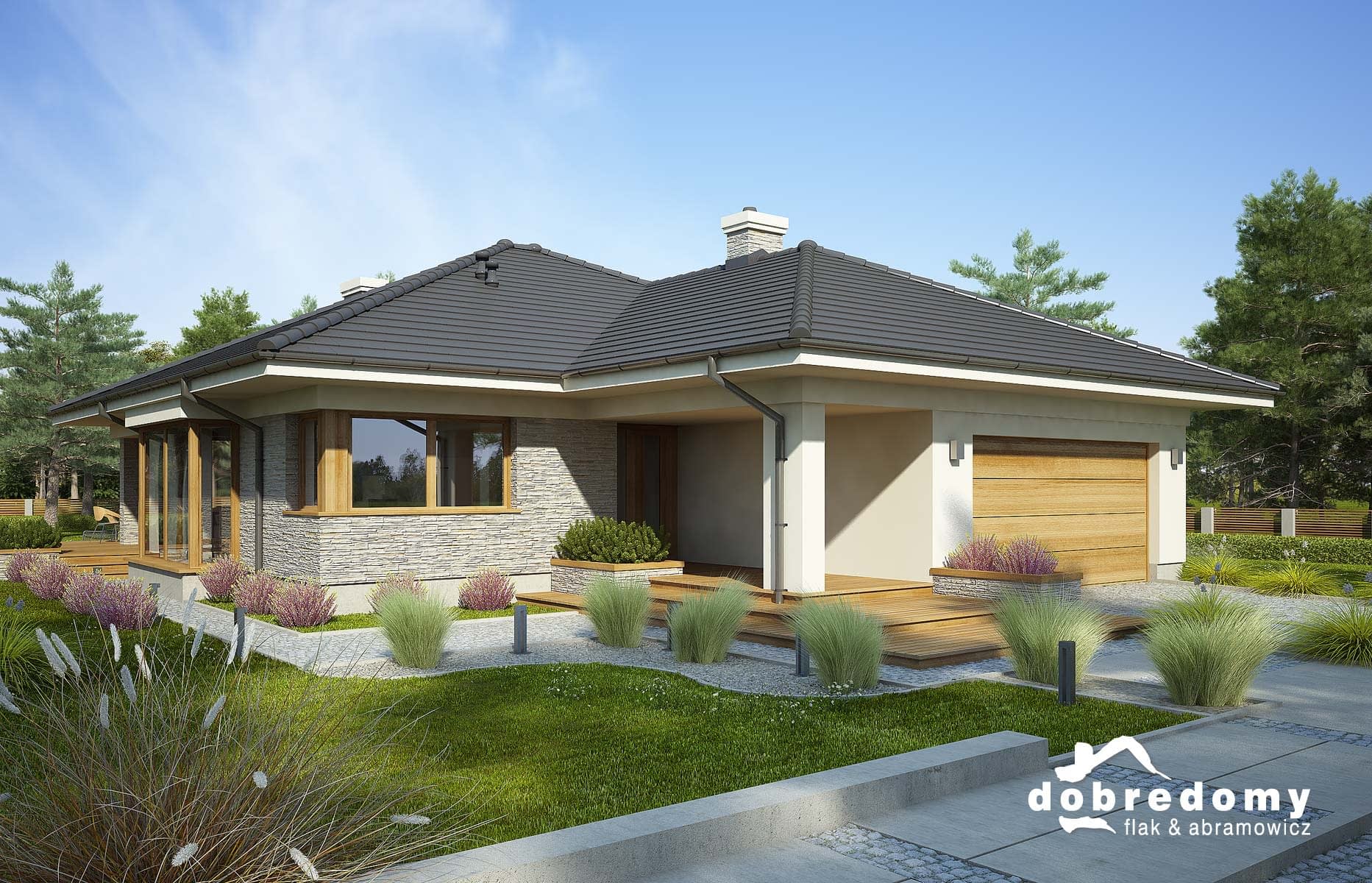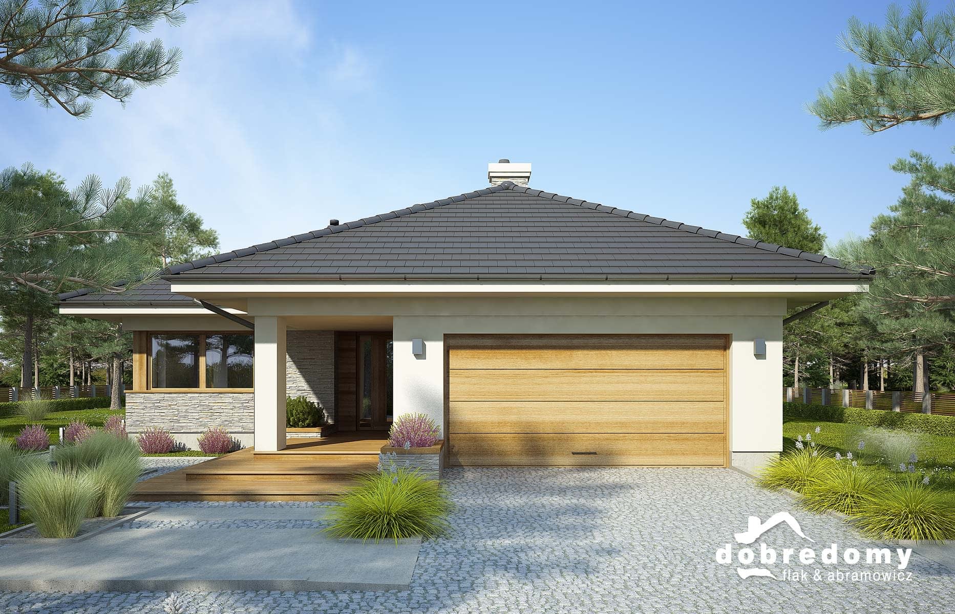 Elewacje pokryte tynkiem strukturalnym w systemie ociepleń Termo Organika oraz okładziną drewnianą i kamienną. Pokrycie dachu - dachówka ceramiczna lub cementowa CREATON.