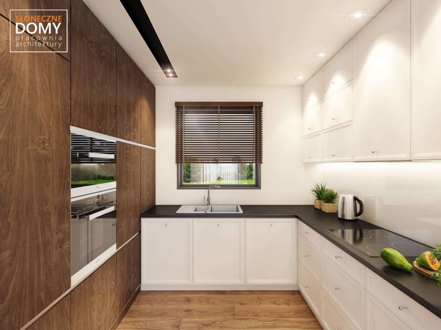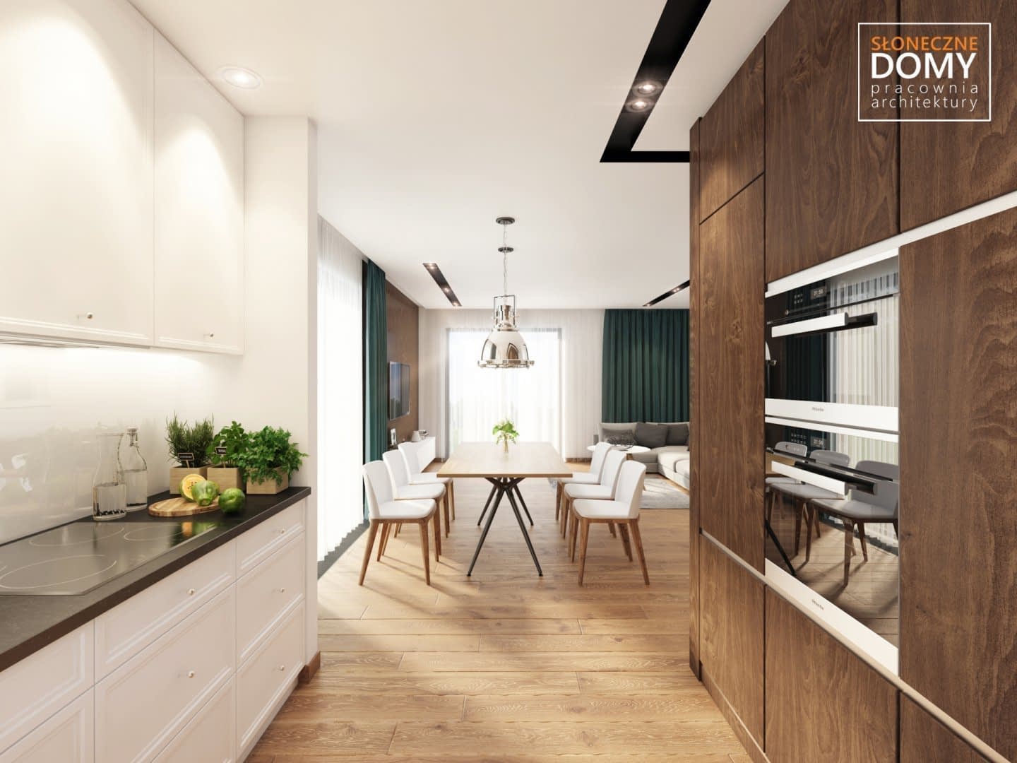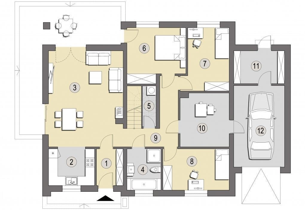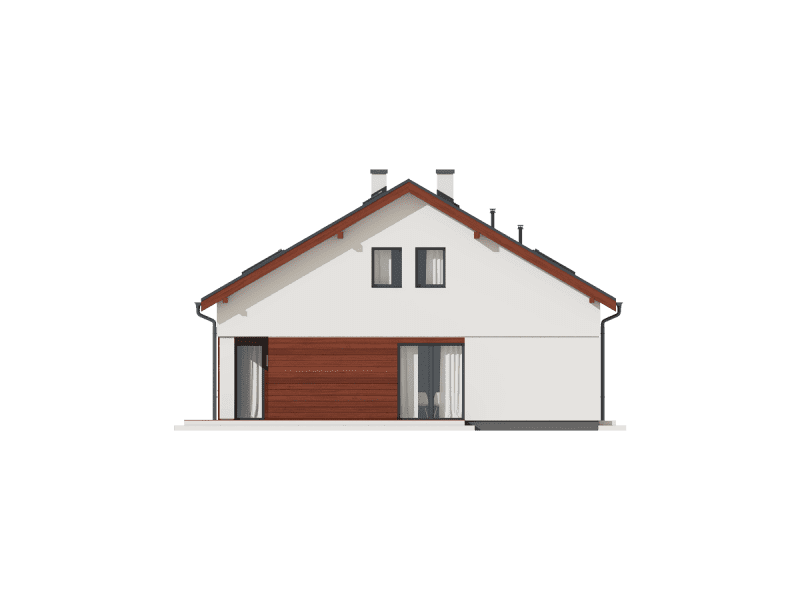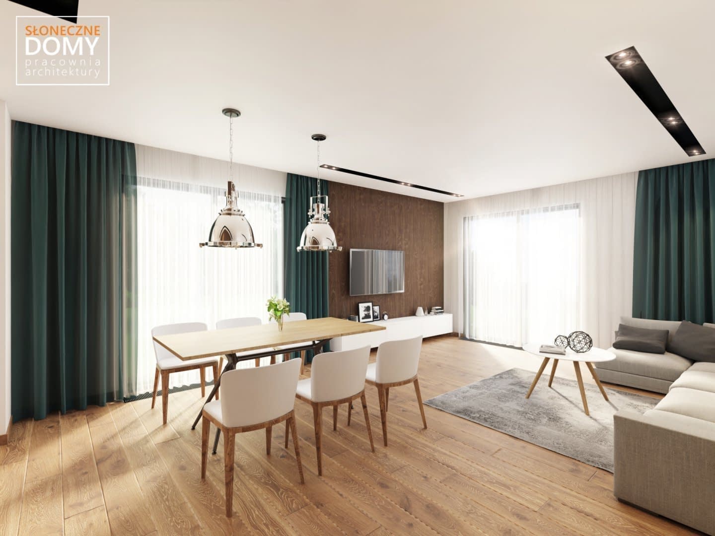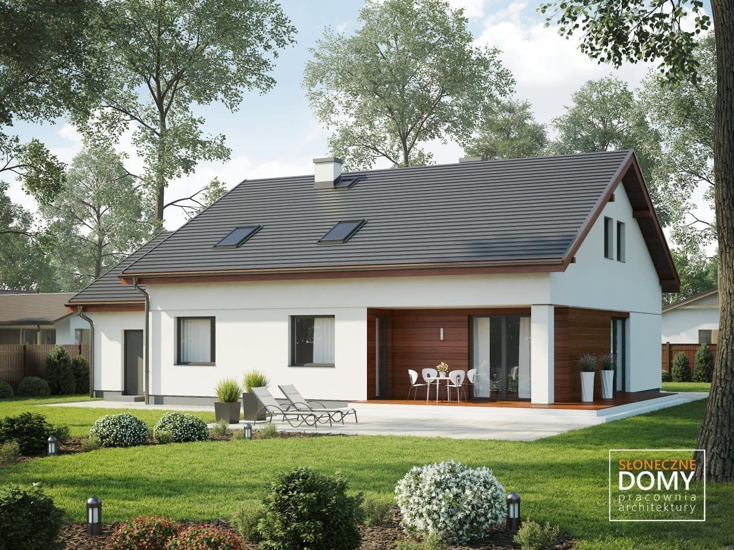 Układ pomieszczeń został podzielony na dwie strefy: dzienną i nocną. W części dziennej zaprojektowano wiatrołap, otwartą kuchnię oraz salon i jadalnię. Pokój dzienny i jadalnia płynnie łączą się z ogrodem dzięki częściowo zadaszonemu, okazałemu tarasowi. Dodatkową zaletą jest centralnie usytuowany kominek, zapewniający optymalne ogrzewanie tej strefy.