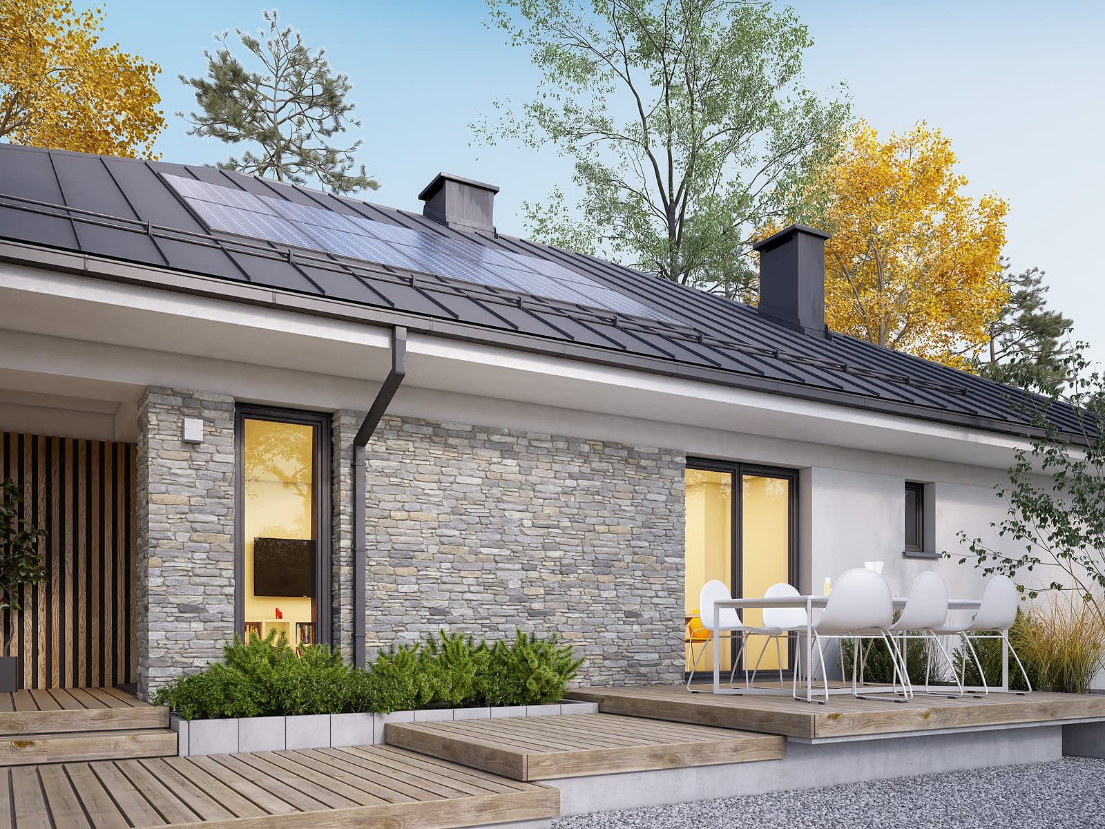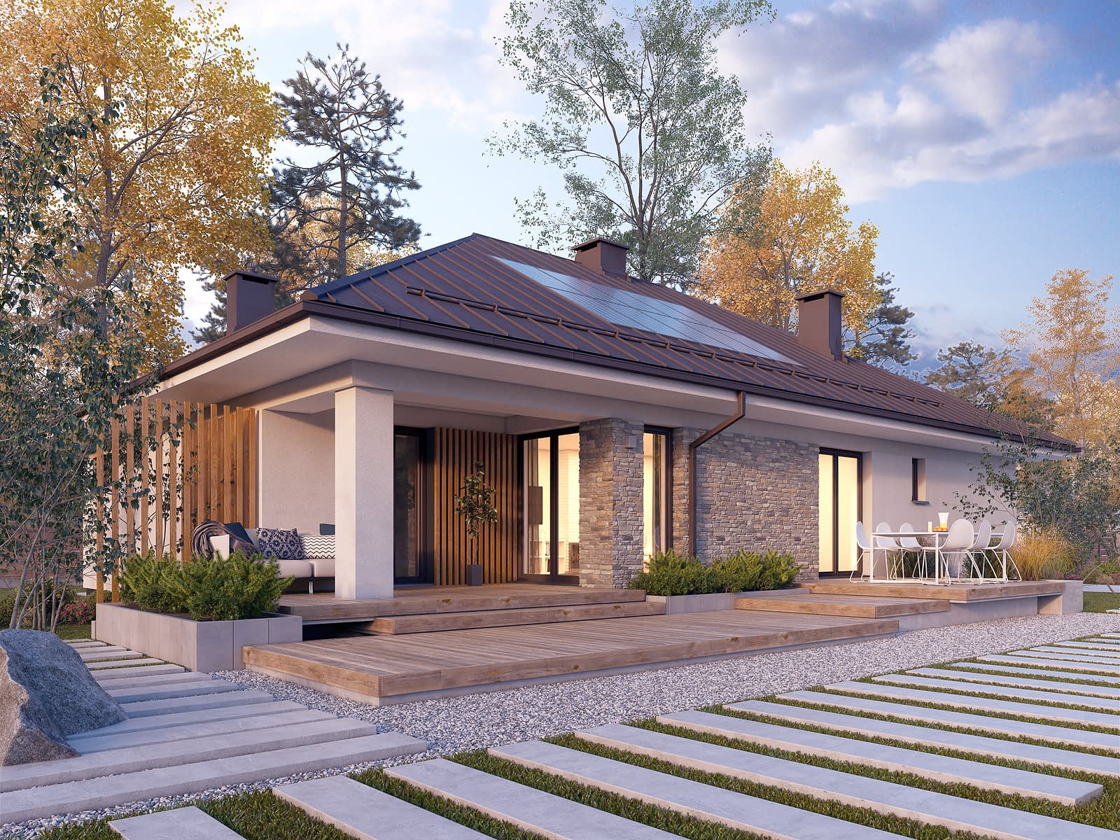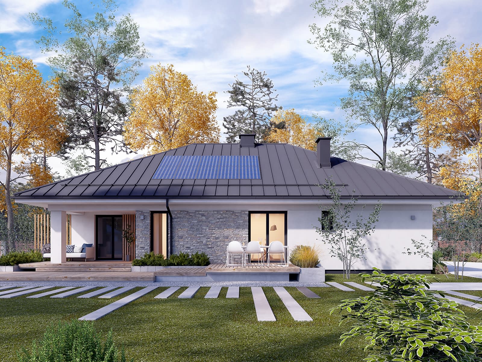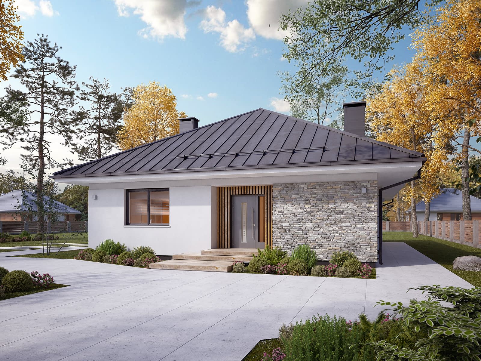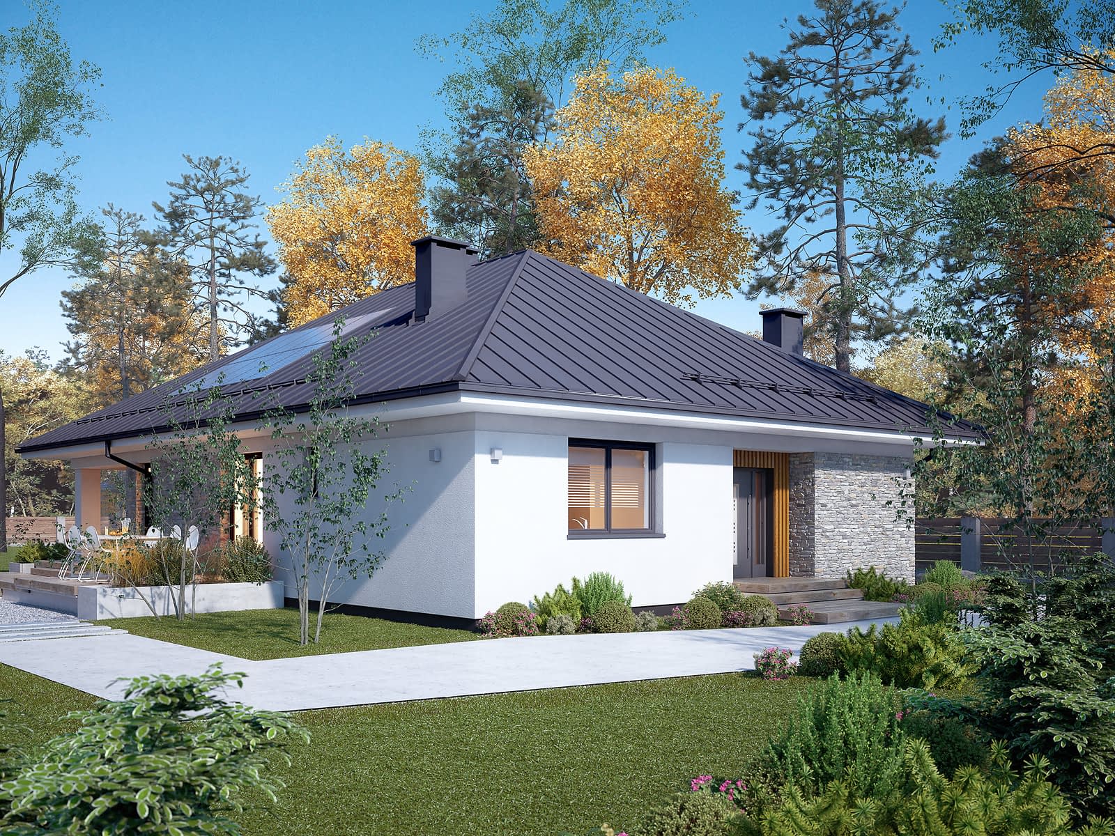 Feniks 3 to projekt domu parterowego przeznaczony dla 4-osobowej rodziny. Zwarta nowoczesna bryła daje możliwość usytuowania budynku na wąskiej działce. Układ funkcjonalny domu zapewnia swobodę poruszania się po budynku, przy jednoczesnym zapewnieniu prywatności wszystkim domownikom. Duża kuchnia z wyspą i spiżarnią tworzy doskonałą przestrzeń do wygodnego przygotowywania i spożywania posiłków. Główna sypialnia zapewnia gospodarzom większy komfort użytkowania dzięki prywatnej garderobie i łazience. Projekt przewiduje dużą ilość przestrzeni magazynowej, która poprawia walory użytkowe mieszkania. Dodatkowym atutem jest zadaszony taras.Konstrukcja