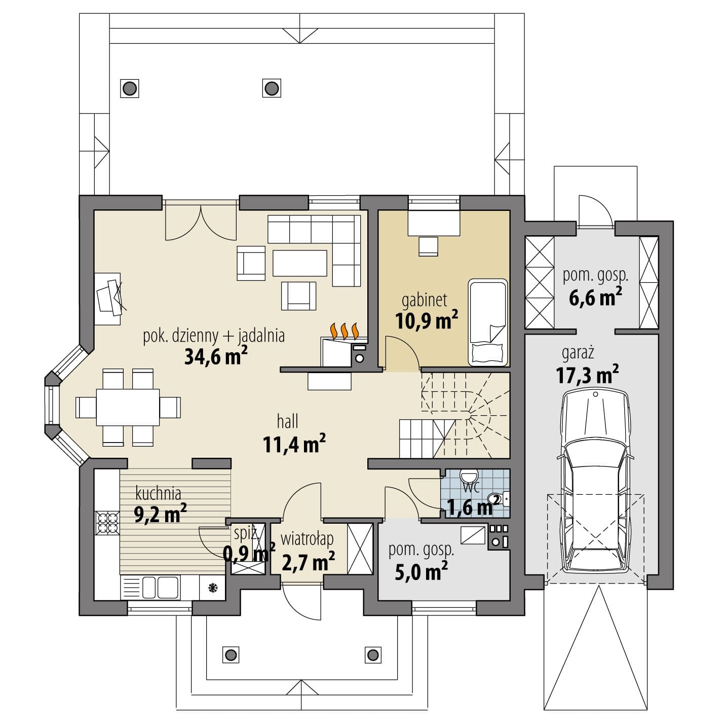 Niewielki dom z uzytkowym poddaszem, przeznaczony dla 4-osobowej rodziny. Zaleta jego jest przestronny pokój dzienny z kominkiem, połaczony funkcjonalnie z jadalnia. Taras ogrodowy jest czesciowo zadaszony, co pozwala na korzystanie z niego podczas deszczowej pogody. Dzieki prostym rozwiazaniom konstrukcyjnym i nieskomplikowanej bryle jest on niedrogi w budowie i eksploatacji. Projekt dostepny w wersji bez garazu - Feniks III.