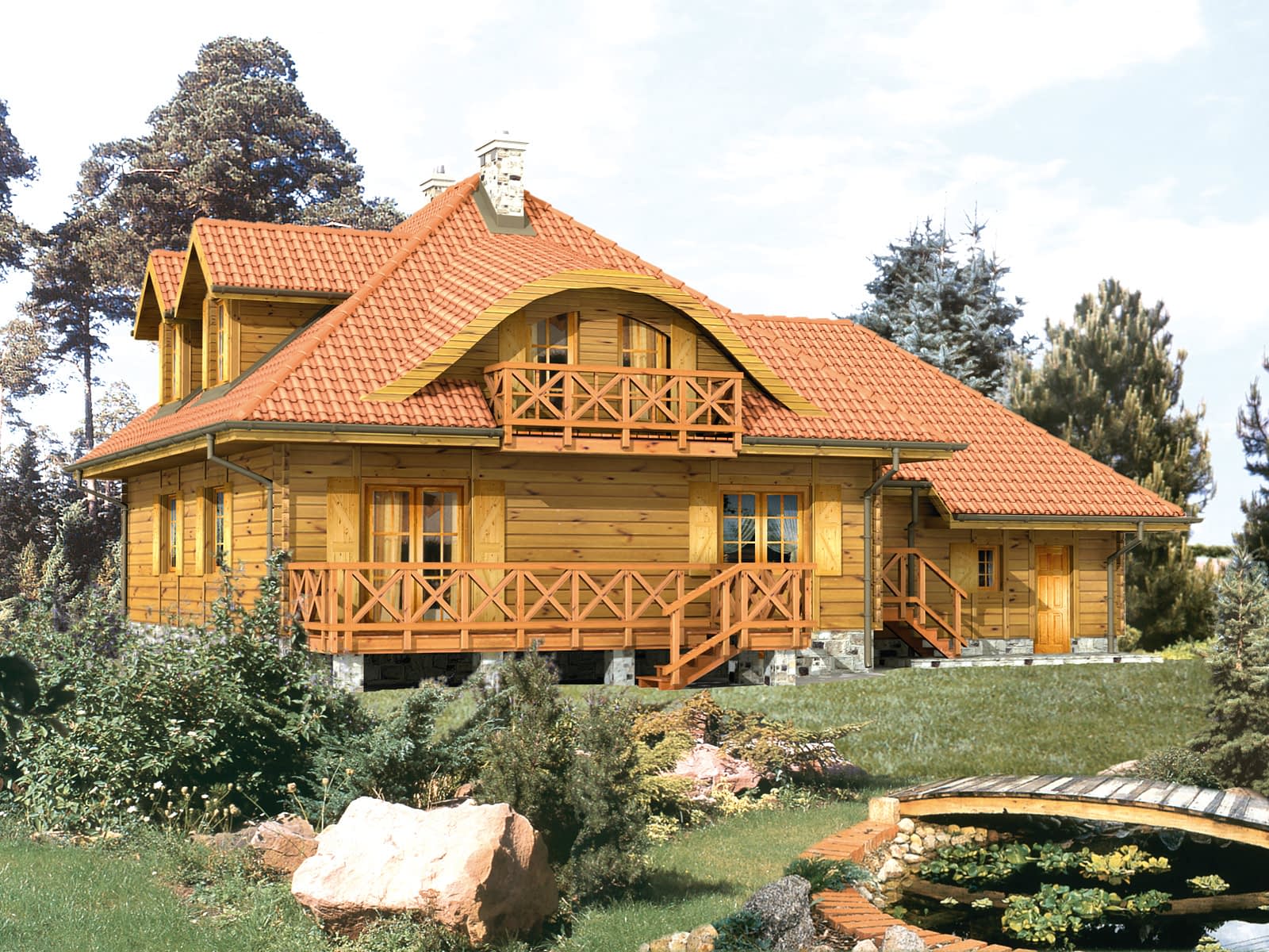 Ściany: drewniane, szkieletowe, Stropy: na belkach drewnianych, Dach: dachówka ceramiczna CREATON, kąt nachylenia 40° i 25°Rzuty