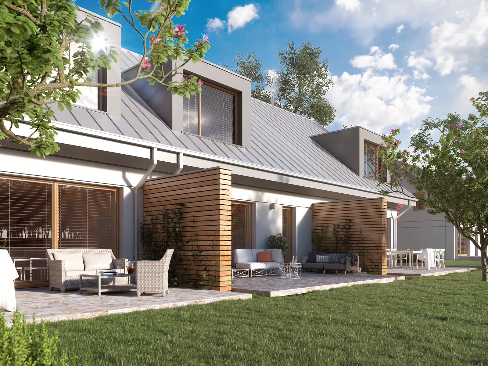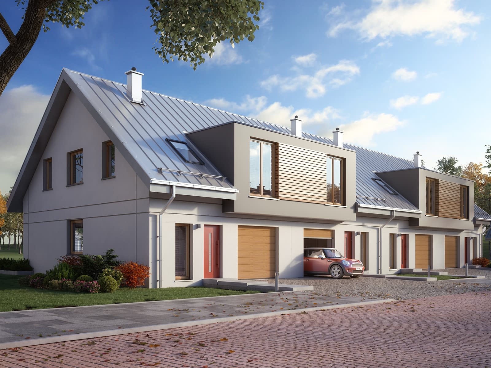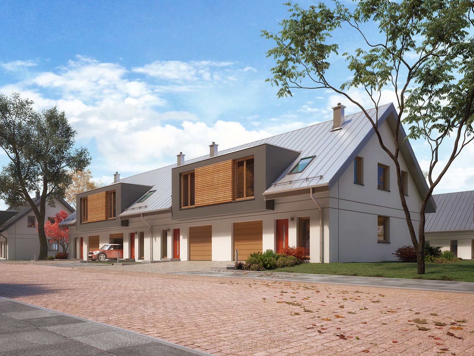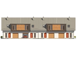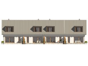 Fidżi to projekt domu przeznaczony do zabudowy szeregowej, który łączy nowoczesną stylistykę z funkcjonalnością wnętrz. Prosta bryła budynku została przykryta dwuspadowym dachem, który urozmaicają prostokątne lukarny. Jasna elewacja idealnie współgra ze stolarką w kolorze naturalnego drewna oraz z dachem pokrytym blachą w jasnym kolorze. Każdy segment budynku posiada układ funkcjonalny podzielony na strefę dzienną na parterze oraz nocną na poddaszu. Na parterze zaprojektowano salon, który płynnie łączy się z jadalnią oraz kuchnią, tworząc otwartą przestrzeń do wspólnego spędzania czasu wraz z rodziną. Uzupełnieniem układu funkcjonalnego na parterze jest nieduża łazienka oraz przedsionek z przejściem do jednostanowiskowego garażu. Na strefę nocną na poddaszu składają się trzy sypialnie oraz rodzinna łazienka. Dodatkowo dwie sypialnie posiadają dostęp do wydzielonej garderoby. Okna w szczycie budynku oraz wysokie przeszklenia w lukarnach zapewniają dużą ilość naturalnego światła każdemu z pomieszczeń na poddaszu.Konstrukcja