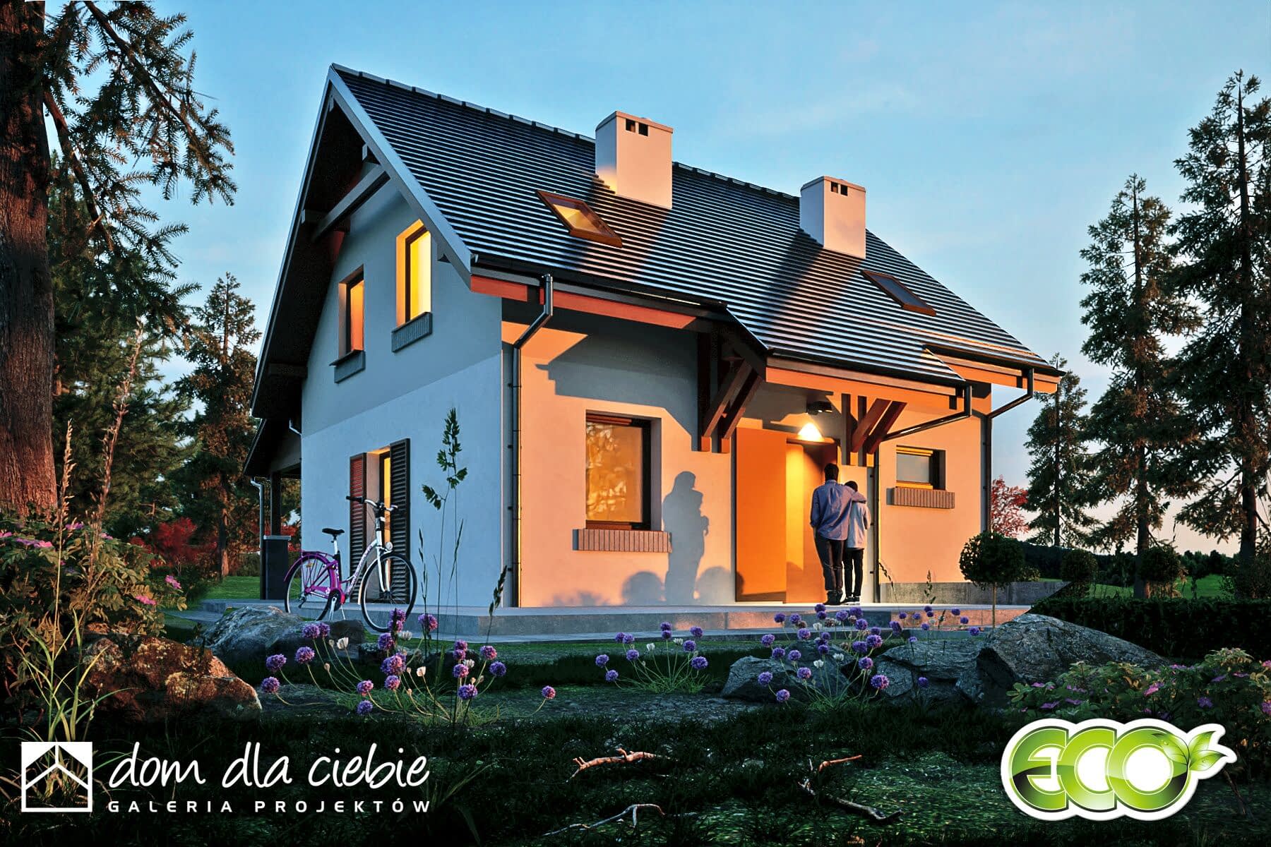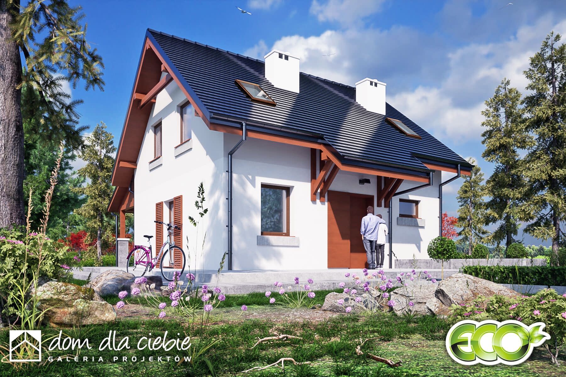 Ekonomiczny, projekt niewielkiego domu jednorodzinnego z dwuspadowym dachem. Figa przewidziana jest dla czteroosobowej rodziny. Jest to propozycja projektu do 70 m2 powierzchni zabudowy nie licząc zadaszonego tarasu. Główne, zadaszone wejście prowadzi do wiatrołapu. Stąd można dostać się do pomieszczenia technicznego oraz do mieszkalnej części dziennej. Pod częścią biegu schodowego zaprojektowano łazienkę. Z salonem połączony jest gabinet. Kuchnia jest otwarta i posiada niewielka spiżarnię. W centralnej części domu zaprojektowano kominek. Obok kuchni przewidziano miejsce na stół. Z salonu wchodzi się schodami na poddasze, gdzie zlokalizowano trzy niewielki sypialnie oraz łazienkę z pralką.Figa to propozycja ekonomicznego i ekologicznego domu, który doskonale sprawdzi się jako dom całoroczny.
