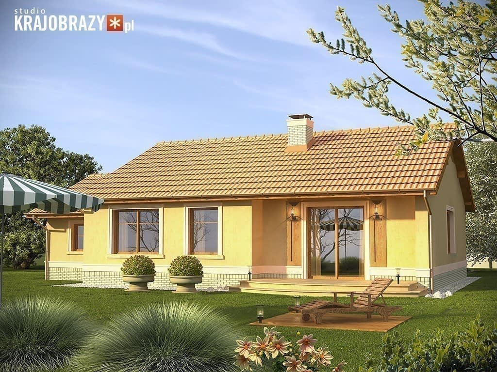 Projekt domu Figaro jest propozycją taniej w realizacji parterówki z dachem dwuspadowym i dostepnej w dwóch wariantach: z garażem jednostanowiskowym oraz bez garażu, a także w odbiciu lustrzanym. Frontową elewację ozdabia motyw eleganckiego szczytu z oknem od sypialni oraz osłonięte podcieniem wejście. Dwuskrzydłowe okno balkonowe wychodzące na taras w salonie połączy optycznie wnętrze domu z ogrodem. Program funkcjonalny tego domu o pow. 100m2 jest imponujący: oprócz salonu z otwartą kuchnią udało się zmieścić aż cztery pokoje w wydzielonej strefie nocnej. Do dyspozycji domowników jest też duża łazienka, pomieszczenie gospodarcze i miejsce na szafę w wiatrołapie.Rzuty