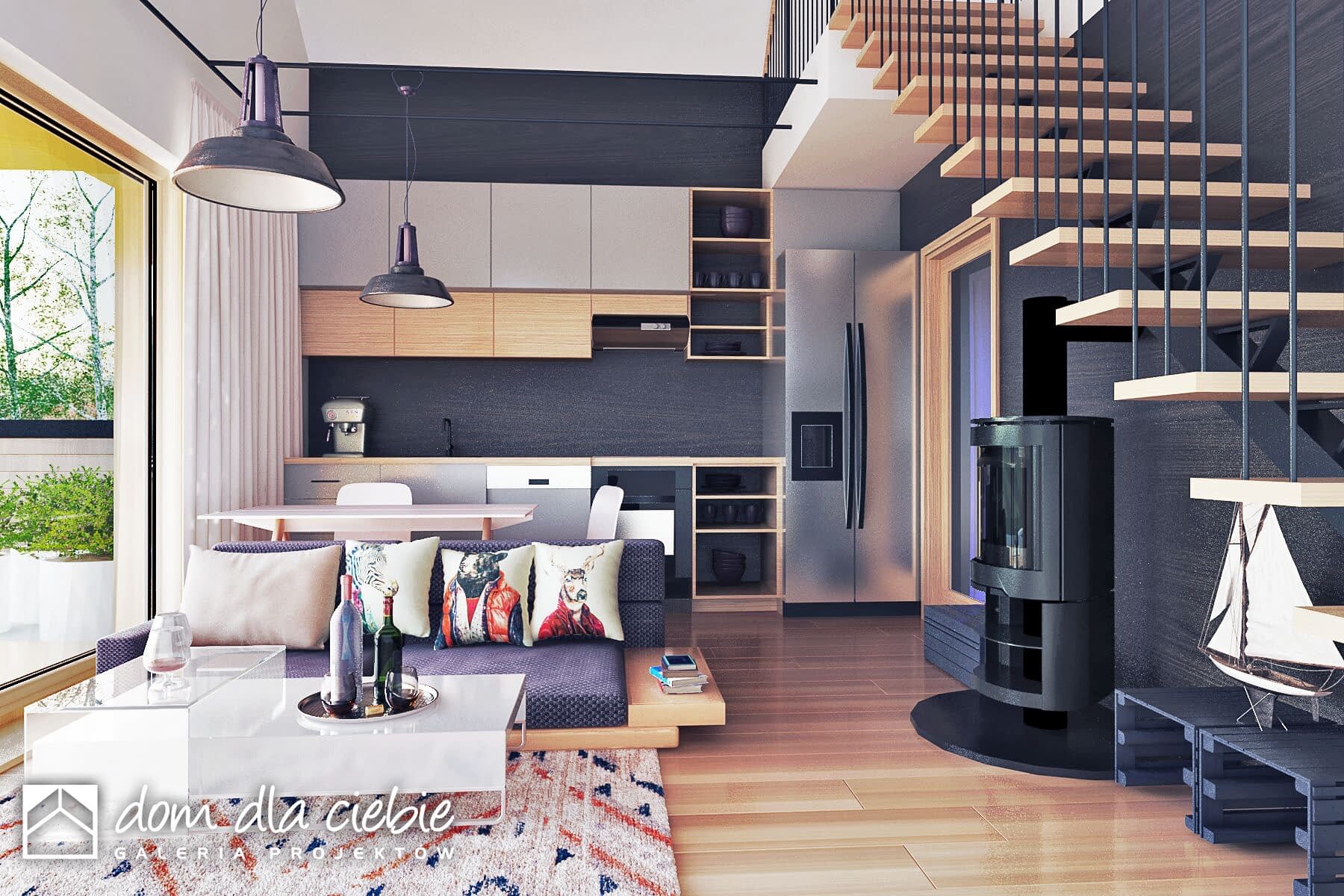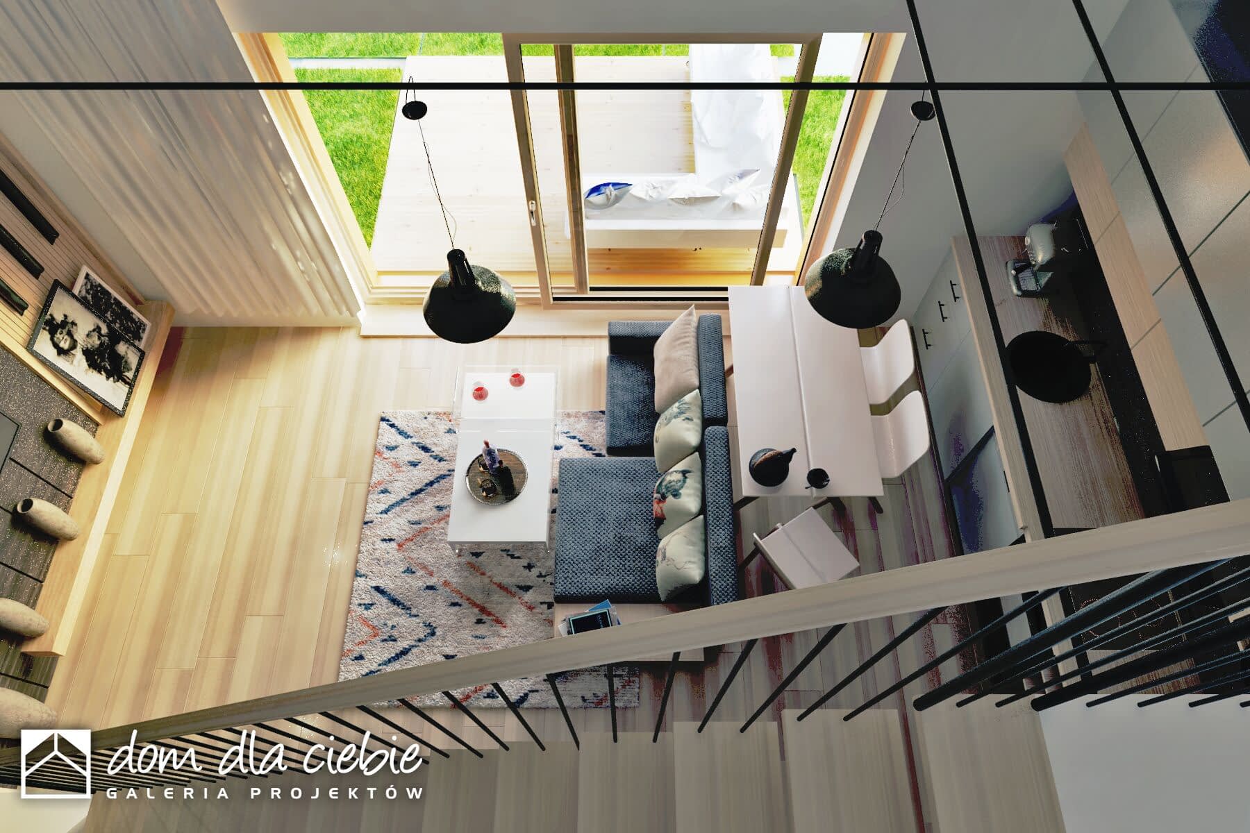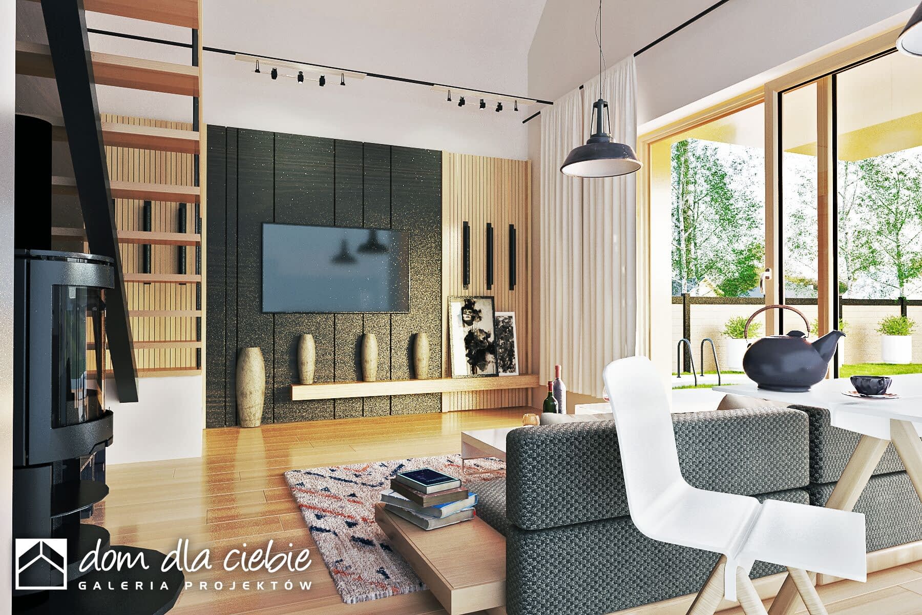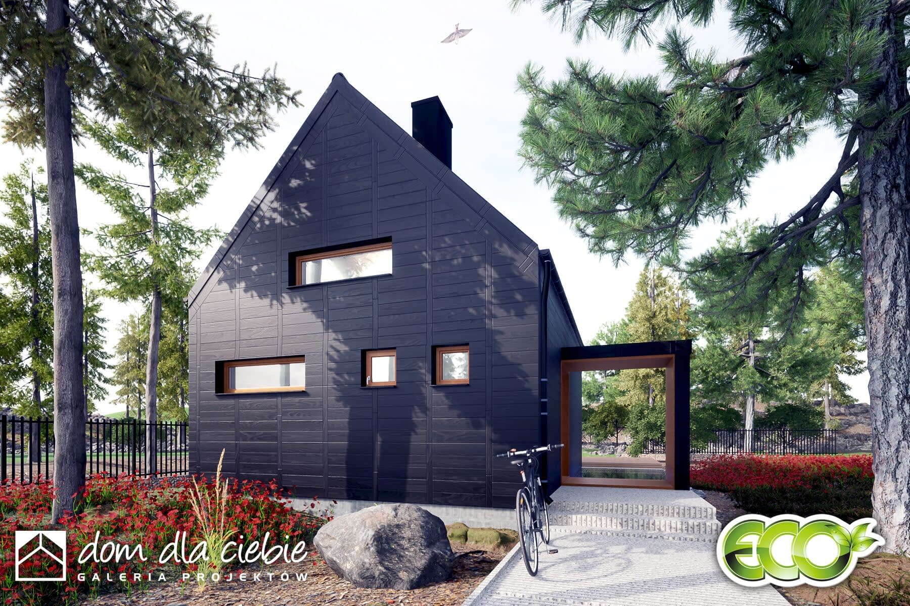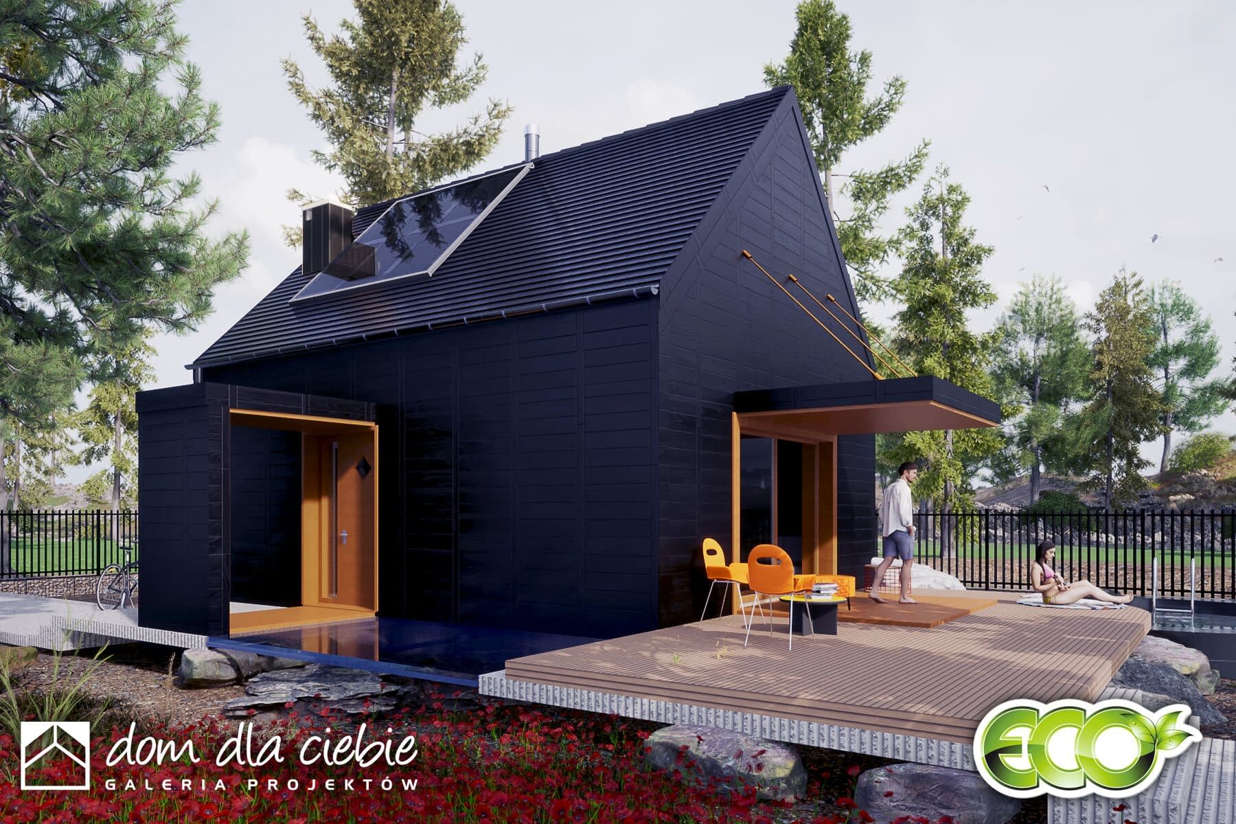 Minimalistyczny projekt małego domku z dwuspadowym dachem. Dom posiada efektowne detale w kontrastujących kolorach. Jest to propozycja projektu do 70 m2 powierzchni zabudowy.Prosta bryła z drewnianą, ciemną elewacją dobrze będzie się komponować w naturalnym środowisku. Zadaszone wejście prowadzi do wiatrołapu z szafami, z którego można dostać się do pomieszczenia technicznego, łazienki, dwuosobowej sypialni oraz do salonu z kuchnią Wysoki salon z kuchnią oraz antresolą ze schodami to strefa dzienna. Pod schodami przewidziano kominek.Obok kuchni przewidziano niewielką jadalnię. Z salonu wchodzi się schodami na sporą antresolą do dowolnego zagospodarowania.Figiel to propozycja ekonomicznego i ekologicznego domu, który doskonale sprawdzi się jako weekendowy lub dom całoroczny.