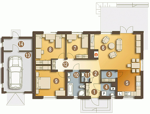 Sympatyczny dom parterowy z garażem i poddaszem możliwym do wykorzystania jako strych magazynowy, z wyraźnym podział na strefy: dzienną (kuchnia ze spiżarnią, wc, jadalnia i pok.dzienny) i nocną (3 pokoje sypialne i łazienka. Do podanej powierzchni użytkowej nie wliczono powierzchni garażu i pomieszczenia technicznego... Sprawdź inne projekty domów - Zapraszamy !