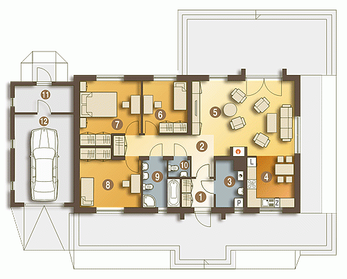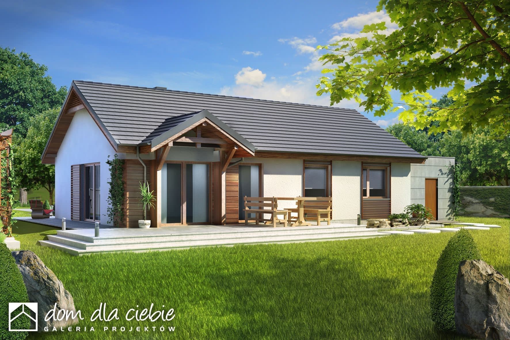 Filipek II to zmodyfikowana wersja popularnego projektu domu Filipek, naszego autorstwa z Galerii Projektów Dom Dla Ciebie. Jest to nadal dom parterowy z przybudowanym garażem jednostanowiskowym, który dostępny jest oczywiście w różnych wariantach: z garażem dwustanowiskowym jak i bez garażu. Warianty z garażem można z powodzeniem wykorzystać do zabudowy bliźniaczej, a każdy z wariantów jest dostępny w lustrzanym odbiciu. Funkcjonalnie w projekcie przewidziano wyraźny podział na strefę ogólną, do której zaliczymy salon i otwartą kuchnię oraz prywatną z trzema sypialniami i wygodną łazienką. Częśc gospodarcza - pomieszczenie usytuowane za garażem, daje mozliwość wykorzystania zmiany miejsca zlokalizowania kotłowni, która w projekcie przewidziana jest w budynku mieszkalnym. W projekcie, jako paliwo grzewcze przewidziano paliwo gazowe, jednak dzięki wielkości kotłowni i bezpośredniemu dostępowi do komina, z powodzeniem można tu zastosować piec np. na tańsze paliwo - stałe.*Do podanej powierzchni użytkowej nie wliczono powierzchni garażu i pomieszczenia technicznego... Sprawdź inne projekty domów - Zapraszamy !