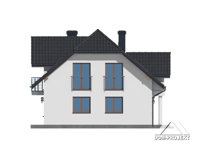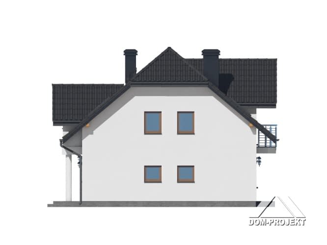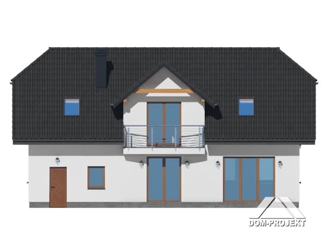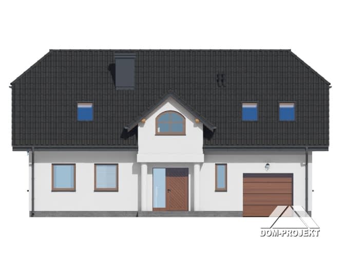 Dom z poddaszem użytkowym. Na parterze salon z kuchnią, kominkiem oraz wyjściem na taras. Pokój, komunikacja, wiatrołap, łazienka, korytarz, garaż, kotłownia. Na poddaszu cztery pokoje, dwie łazienki, pomieszczenie gospodarcze, garderoba oraz balkon.Rzuty