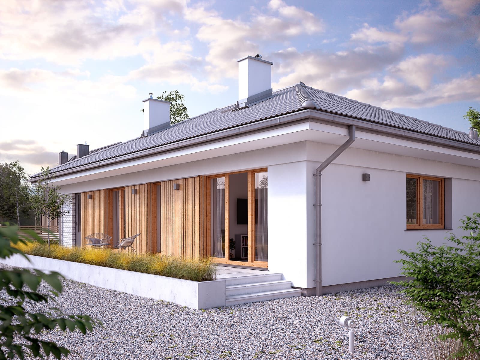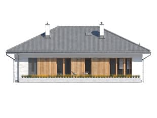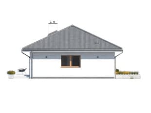 Fistaszek 3 to projekt domu parterowego idealny dla 3 - 4-osobowej rodziny. Prosta bryła budynku przykryta została czterospadowym dachem. Na dachu pojawiła się dachówka ceramiczna w kolorze grafitowym. Biały tynk na elewacji urozmaicono drewnianą szalówką. Pomimo niewielkiej powierzchni użytkowej, w układzie funkcjonalnym wyodrębniono aż trzy strefy użytkowe. Strefę dzienną tworzy salon, jadalnia oraz otwarta kuchnia z zaprojektowaną tuż obok spiżarnią. Dzięki licznym i dużym przeszkleniom, została ona świetnie doświetlona. W strefie nocnej mieszkańcy do dyspozycji mają dwie wygodne sypialnie oraz rodzinną łazienkę. Część gospodarczą domu tworzy jednostanowiskowy garaż oraz duża kotłownia z bezpośrednim wyjściem na zewnątrz.Konstrukcja
