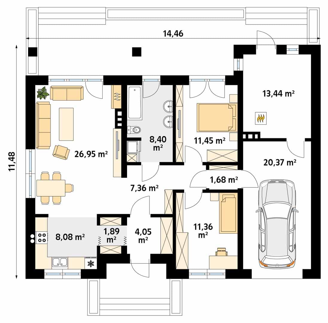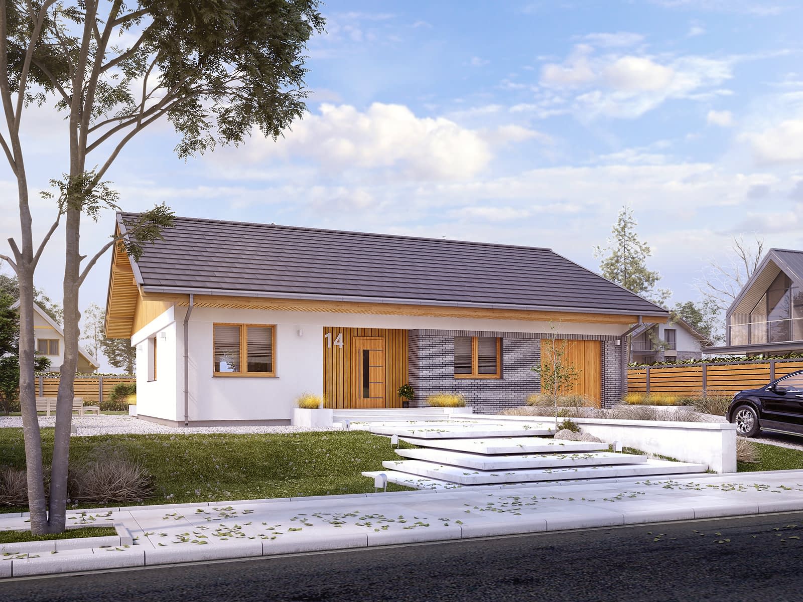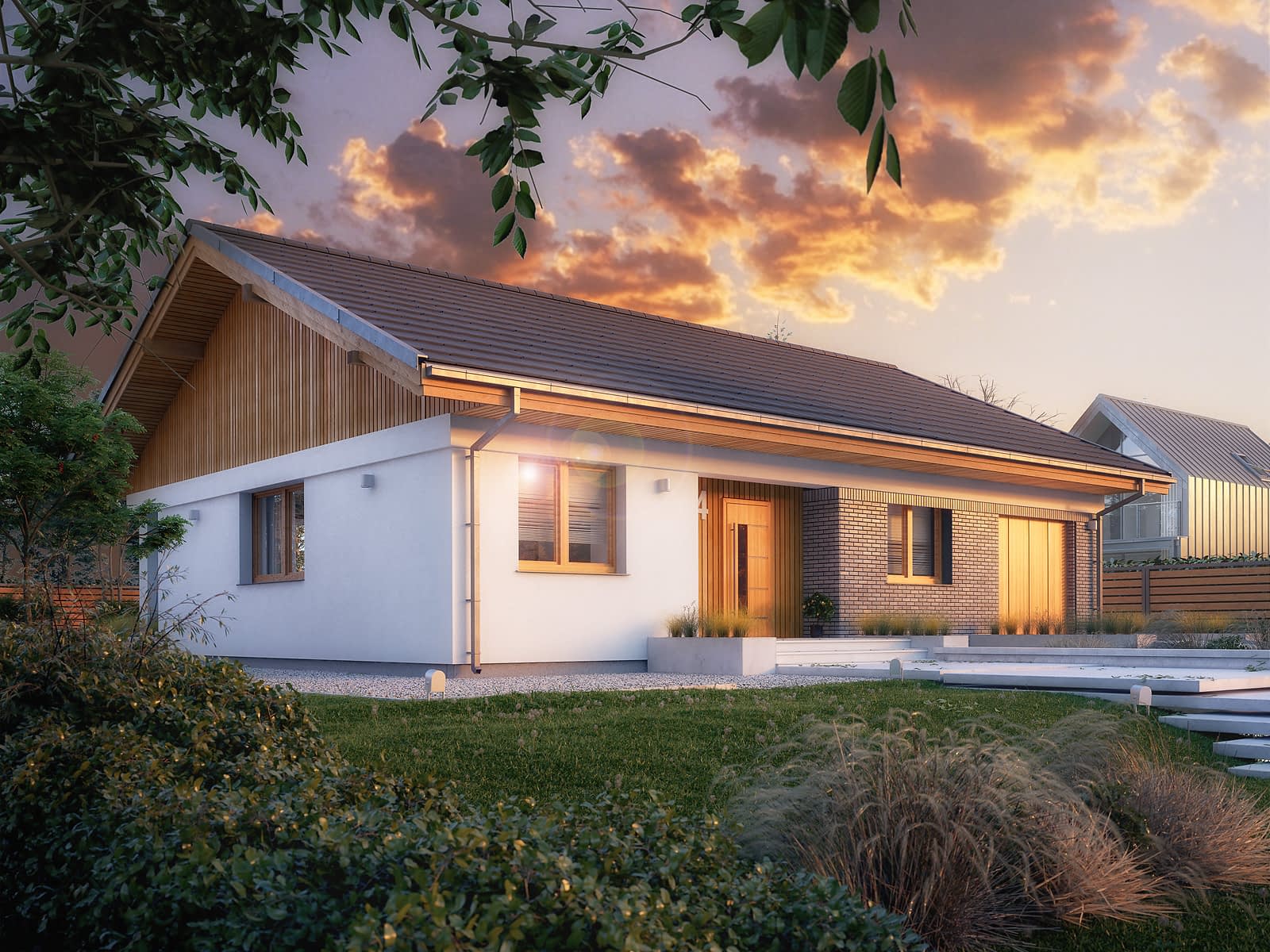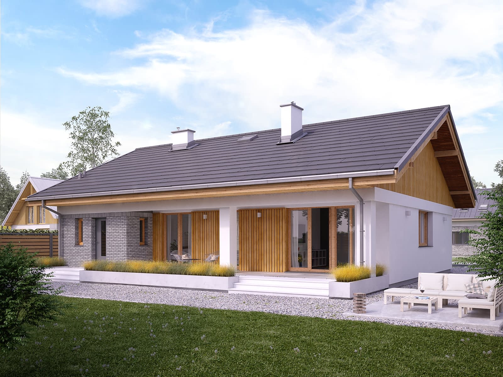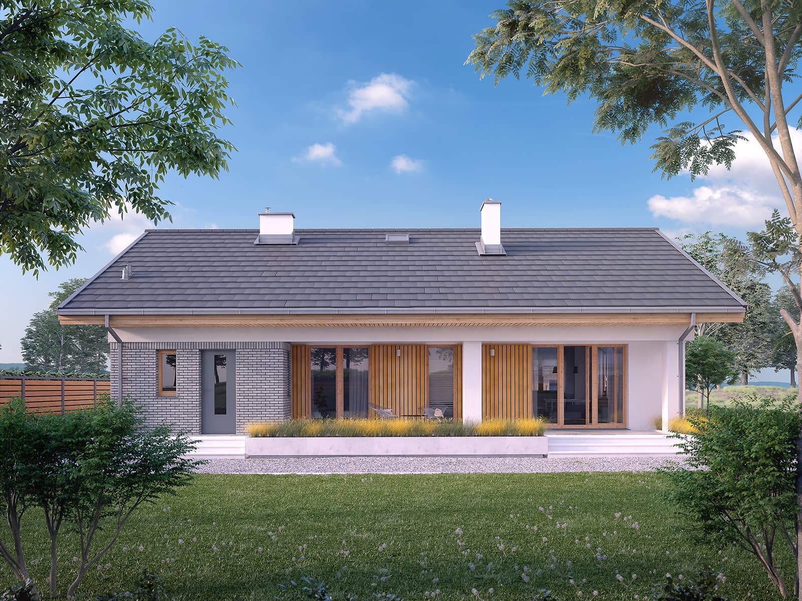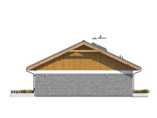 Fistaszek 4 to projekt domu parterowego zaprojektowany z myślą o 3-osobowej rodzinie. Budynek charakteryzuje się prostą bryłą przykrytą dwuspadowym dachem i niewielką powierzchnią użytkową. Gwarantuje to nie tylko niskie koszty budowy, ale również niewielkie koszty późniejszej eksploatacji. Elewacja budynku została wzbogacona drewnianą szalówką, dzięki czemu budynek prezentuje się elegancko i nowocześnie. Na niedużej powierzchni użytkowej, autor zaprojektował funkcjonalne wnętrze, które pozwala na łatwą aranżację pomieszczeń. Układ funkcjonalny został podzielony na trzy strefy: dzienną, nocną i gospodarczą. Strefa dzienna składa się z przestronnego salonu z kominkiem, który płynnie łączy się z jadalnią oraz kuchnią. Część nocna to dwie wygodne sypialnie oraz rodzinna łazienka z wydzielonym miejscem na pralnię. W bryle budynku zaprojektowano również jednostanowiskowy garaż z przejściem do kotłowni dostosowanej pod dwa rodzaje ogrzewania: gazowe oraz na paliwo stałe. Atutem projektu jest zadaszony taras od strony ogrodu z bezpośrednim wyjściem z salonu, łazienki i sypialni.Konstrukcja