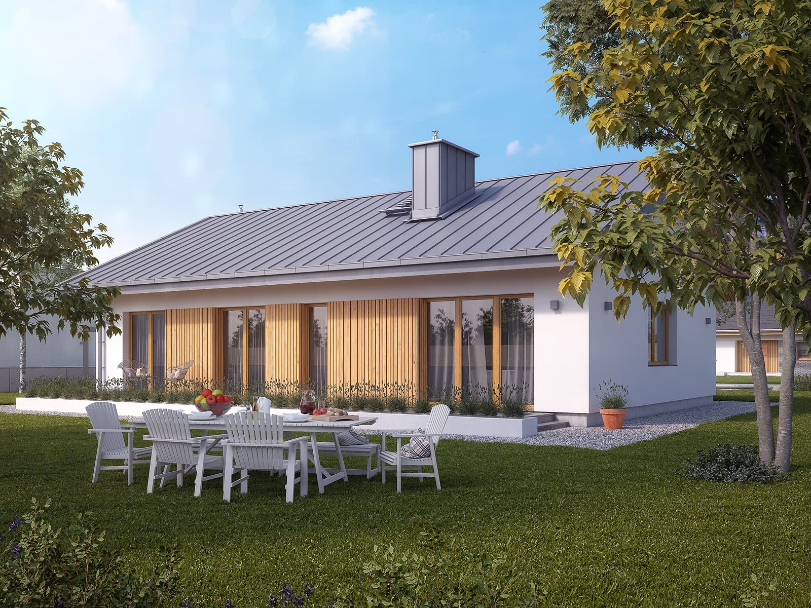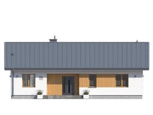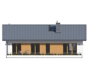 Projekt domu Fistaszek 5 jest idealnym rozwiązaniem dla osób, które szukają kompaktowego domu dla 4 osobowej rodziny. Dom jest mały i tani w budowie, a dodatkowo posiada niskie koszty eksploatacji. Dwuspadowy nieskomplikowany dach, elewacja z elementami drewnianymi nadają Fistaszkowi 5 elegancki wyróżniający się wygląd. Na uwagę zasługuje strefa dzienna, w której znajduje się duża otwarta kuchnia ze spiżarnią. Przestronny salon z kominkiem, oraz stół na 6 osób. W projekcie obok dodatkowego wc, zaprojektowane zostało praktyczne zaplecze gospodarcze. Strefa nocna to 3 duże niezwykle ustawne sypialnie. Dwie sypialnie posiadają bezpośrednie wyjście na taras, co jest bardzo praktycznym rozwiązaniem, szczególnie w ciepłe letnie wieczory.Konstrukcja