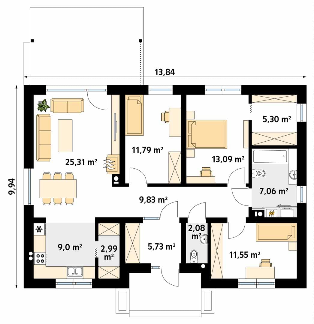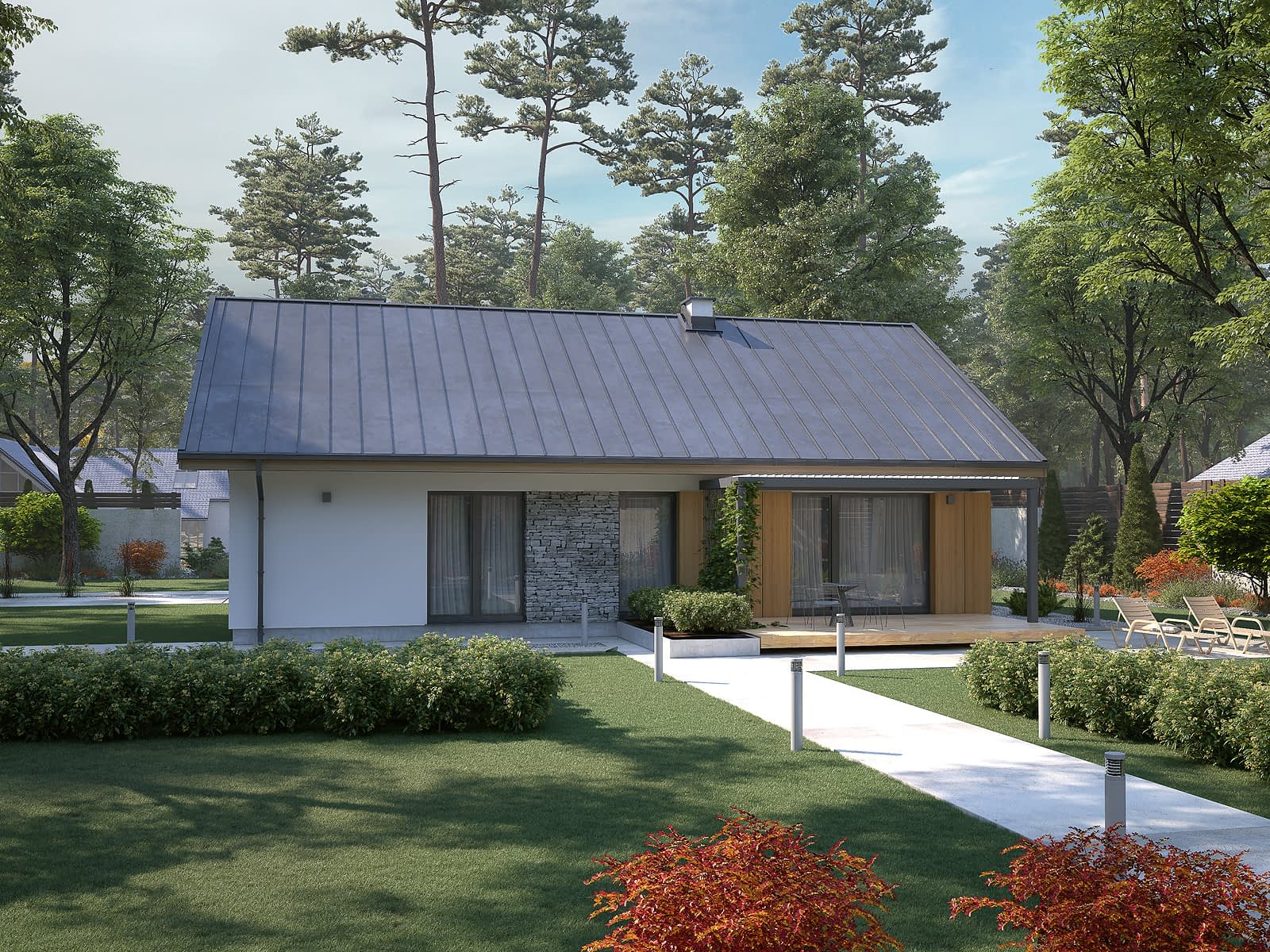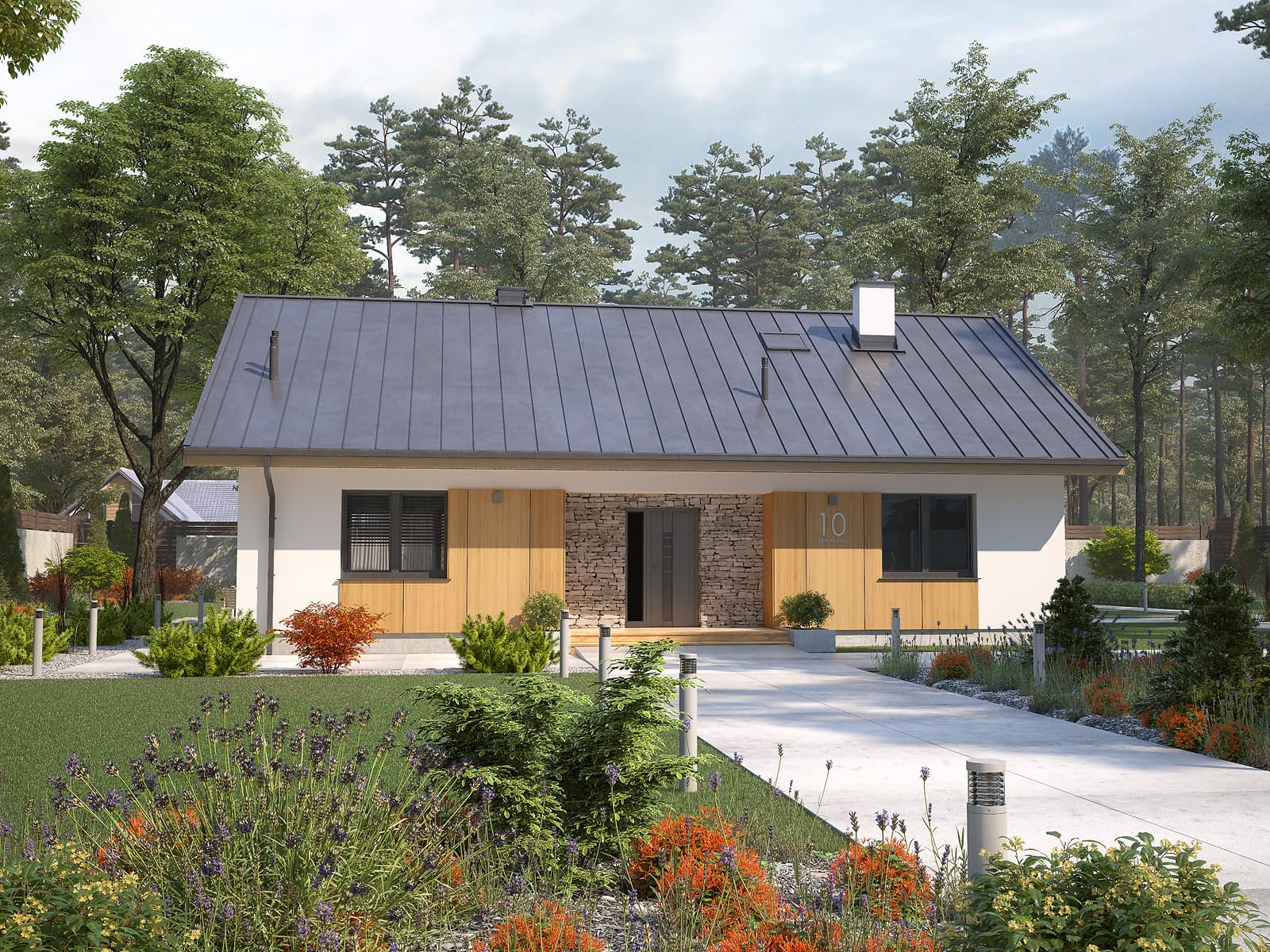 Fistaszek 6 to projekt domu parterowego zaprojektowany z myślą o 4-osobowej rodzinie. Układ funkcjonalny został podzielony na dwie strefy: dzienną i nocną. W strefie dziennej znajduje się kuchnia ze spiżarnią oraz przestronny salon z miejscem na duży stół jadalniany. Strefa nocna obejmuje trzy sypialnie, w tym jedną z prywatną garderobą. Dodatkowo zaprojektowano oddzielne wc oraz łazienkę z miejscem na kocioł gazowy. Program użytkowy oparto na prostym rzucie oraz zaprojektowano dwuspadowy dach. Wprowadzone rozwiązania wpłyną na zmniejszenie kosztów budowy takiego domu.Konstrukcja