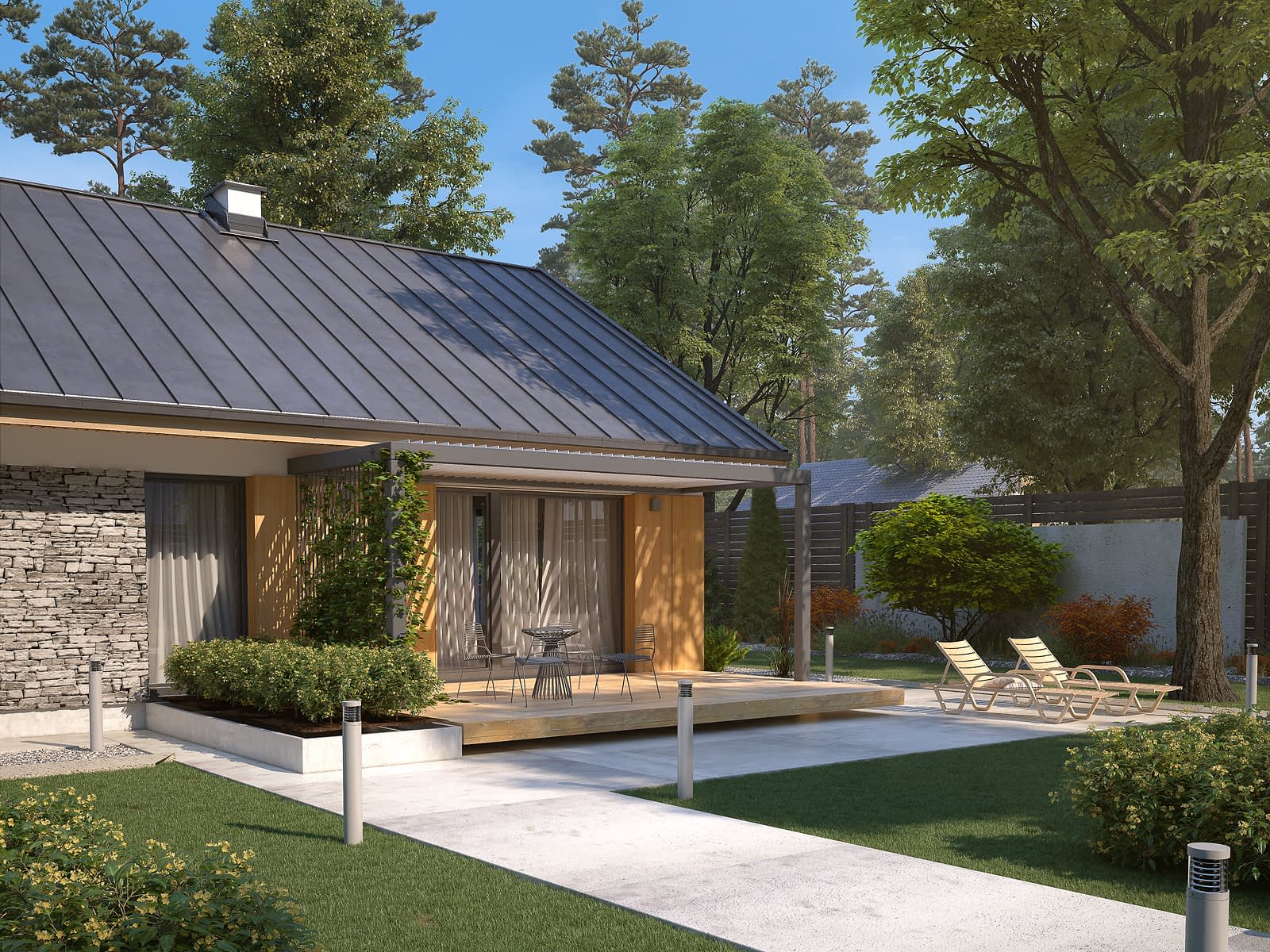 Ściany: 2-warstwowe - bloczki z betonu komórkowego + styropian, Stropy: żelbetowe, Dach: blacha na rąbek stojący Ruukki Classic,Rzuty