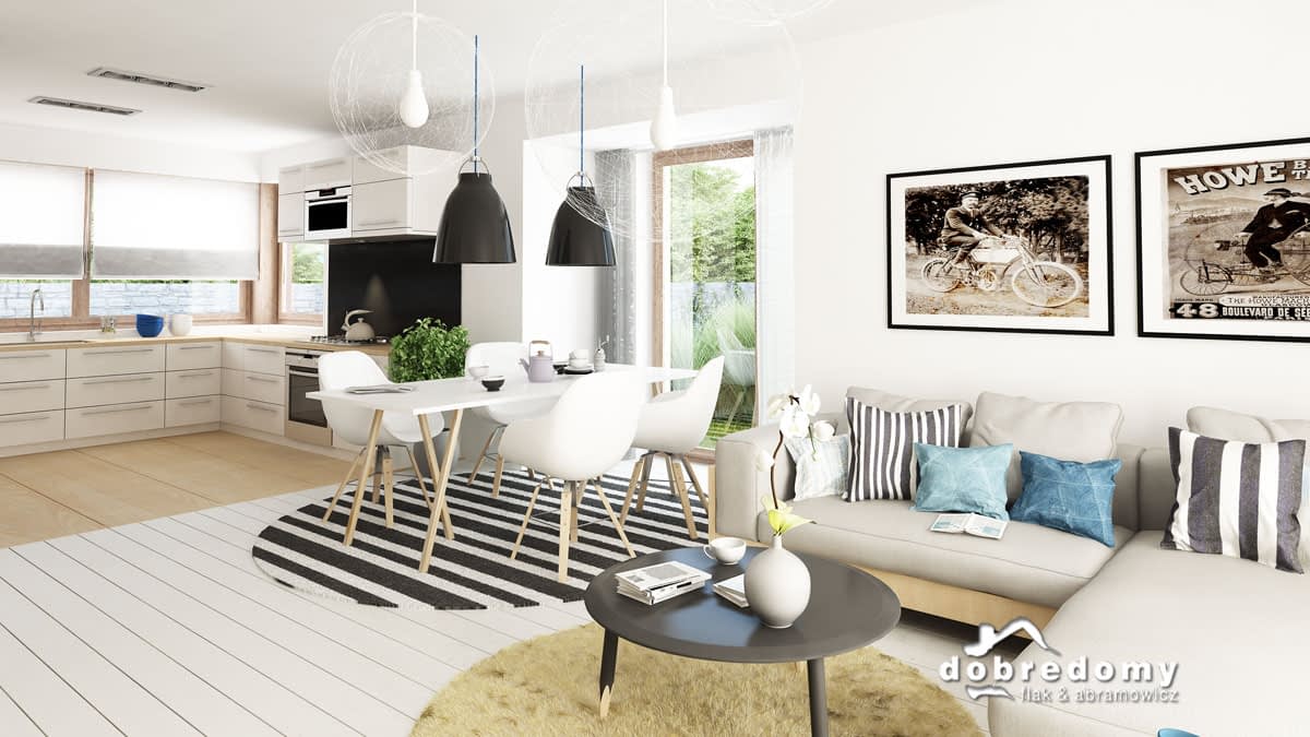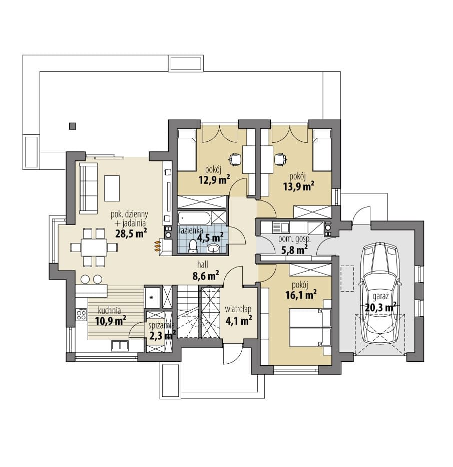 Projekt domu z poddaszem do adaptacji, które można wykończyć w późniejszym czasie. Część dzienna na parterze obejmuje pokój dzienny, jadalnię, kuchnię ze spiżarnią oraz wc. Strefa gospodarcza to kotłownia i garaż. Strefa nocna domu to trzy sypialnie, łazienka oraz garderoba. Propozycja zaranżowania poddasza obejmuje dwa pokoje, garderobę, łazienkę i pralnię. Projekt dostępny w wersji bez poddasza - Flawia, w wersji z poddaszem i garażem - Flawia III oraz w wersjach bez poddasza i o mniejszej powierzchni użytkowej: bez garażu - Flawia Mała, oraz z garażem jednostanowiskowym - Flawia Mała II.