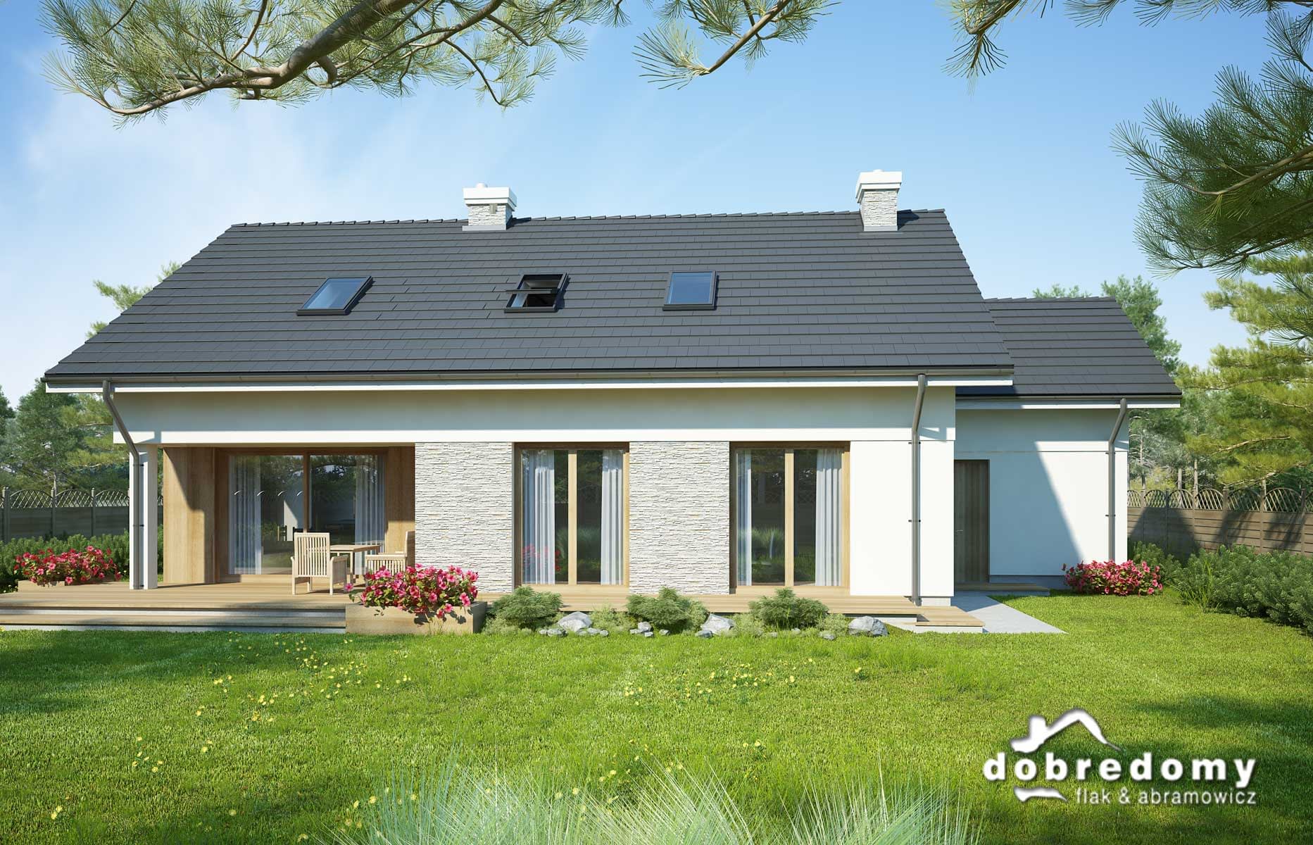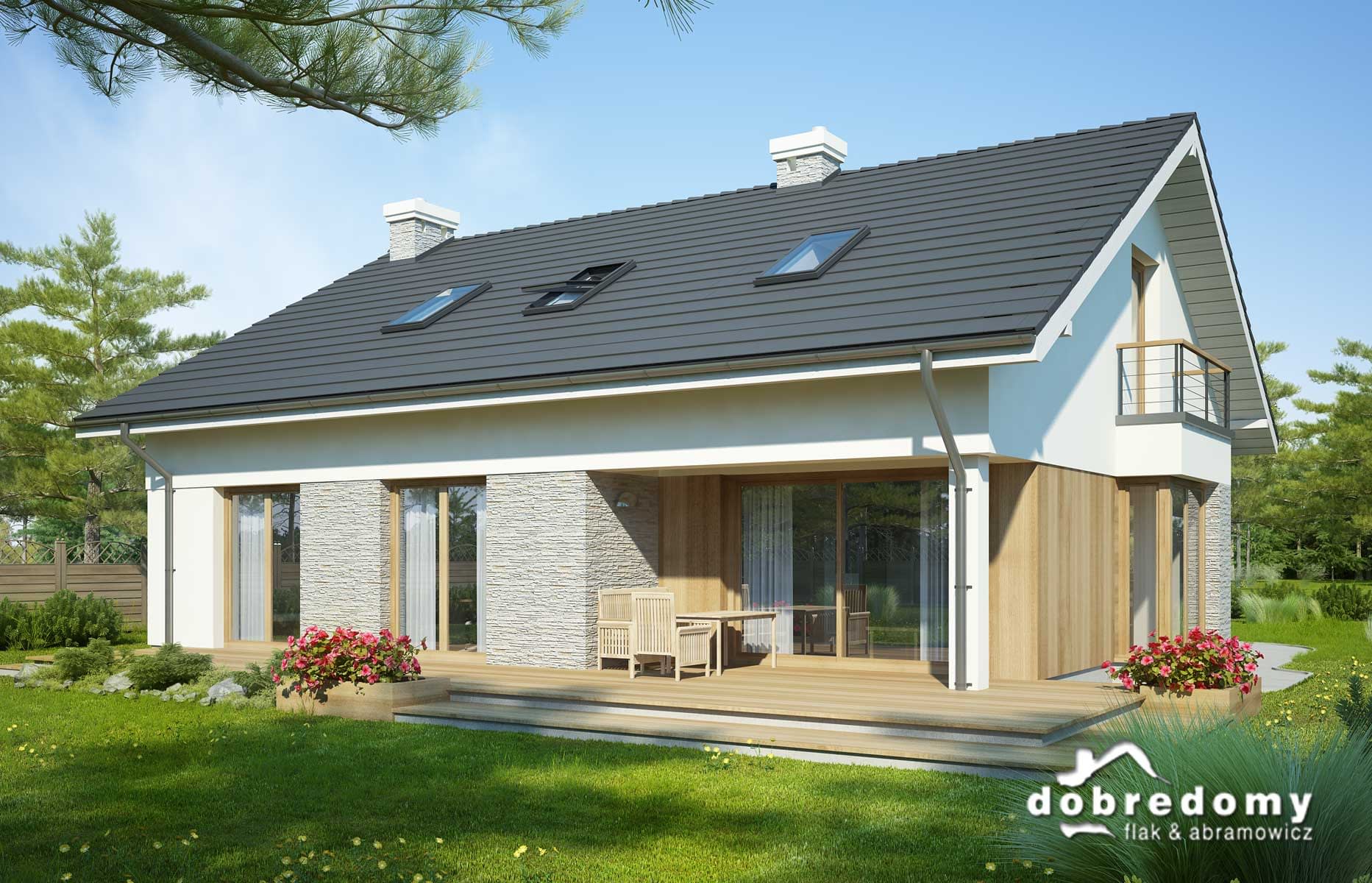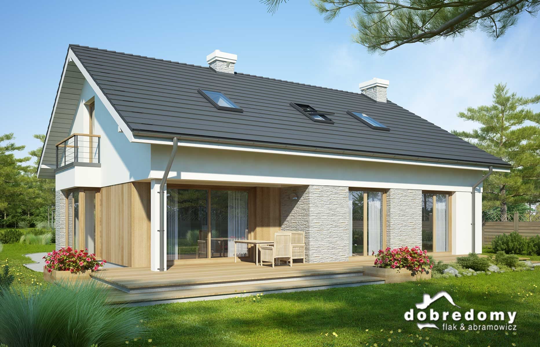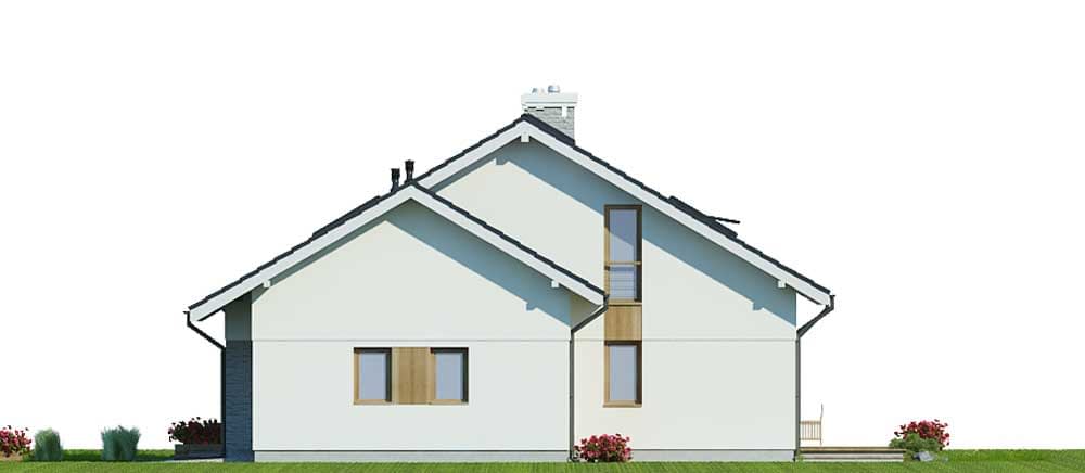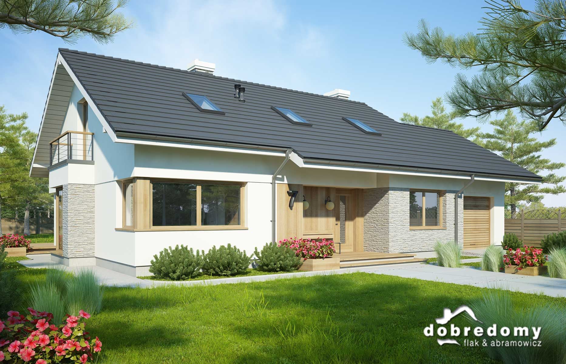 Elewacje pokryte tynkiem strukturalnym w systemie ociepleń Termo Organika oraz okładziną drewnianą i kamienną. W projekcie zastosowano okna dachowe marki FAKRO. Pokrycie dachu - dachówka ceramiczna lub cementowa CREATON.