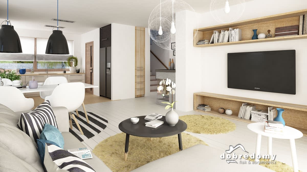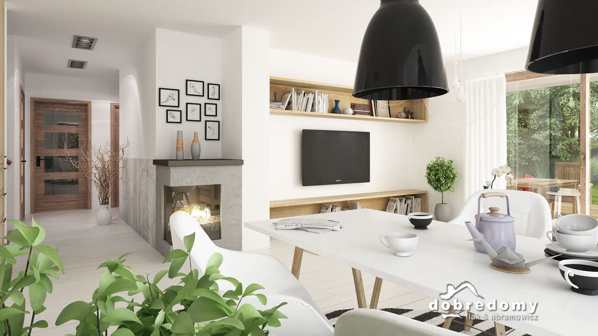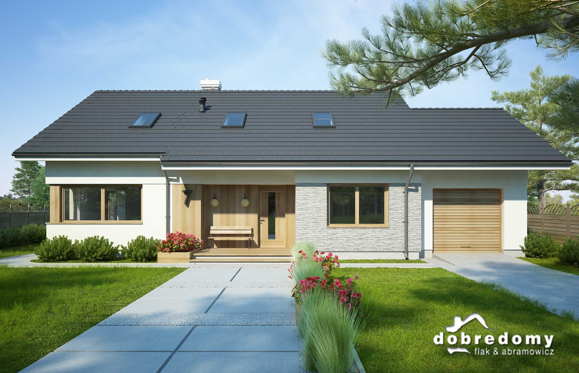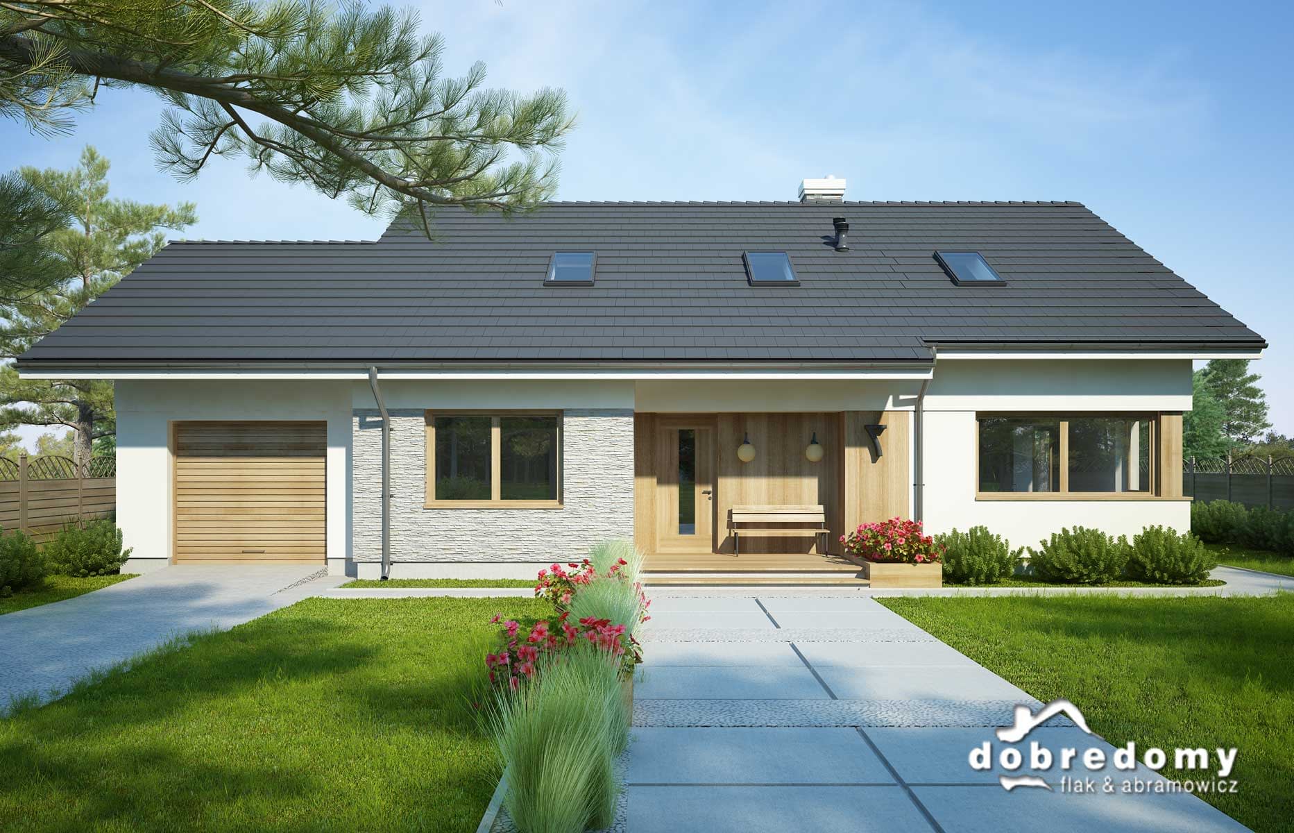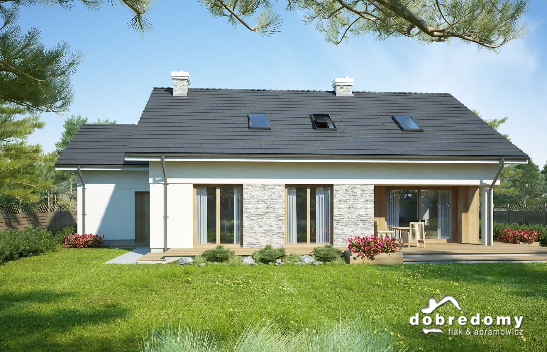 Elewacje pokryte tynkiem strukturalnym w systemie ociepleń Termo Organika oraz okładziną drewnianą i kamienną. W projekcie zastosowano okna dachowe marki FAKRO. Pokrycie dachu - dachówka ceramiczna lub cementowa CREATON.