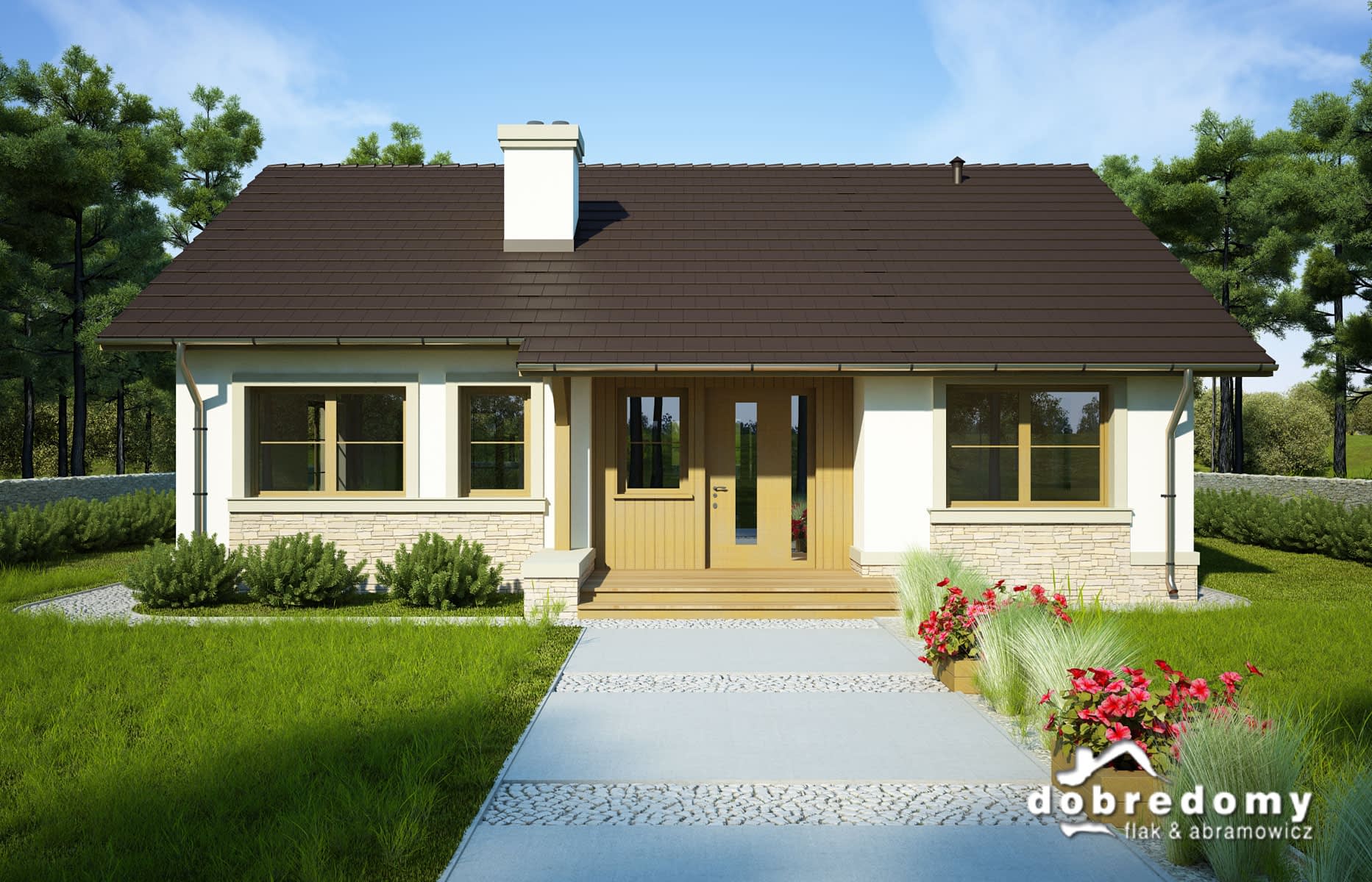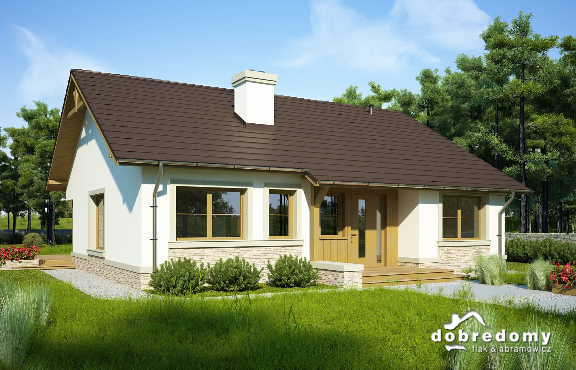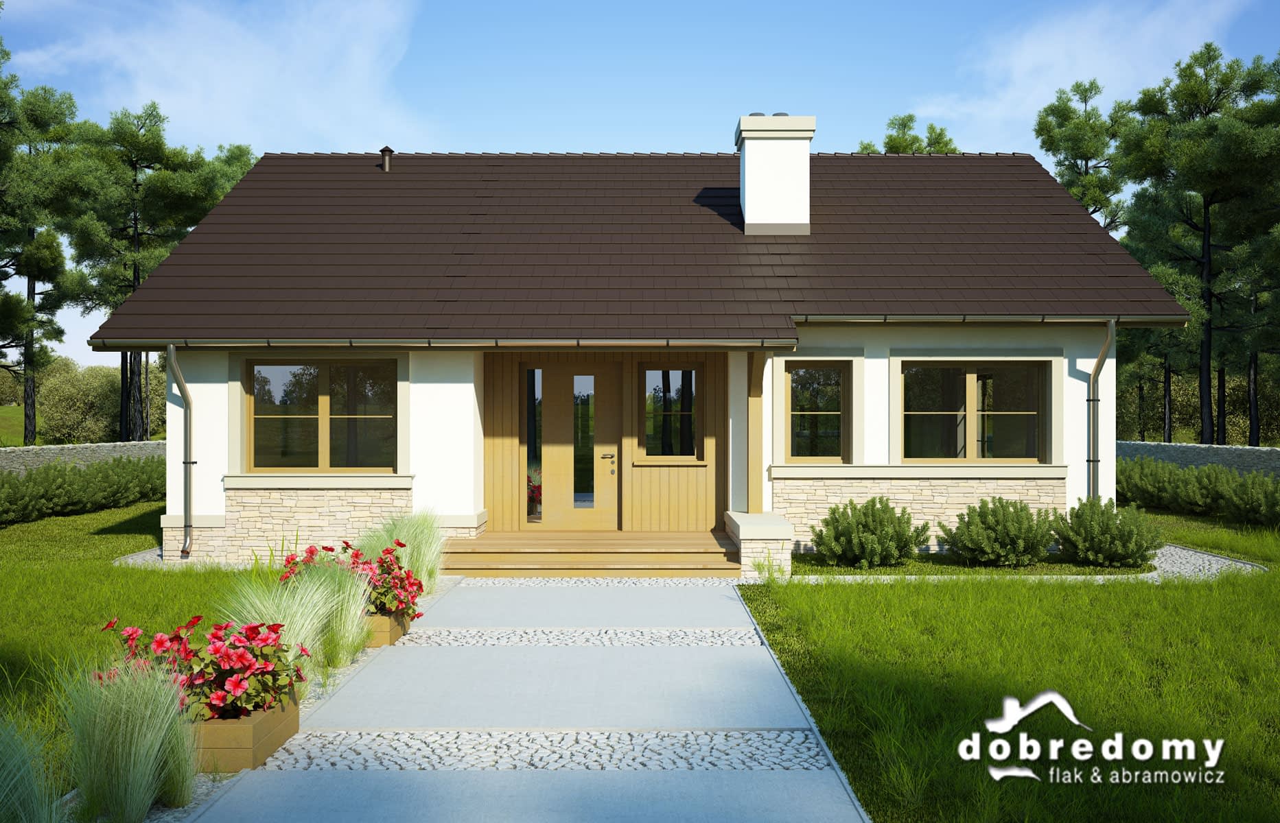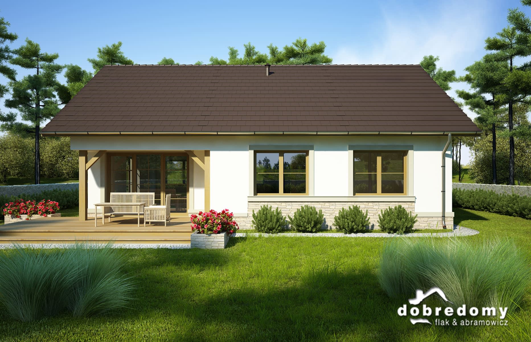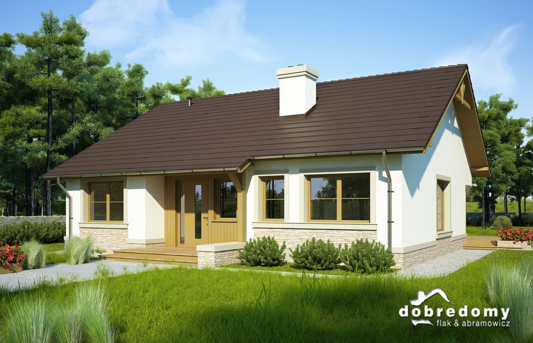 Jednorodzinny dom parterowy dla 4-osobowej rodziny, bez garażu. Wnętrze składa się z otwartej strefy dziennej: salon z kominkiem i jadalnią, kuchnia oraz wc. Część nocna to trzy sypialnie i łazienka. Przy kuchni zaplanowano spiżarnię, a przy wiatrołapie kotłownię. Istnieje możliwość zrobienia stałych schodów na poddasze - w miejscu pomieszczenia 1/7 - linia przerywana na rzucie.