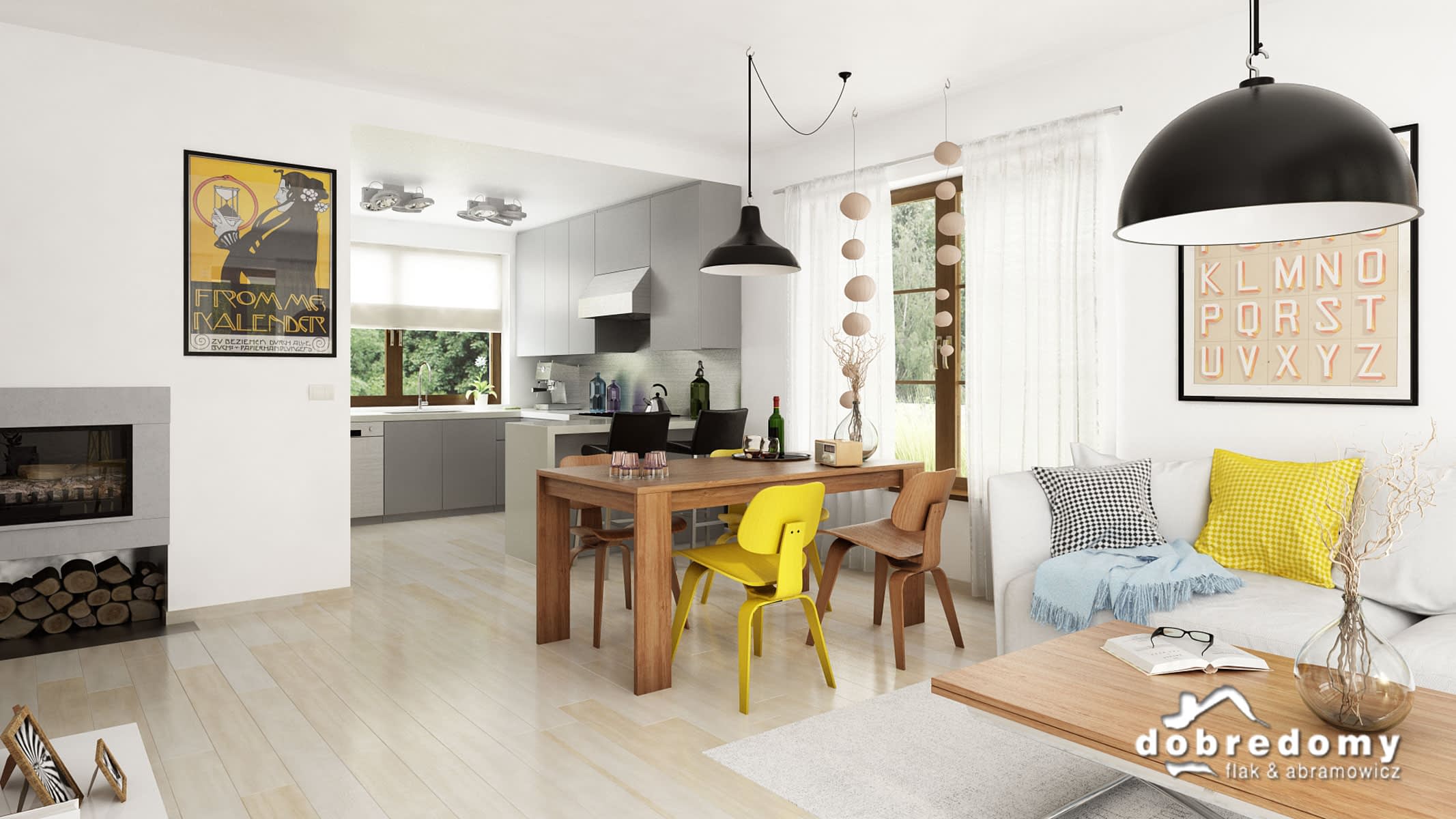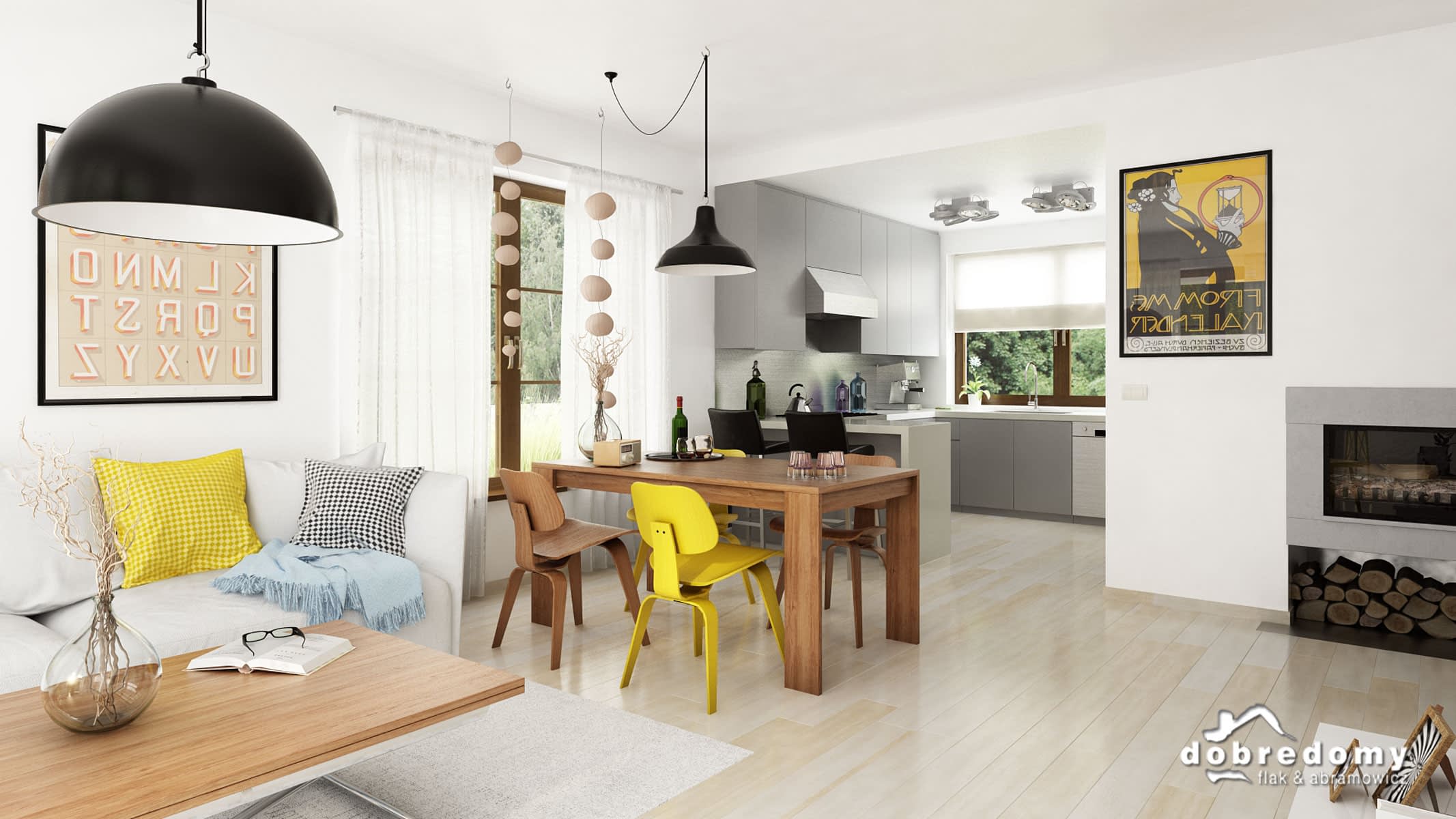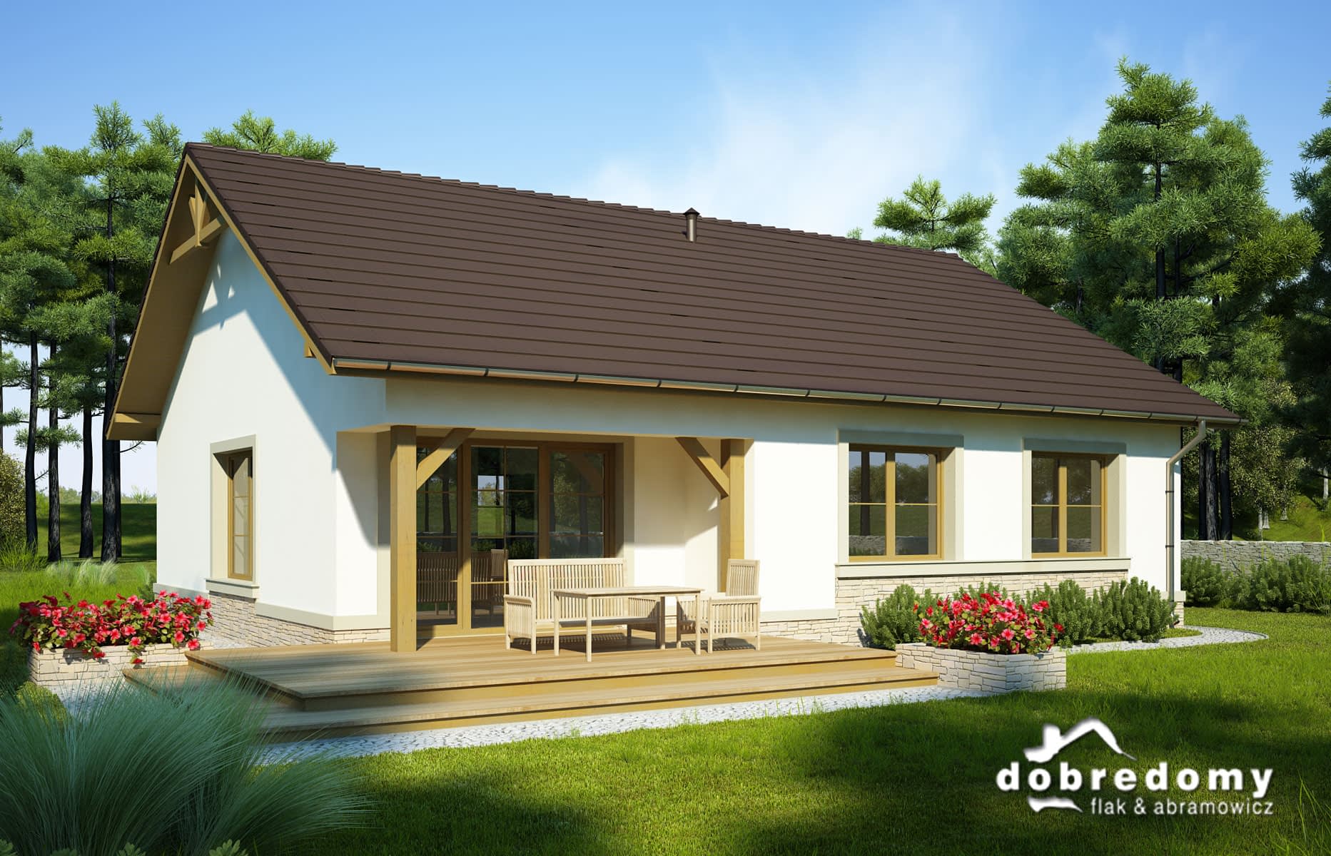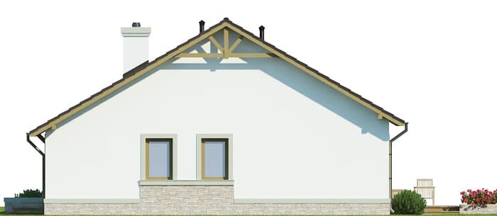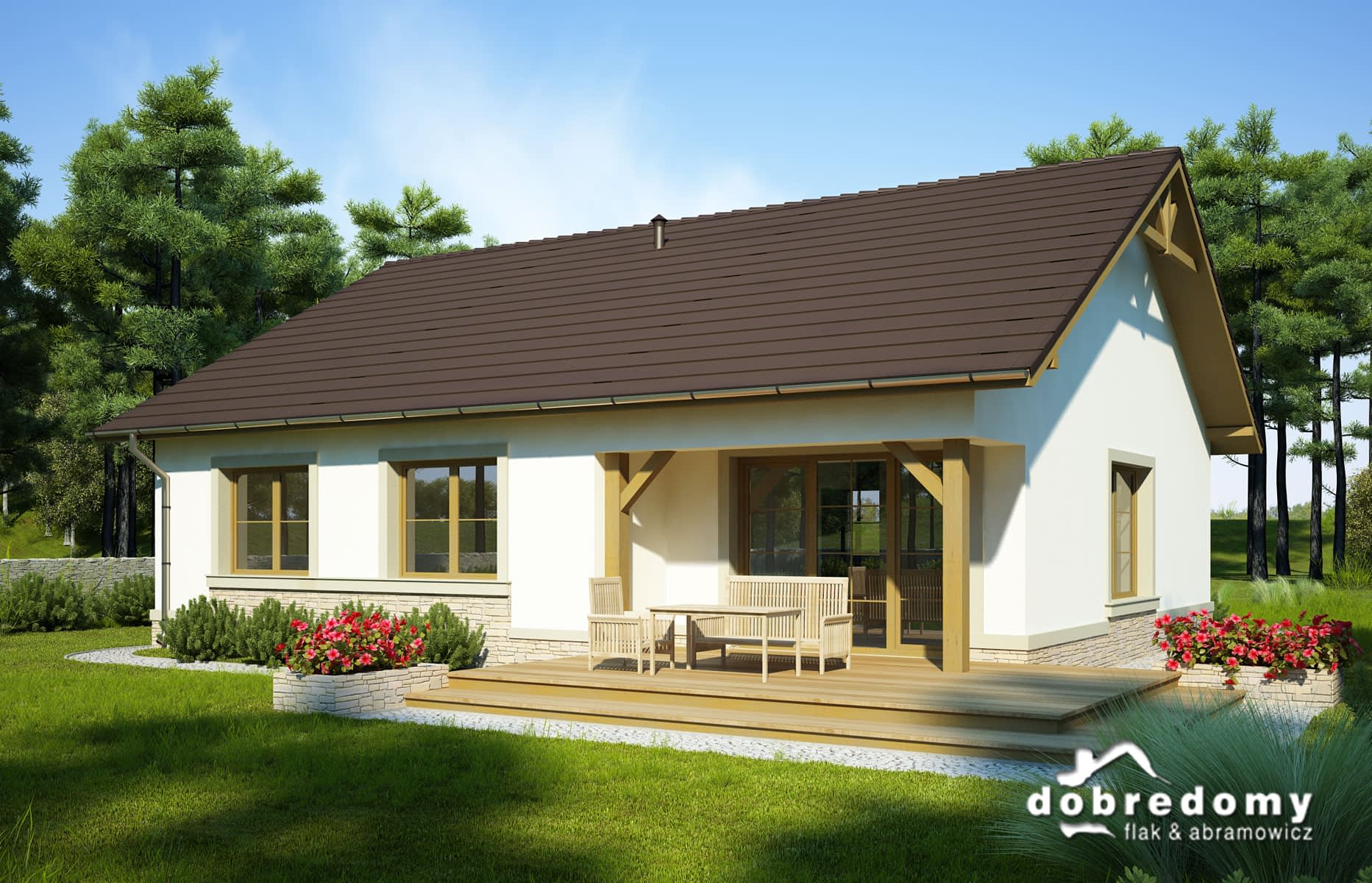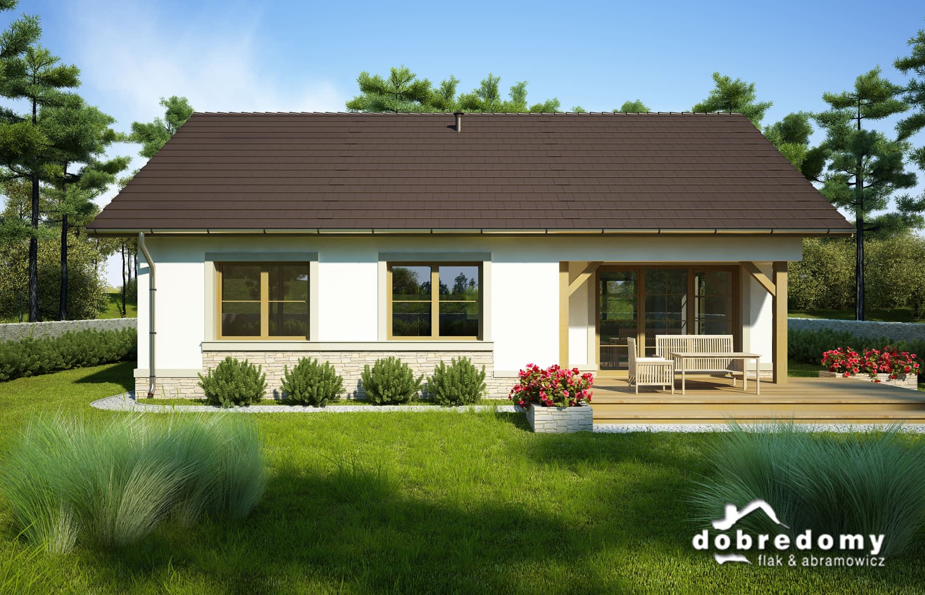 Jednorodzinny dom parterowy dla 4-osobowej rodziny, bez garażu. Wnętrze składa się z otwartej strefy dziennej: salon z kominkiem i jadalnią, kuchnia oraz wc. Część nocna to trzy sypialnie i łazienka. Przy kuchni zaplanowano spiżarnię, a przy wiatrołapie kotłownię. Istnieje możliwość zrobienia stałych schodów na poddasze - w miejscu pomieszczenia 1/7 - linia przerywana na rzucie.