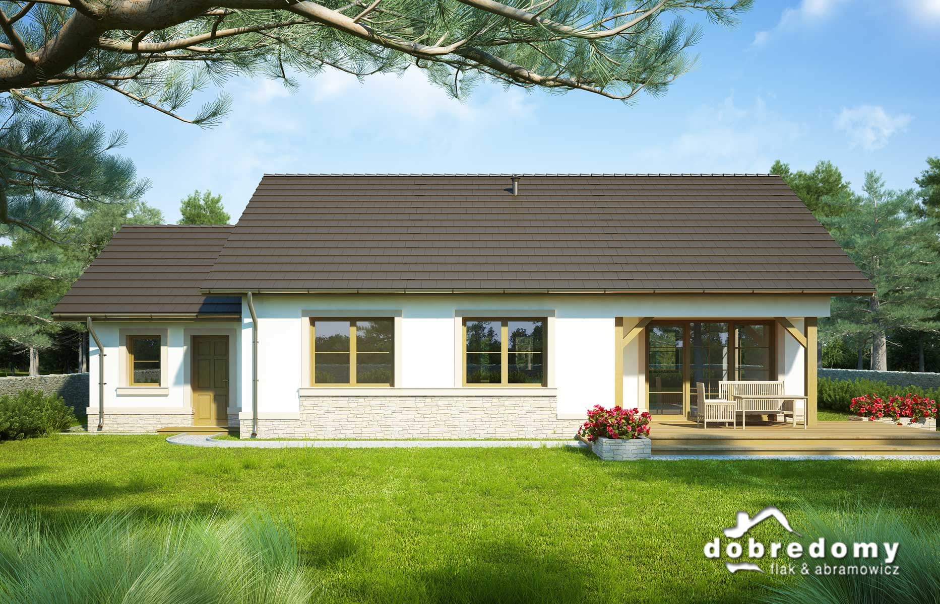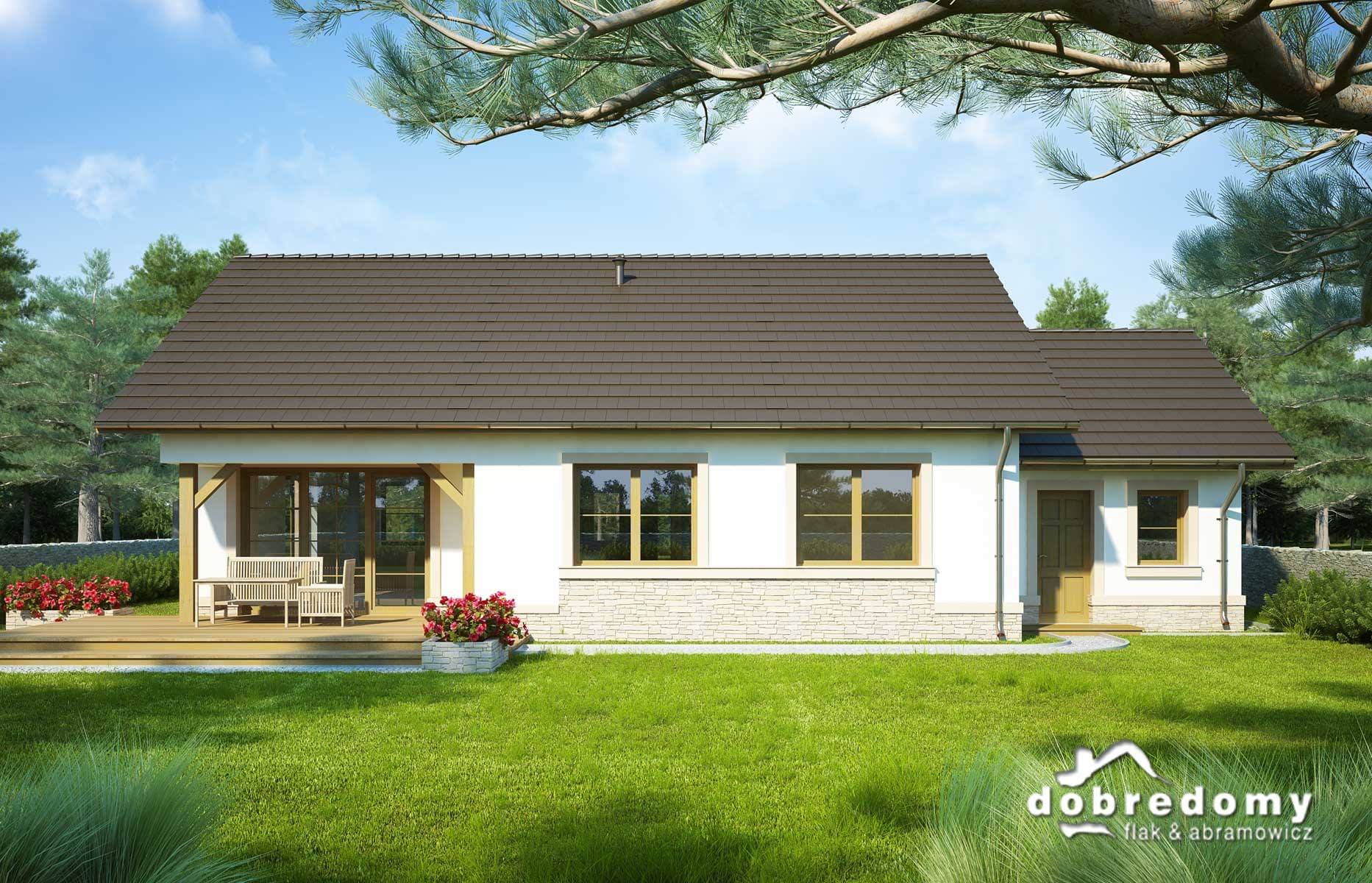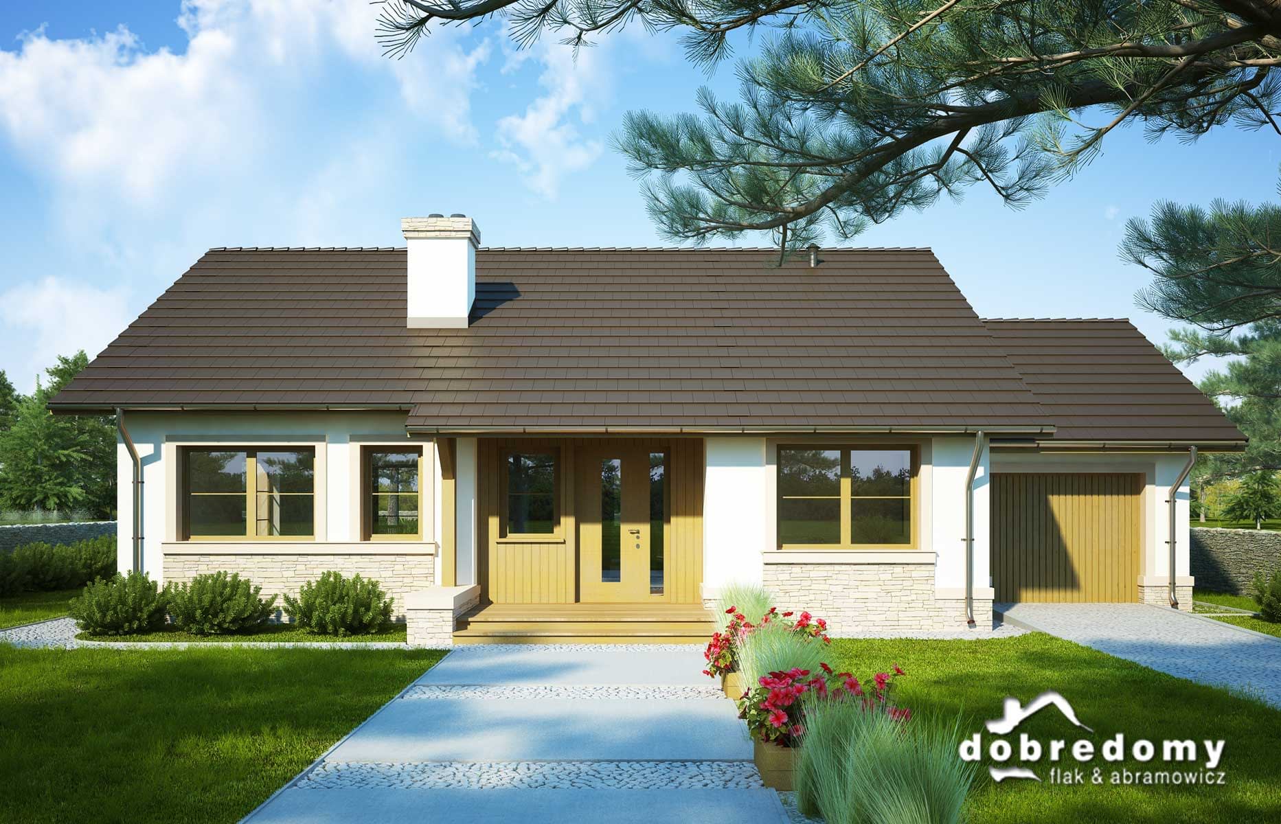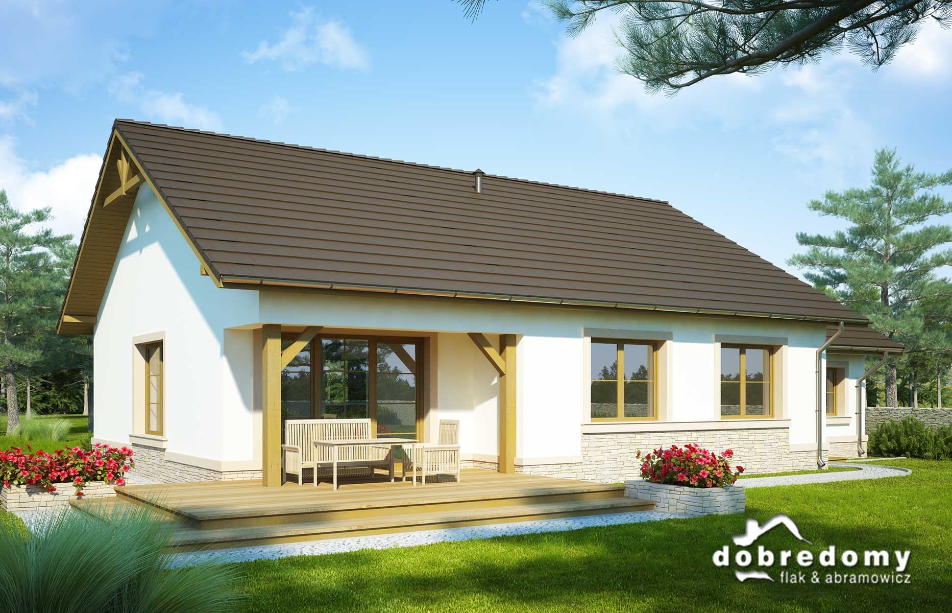 Dom parterowy, z garażem i dachem dwuspadowym. Trzy sypialnie, dwie łazienki oraz część wspólna, obejmująca pokój dzienny połączony z jadalnią i kuchnią, zaspokoją potrzeby mieszkaniowe 4-osobowej rodziny. Całości dopełnia pomieszczenie gospodarcze, przez które przechodzi się do garażu. Projekt można wykorzystać do zabudowy bliźniaczej. Projekt dostępny w wersji bez garażu - Flawia Mała.