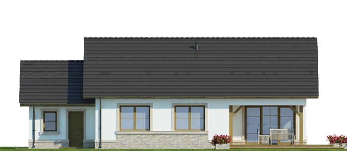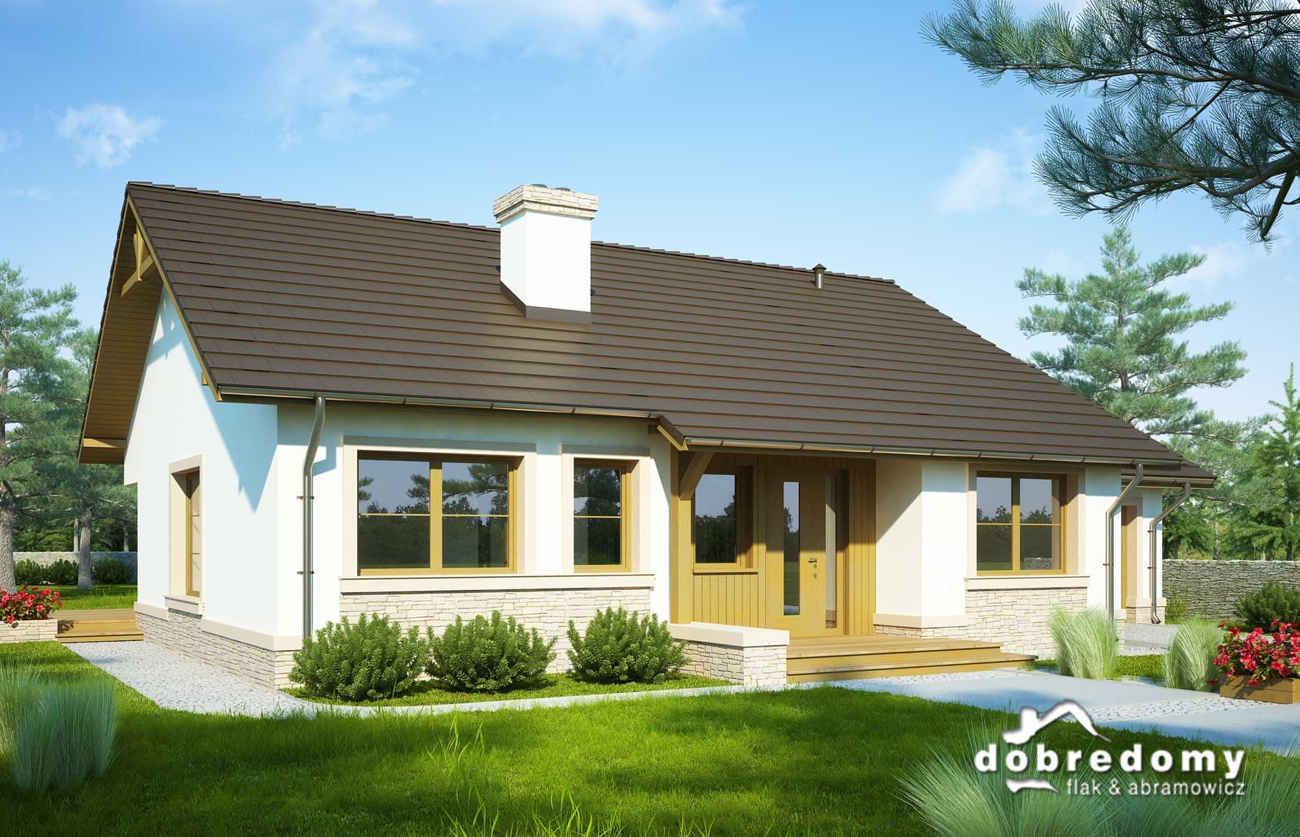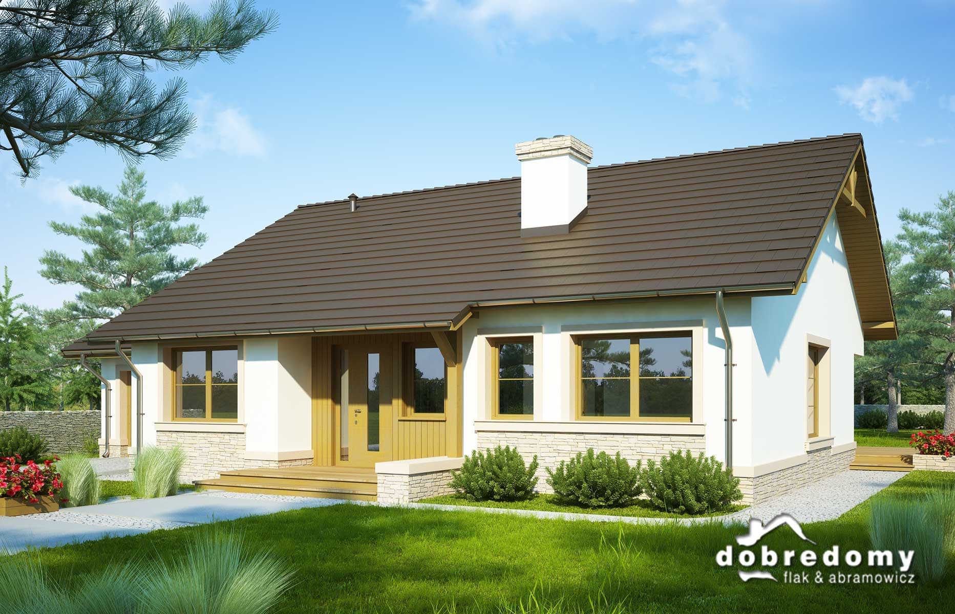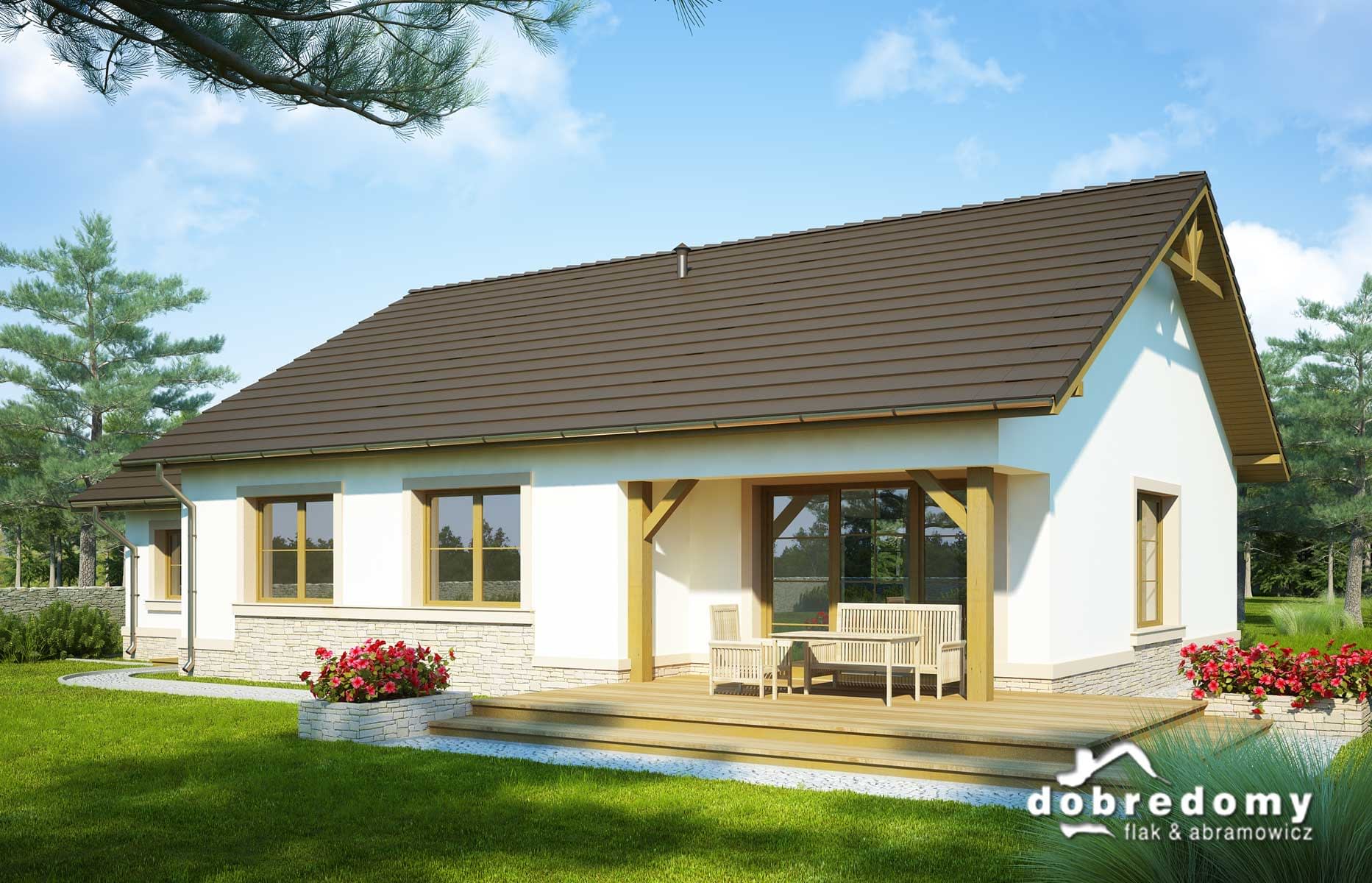 Dom parterowy, z garażem i dachem dwuspadowym. Trzy sypialnie, dwie łazienki oraz część wspólna, obejmująca pokój dzienny połączony z jadalnią i kuchnią, zaspokoją potrzeby mieszkaniowe 4-osobowej rodziny. Całości dopełnia pomieszczenie gospodarcze, przez które przechodzi się do garażu. Projekt można wykorzystać do zabudowy bliźniaczej. Projekt dostępny w wersji bez garażu - Flawia Mała.