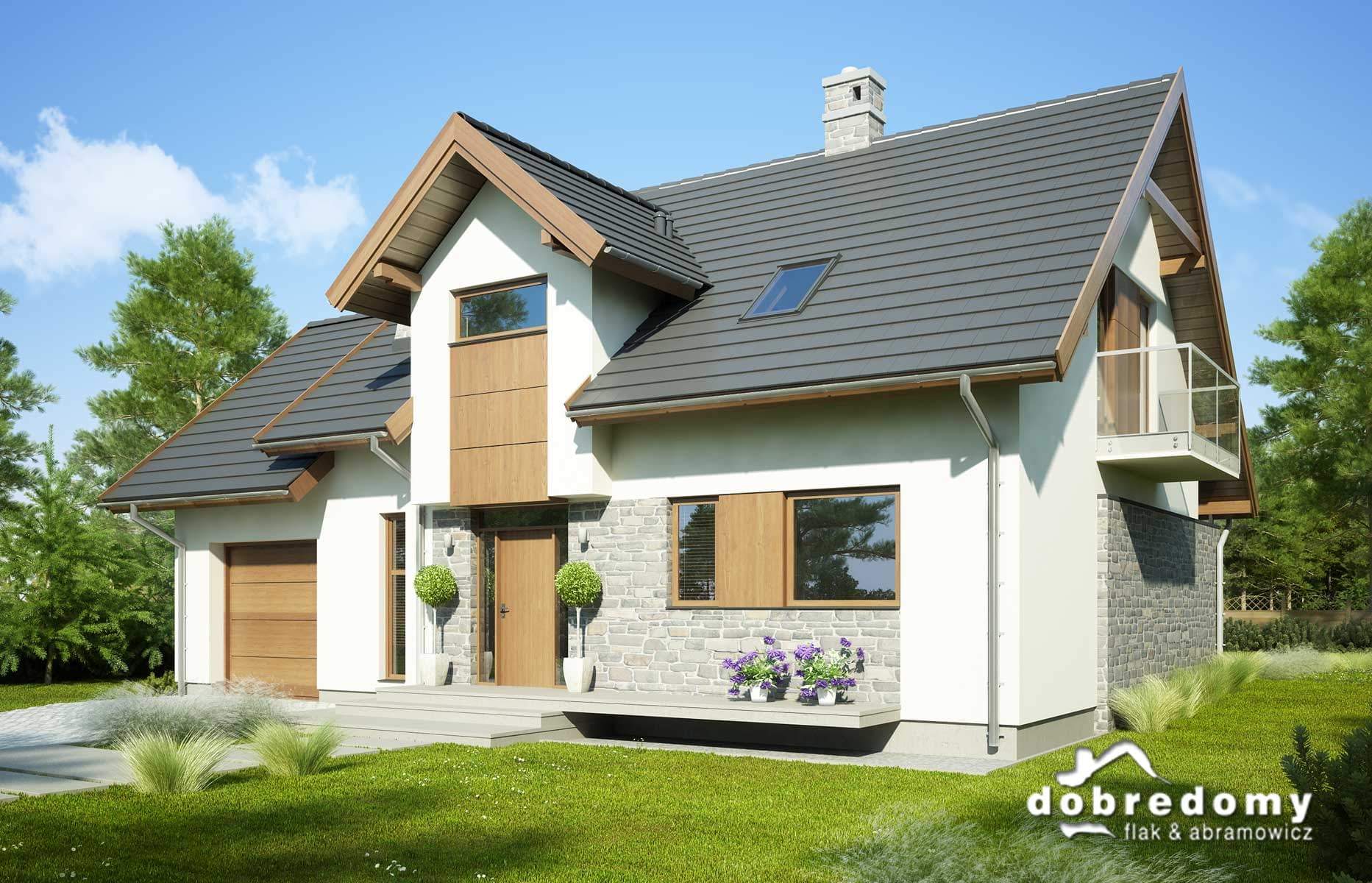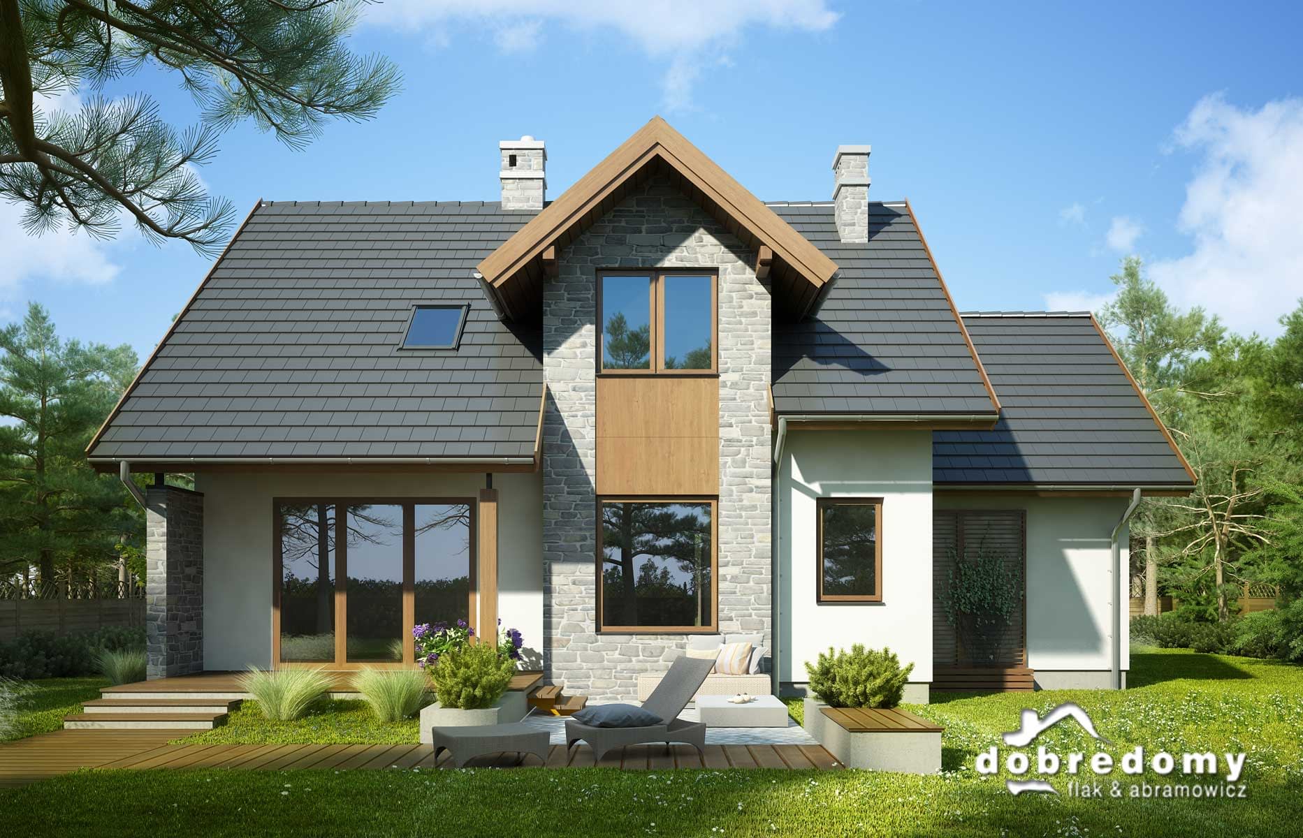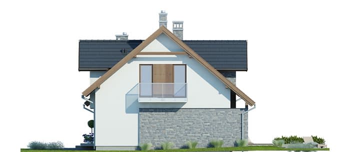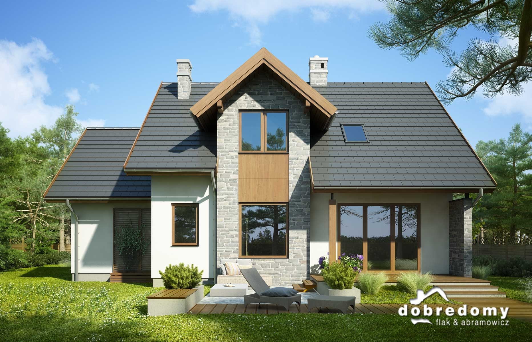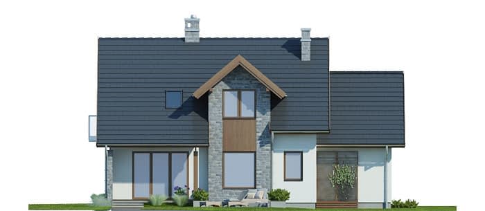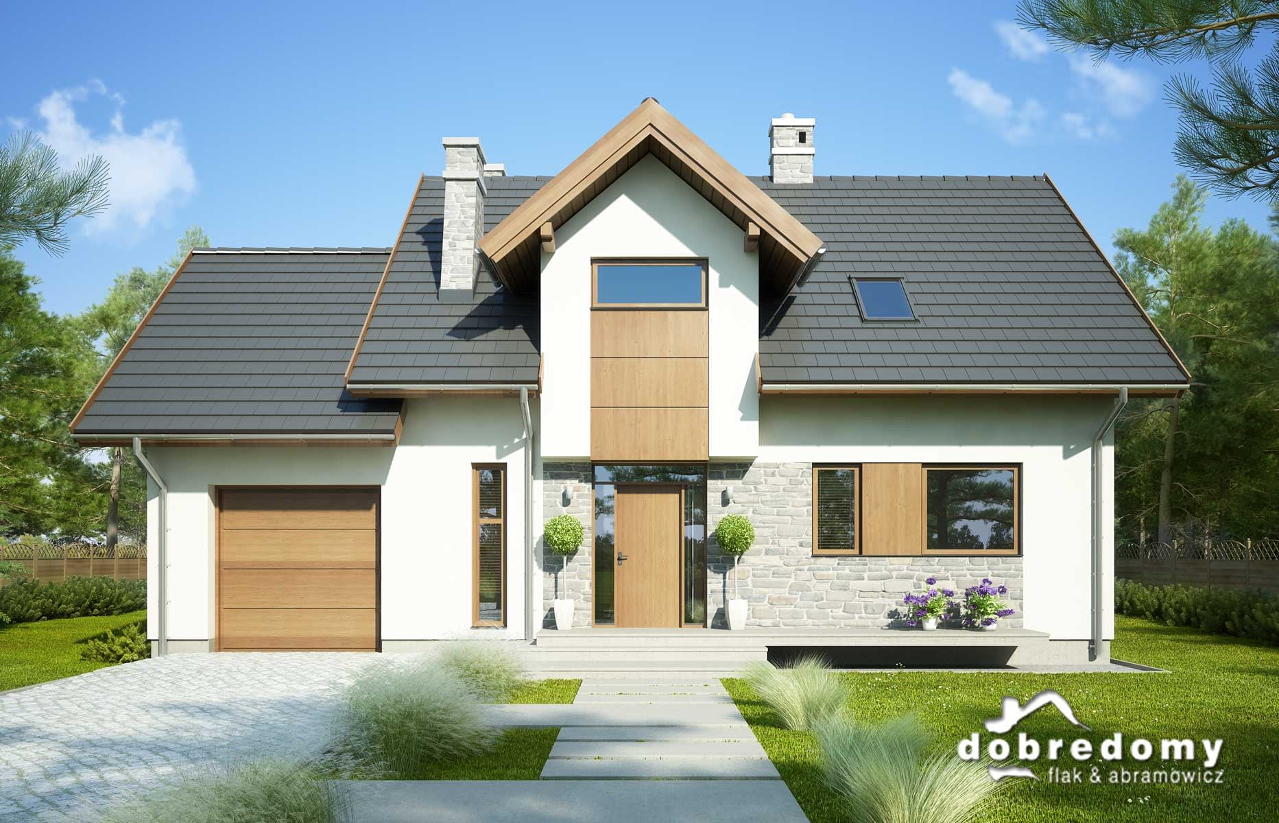 Elewacje pokryte tynkiem strukturalnym w systemie ociepleń Termo Organika, okładzina kamienną oraz okładziną drewnianą. W projekcie zastosowano okna dachowe marki FAKRO. Pokrycie dachu - dachówka ceramiczna lub cementowa CREATON.