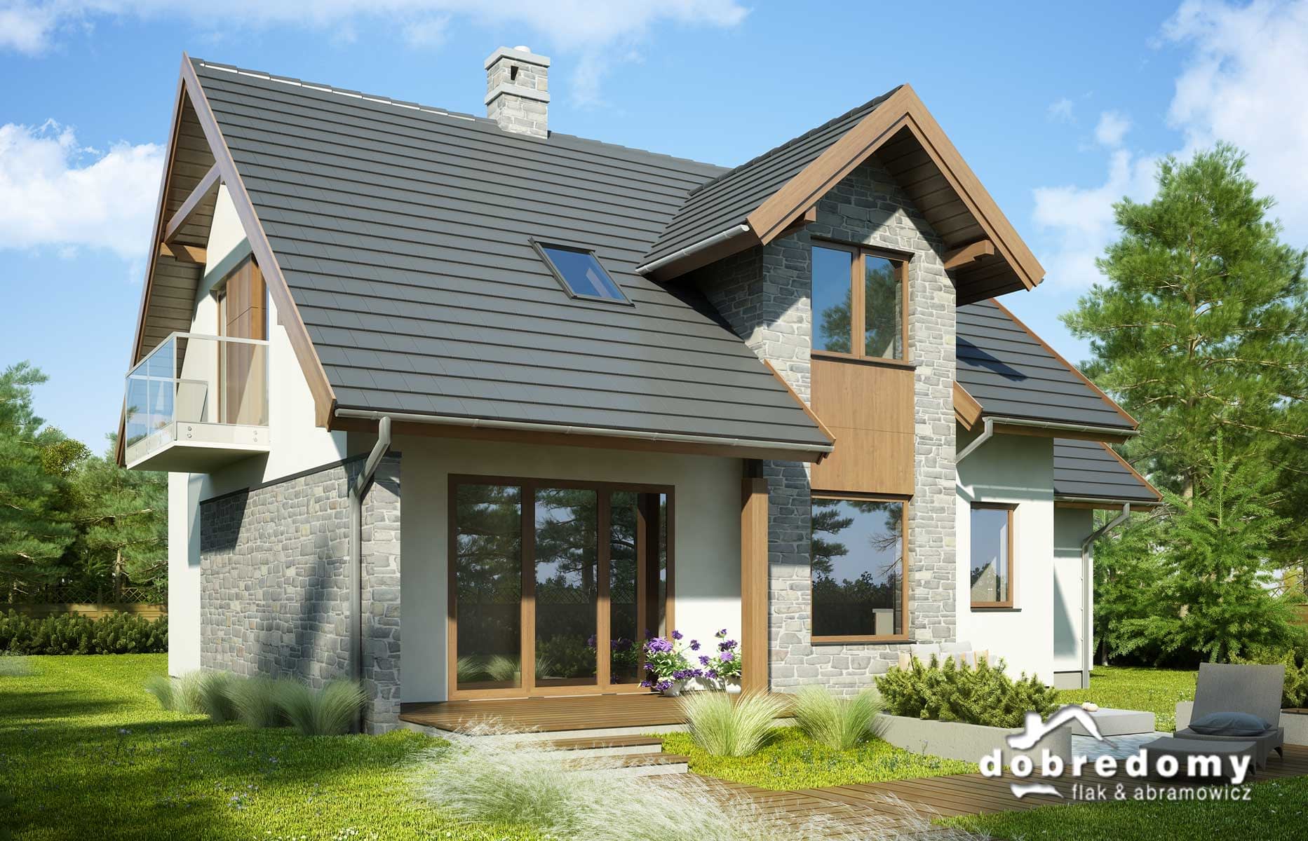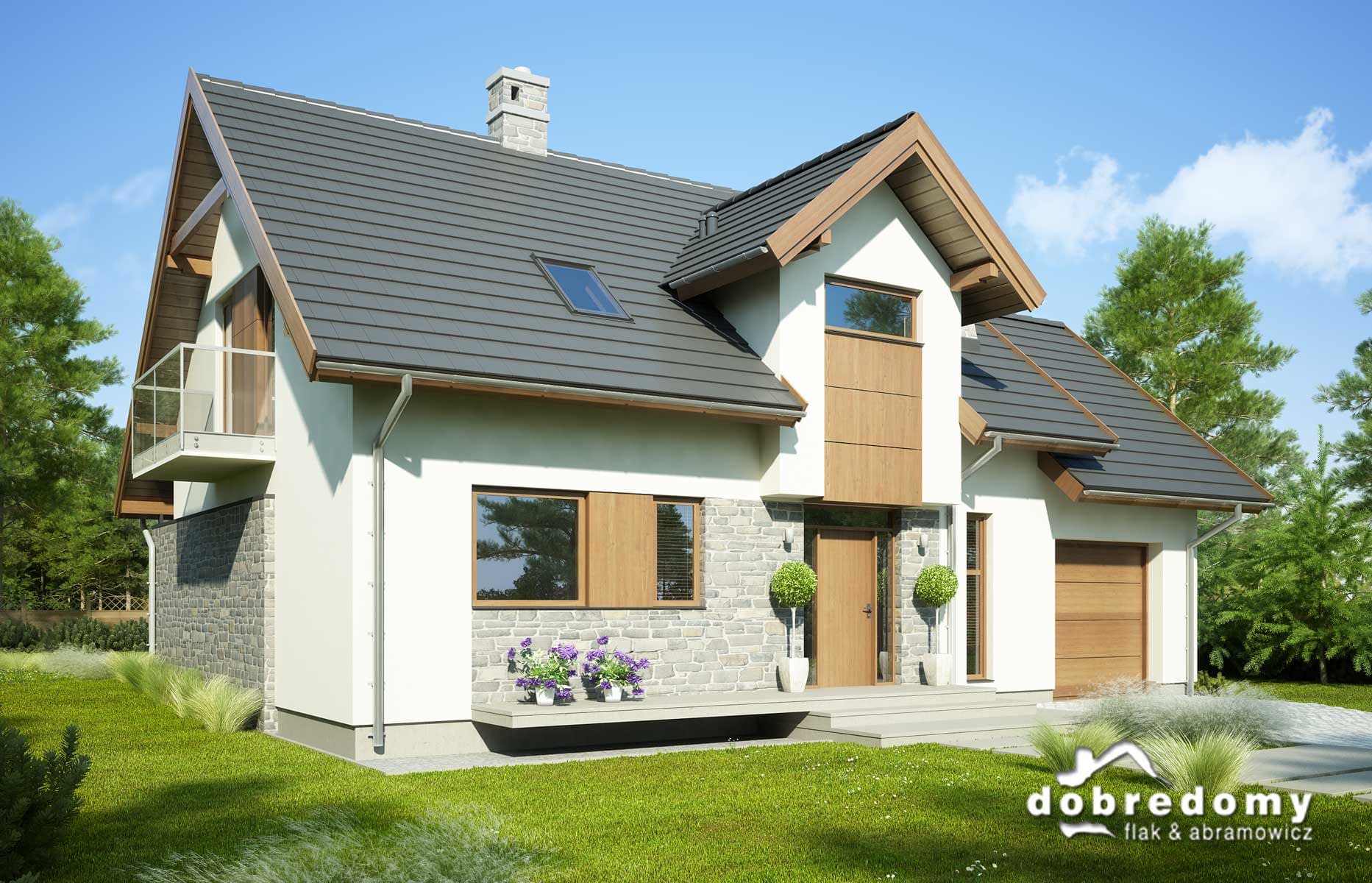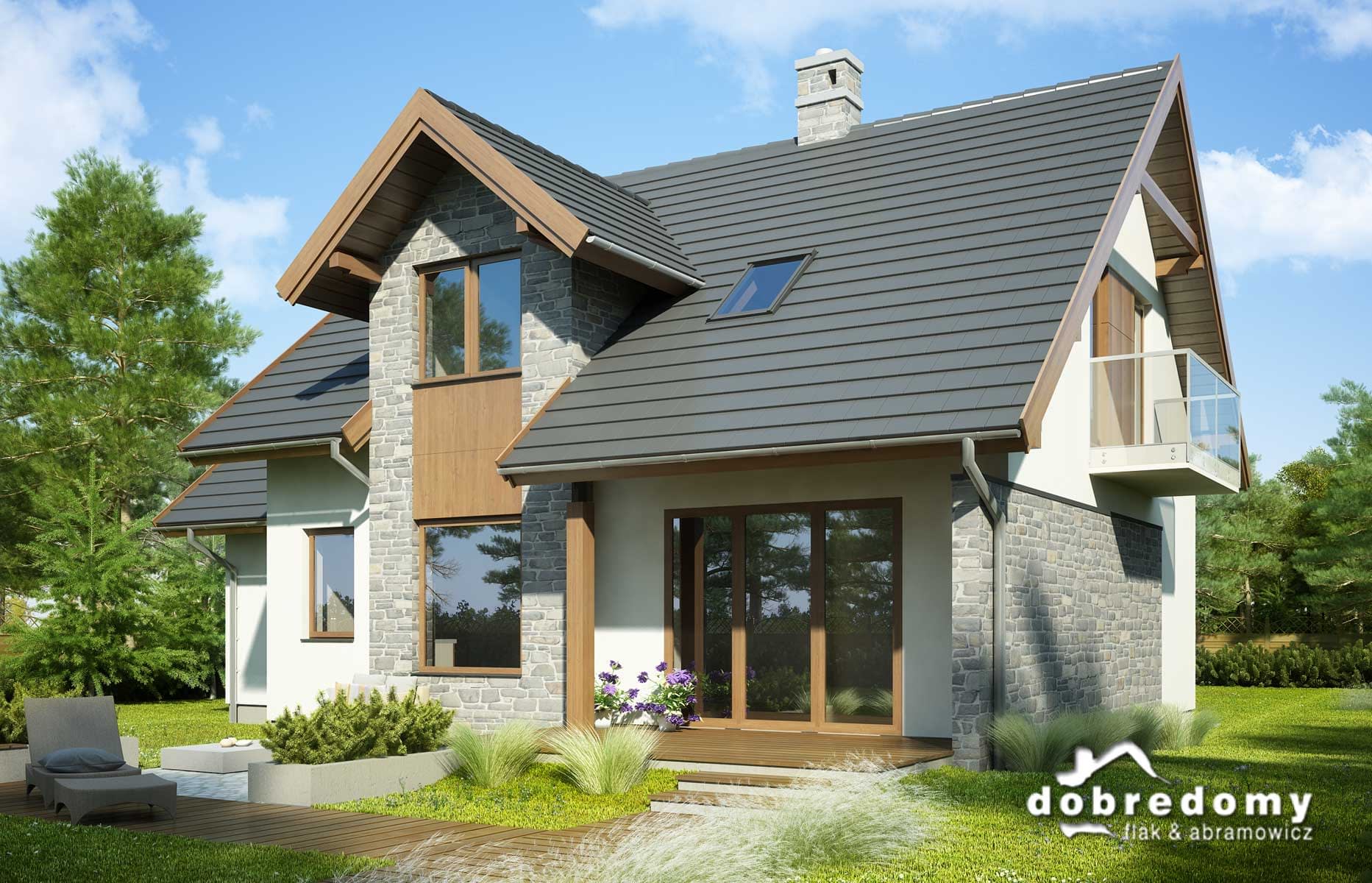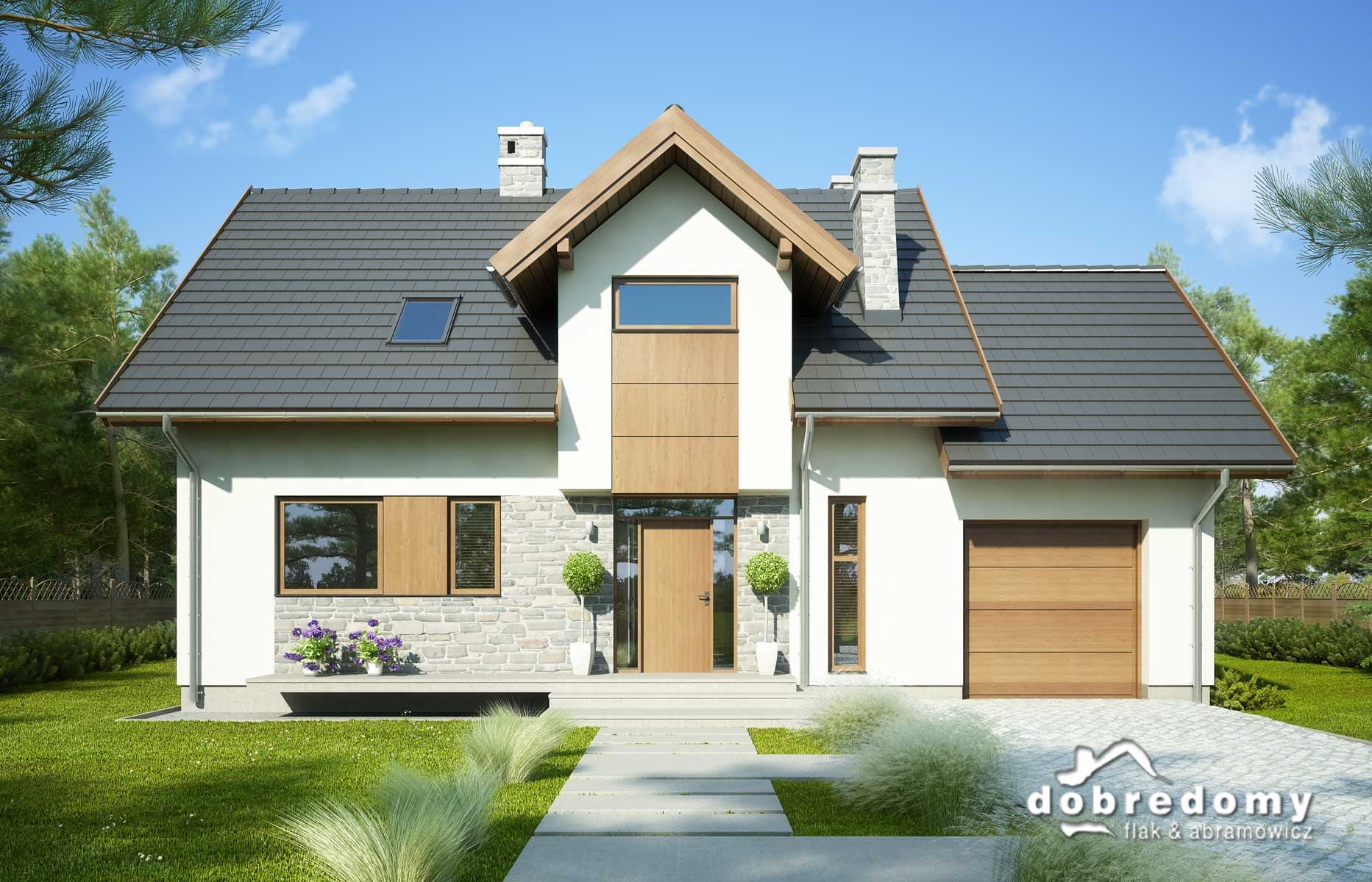 Elewacje pokryte tynkiem strukturalnym w systemie ociepleń Termo Organika, okładzina kamienną oraz okładziną drewnianą. W projekcie zastosowano okna dachowe marki FAKRO. Pokrycie dachu - dachówka ceramiczna lub cementowa CREATON.