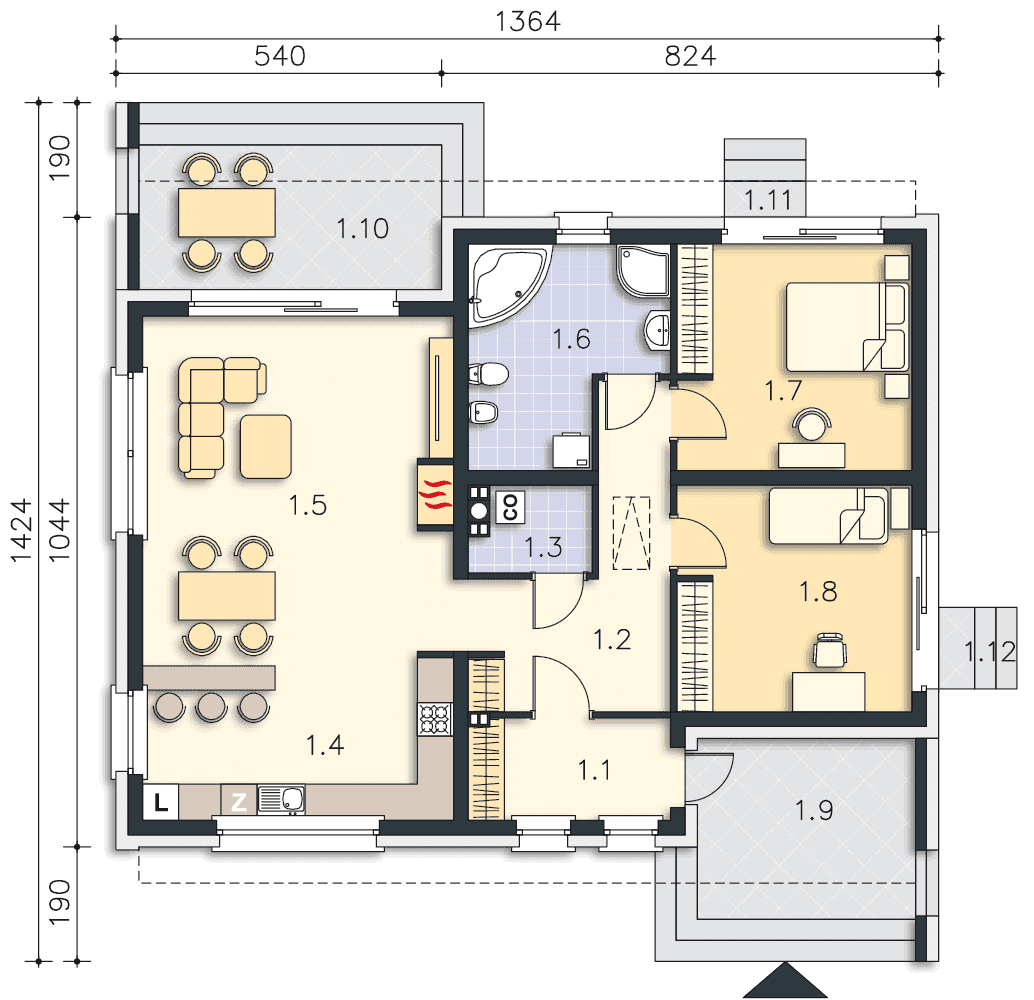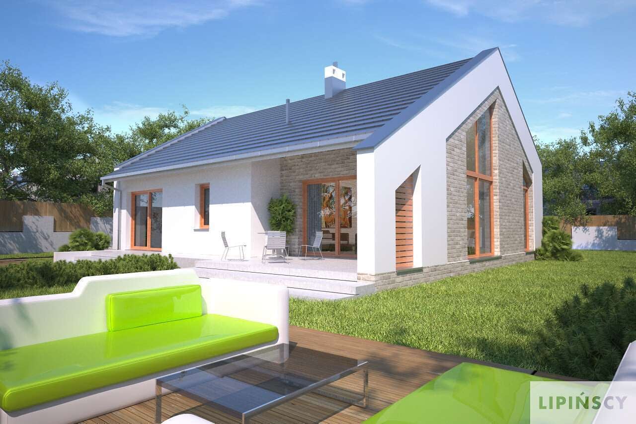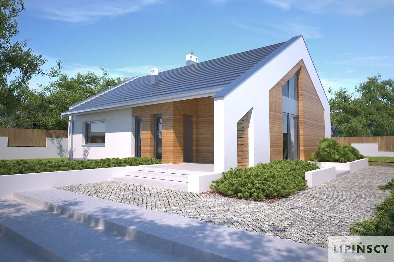 Dom parterowy, o zwracającej uwagę bryle – idealna propozycja dla inwestorów szukających swojego wygodnego, przytulnego, ale wyróżniającego się miejsca na ziemi. Do wnętrza zaprasza ciekawie zaaranżowana strefa wejściowa, zlokalizowana w niewielkim podcieniu, który chroni przed deszczem. W podobnym stylu zaprojektowano również taras od strony ogrodu, gdzie z przyjemnością można się zrelaksować. Centrum domu stanowi duży salon z kominkiem i otwarta na niego kuchnia. Strefę prywatną podzielono pomiędzy dwie wygodne sypialnie i komfortową łazienkę. W domu przewidziano także przydatne pomieszczenie gospodarcze, w którym znajduje się kocioł gazowy. Drewniane elementy elewacji ozdabiają bryłę i podkreślają jej charakterystyczne cechy.