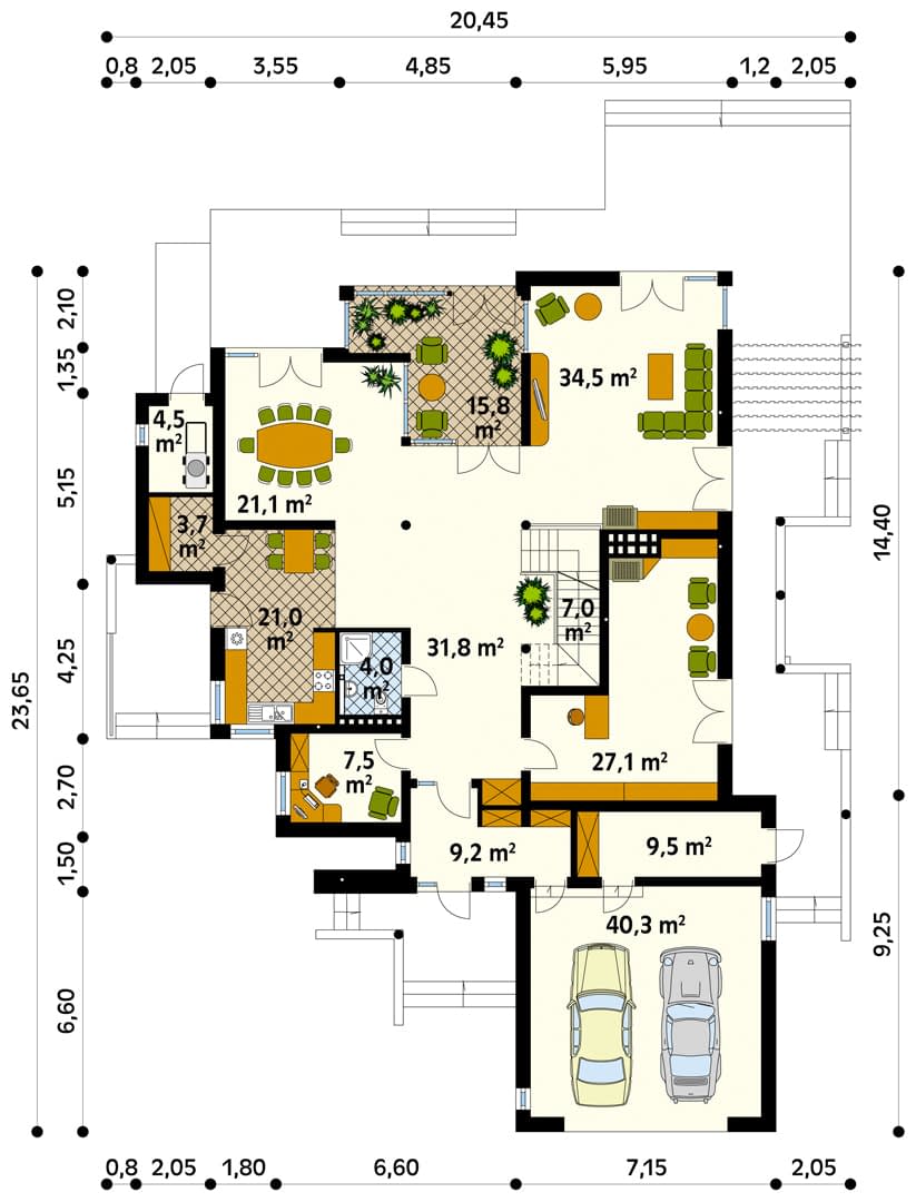 Dom jednorodzinny z piwnicą i dwustanowiskowym garażem przewidziany dla wieloosobowej rodziny. Nowoczesna bryła z płaskimi dachami. Na parterze zaprojektowano pokój dzienny, bibliotekę, kuchnię z jadalnią i spiżarnią, oranżerię i gabinet. Na piętrze znajdują się trzy sypialnie, trzy łazienki, pralnia oraz dwa obszerne tarasy i balkon.Konstrukcja