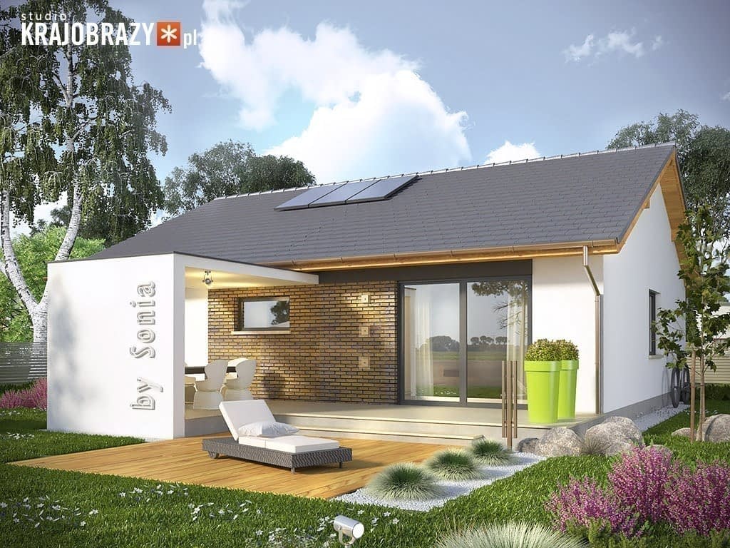 Fuksja to parterowy, nowoczesny dom jednorodzinny z dachem dwuspadowym. Ten prosty budynek posiada nowoczesną formę, uwagę przykuwa rama od strony ogrodu, tworząca częściowe zadaszenie nad tarasem. Biały tynk ładnie współgra z ciemniejszymi płytkami klinkierowymi oraz grafitowym tynkiem wyróżniającym strefę wejściową do budynku. Stolarka okienna również zaprojektowana została w kontrastowym, ciemnoszarym kolorze.Z wiatrołapu dostępne jest pomieszczenie gospodarcze, możemy również przejść do holu otwartego na przestronny salon. Tuż obok znajduje się kuchnia ze spiżarką. Pozostałe pomieszczenia to łazienka z wanną i prysznicem oraz 3 sypialnie. Projekt z grupy Projekty Domów Nowoczesnych. Zakupić go można w wersji standard lub lustro.Rzuty