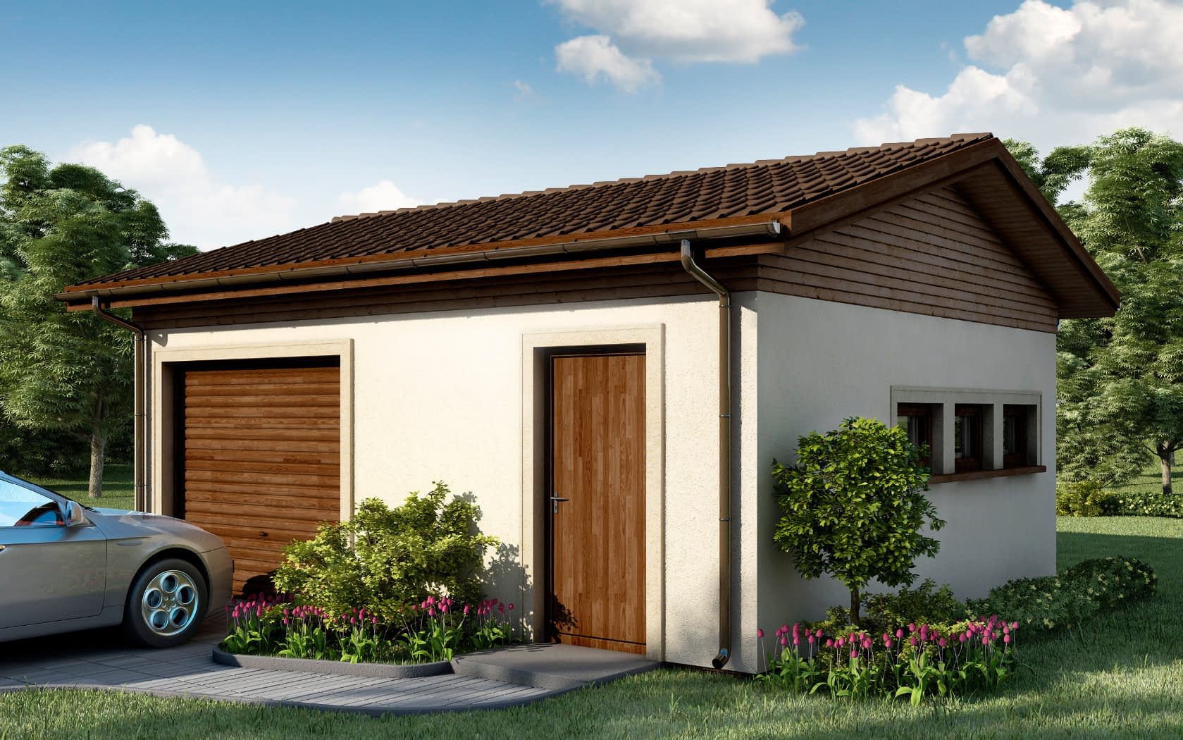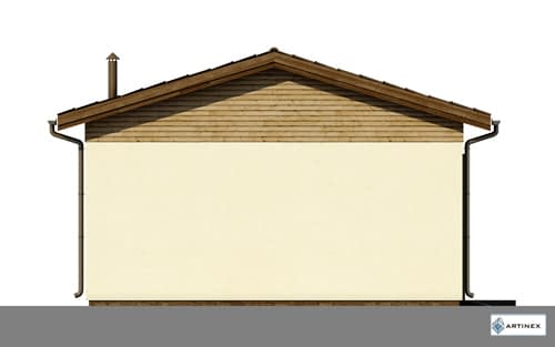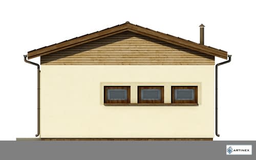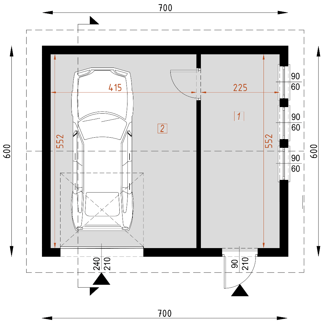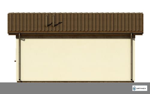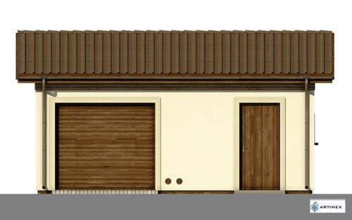 Garaż samochodowy z pomieszczeniem technicznym, w technologii murowanej. Układ funkcjonalny: Pomieszczenie garażu z bramą wjazdową w szczycie połączone przejściem z pomieszczeniem technicznym. Dodatkowo drzwi wejściowe do pomieszczenia technicznego.Konstrukcja